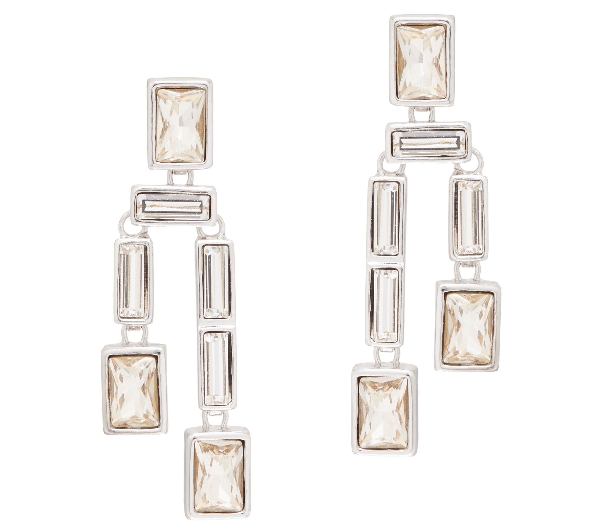 • Various bezel-set and horizontal with vertical simulated diamond baguettes that dangle below; asymmetrical left and right design