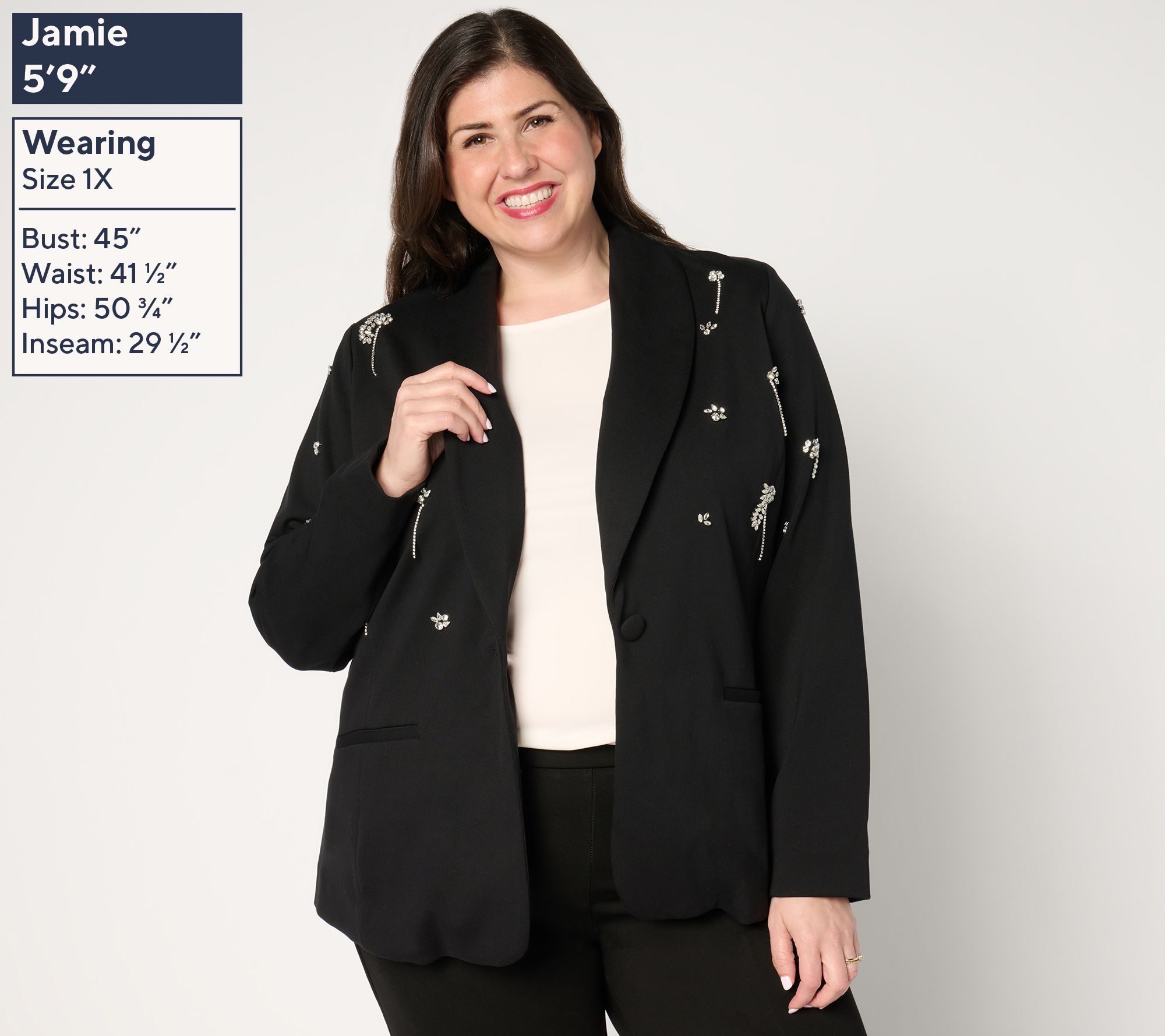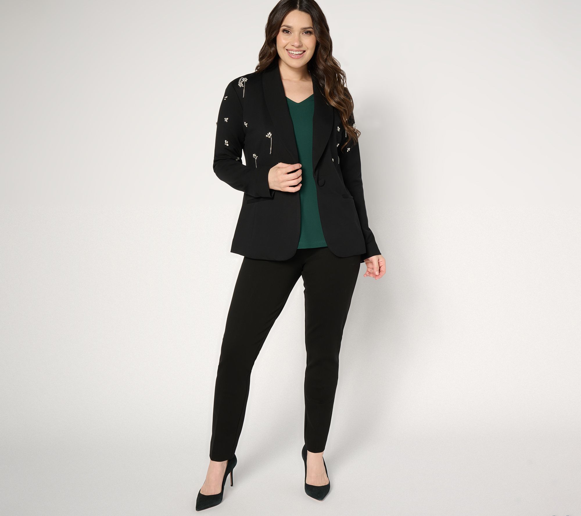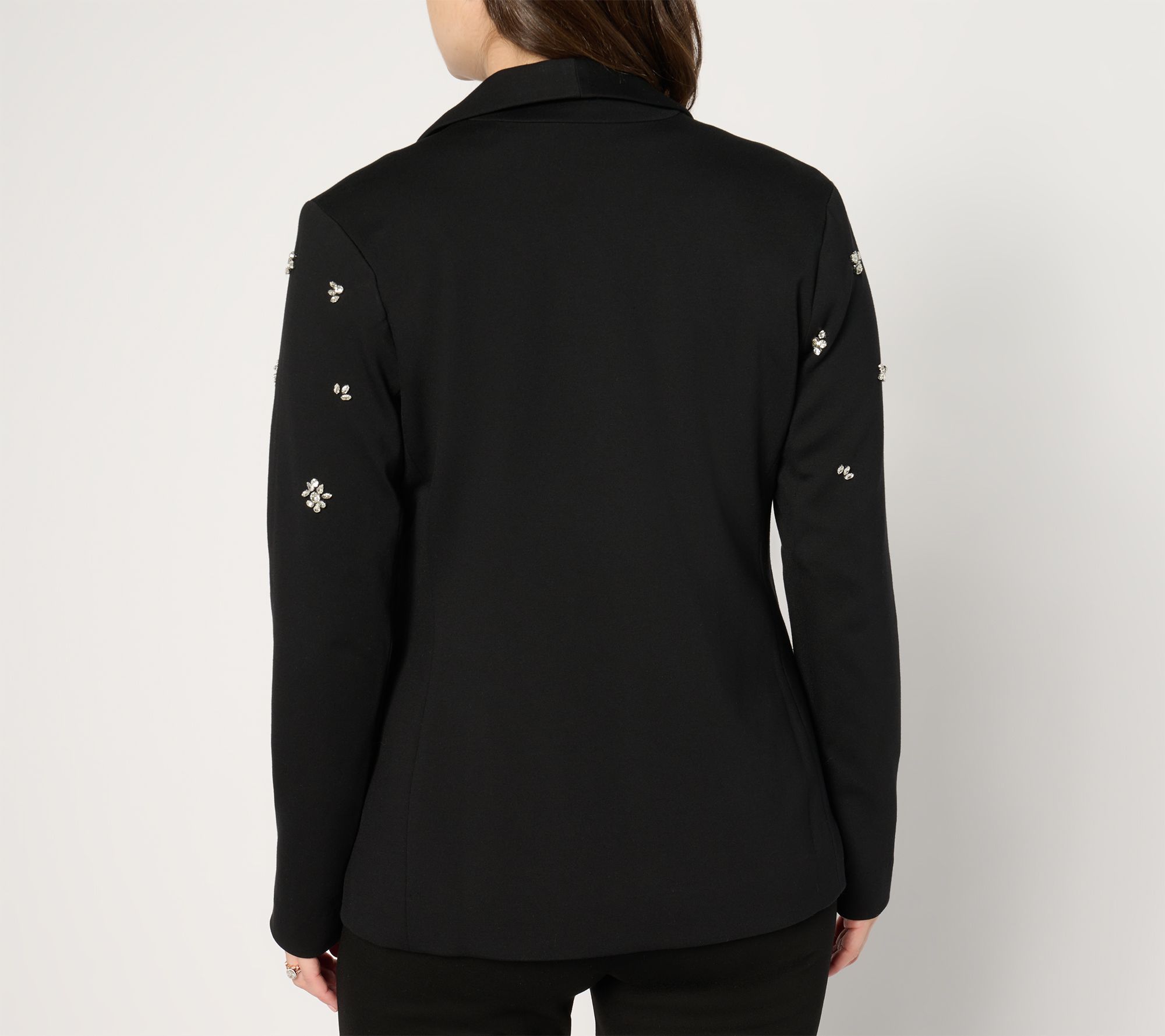 Ready to elevate your blazer game? This embellished shawl collar blazer in stretch ponte is edgy and smart for office meetings, dinner dates, and everything in between. From Susan Graver.