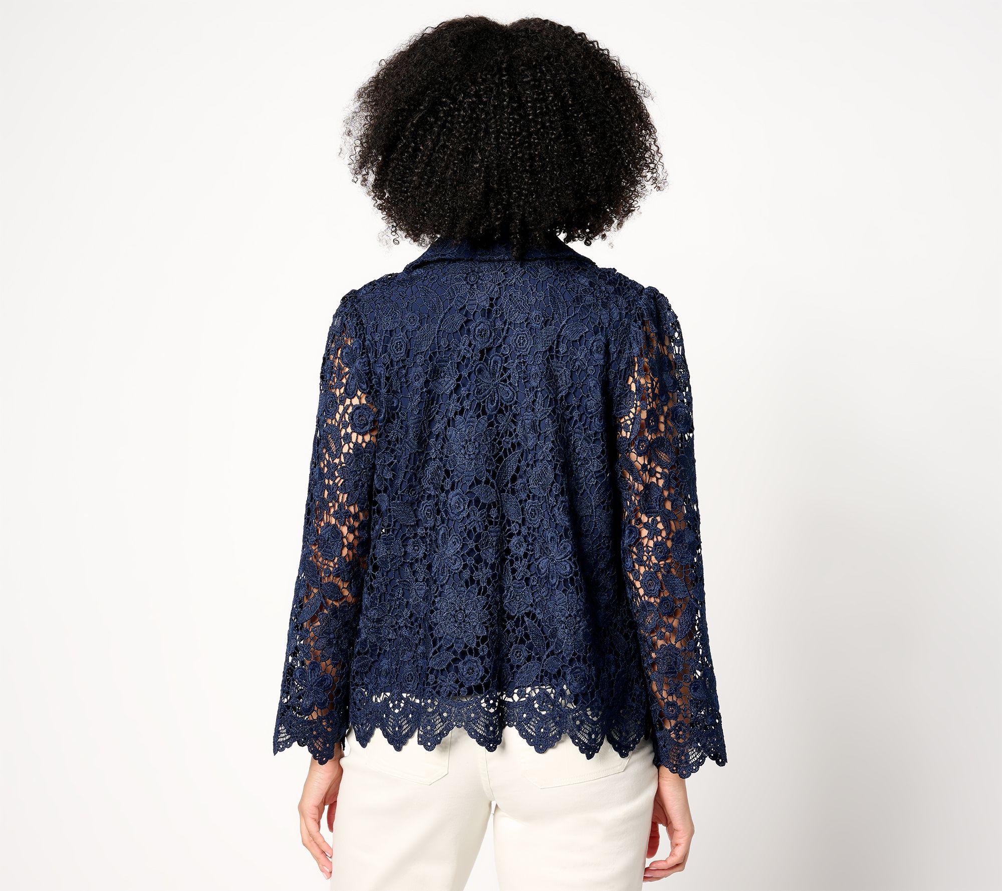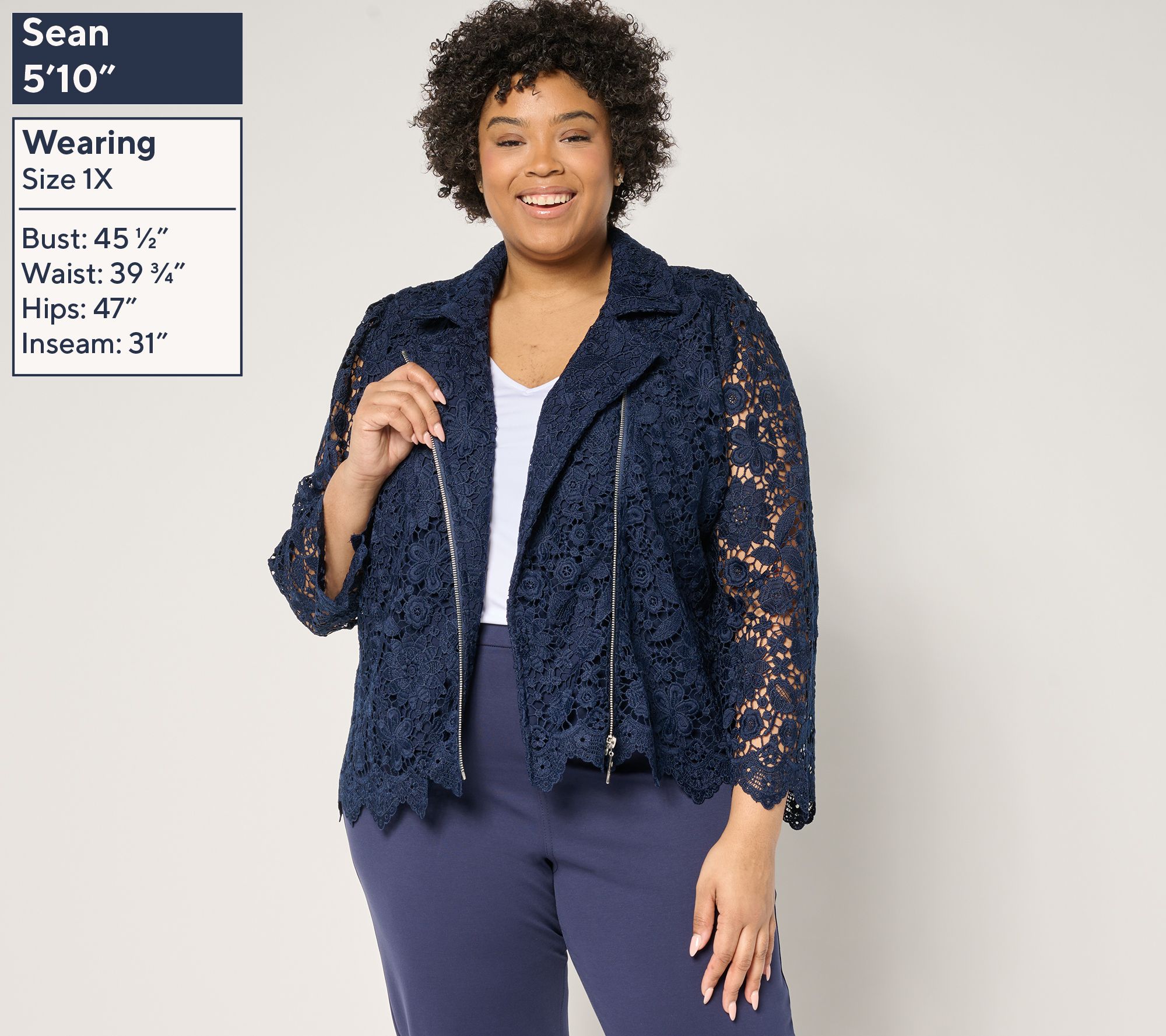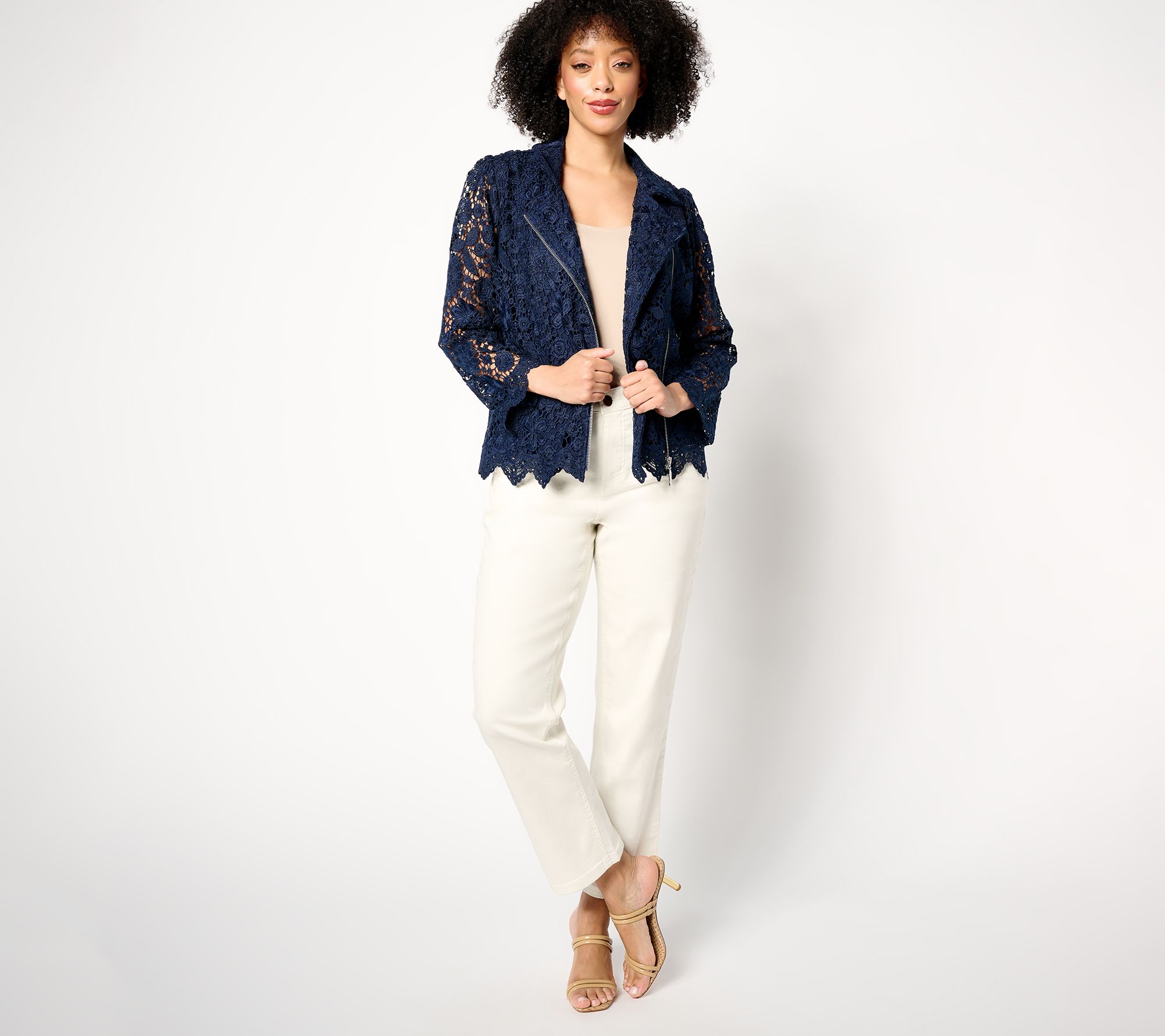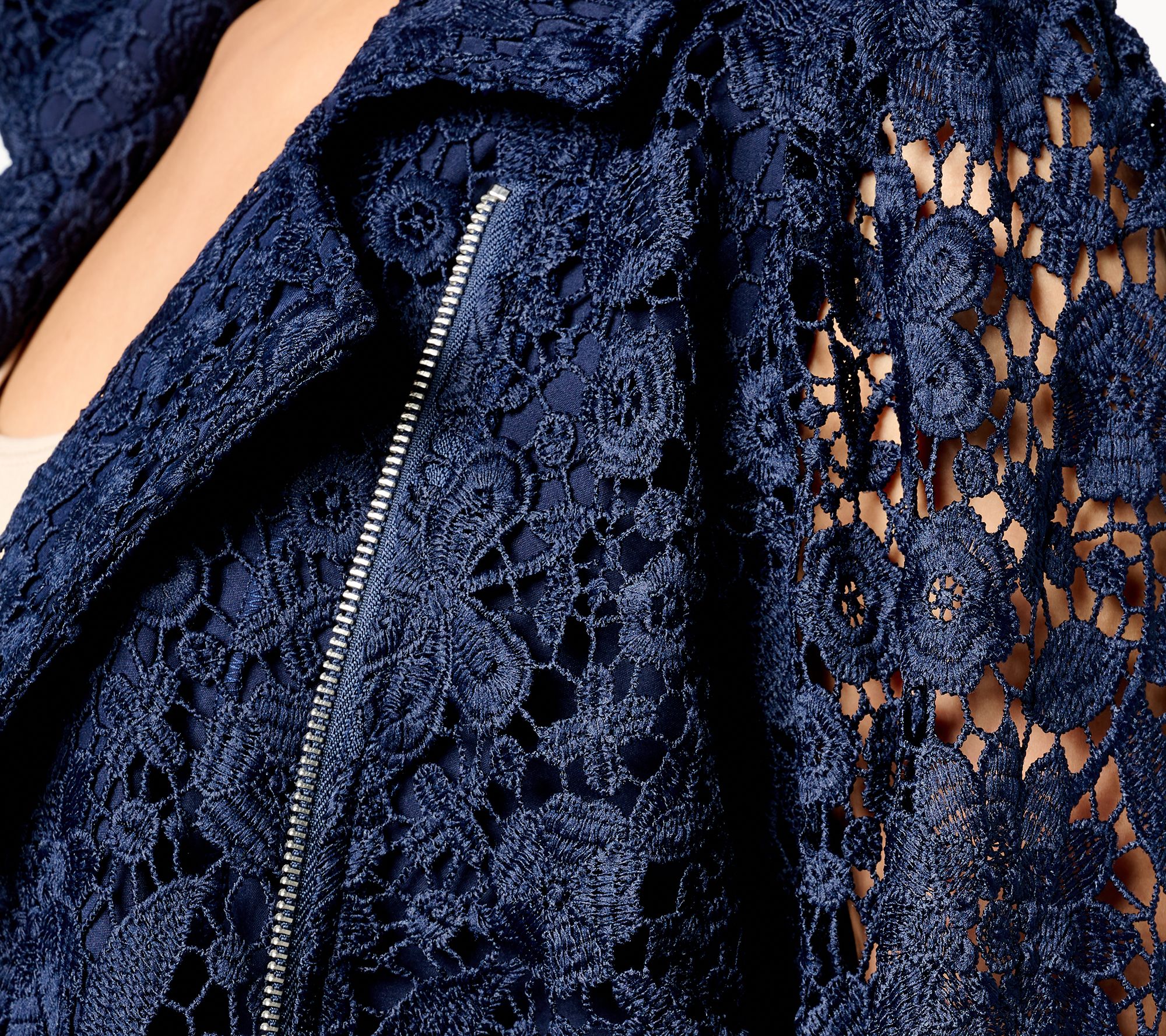 Rediscover your edge -- and compliments galore -- in this lacy moto jacket you can layer over a dress (for your niece's wedding, a cruise dinner, or your BFF's birthday celebration), a simple jeans-and-tank outfit, or a polished pair of trousers and a silky blouse. From Susan Graver.