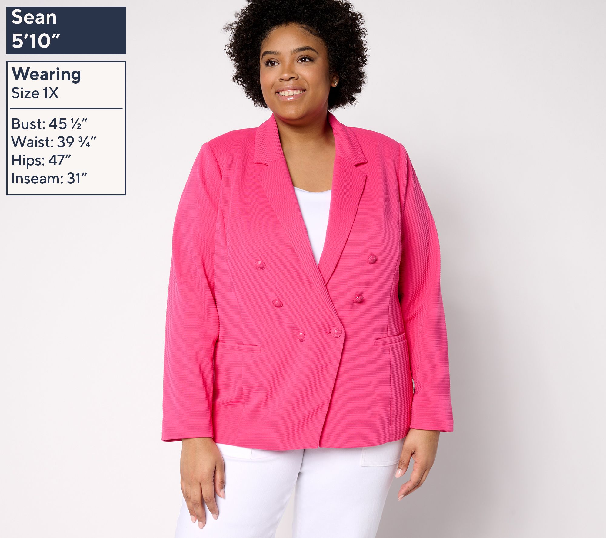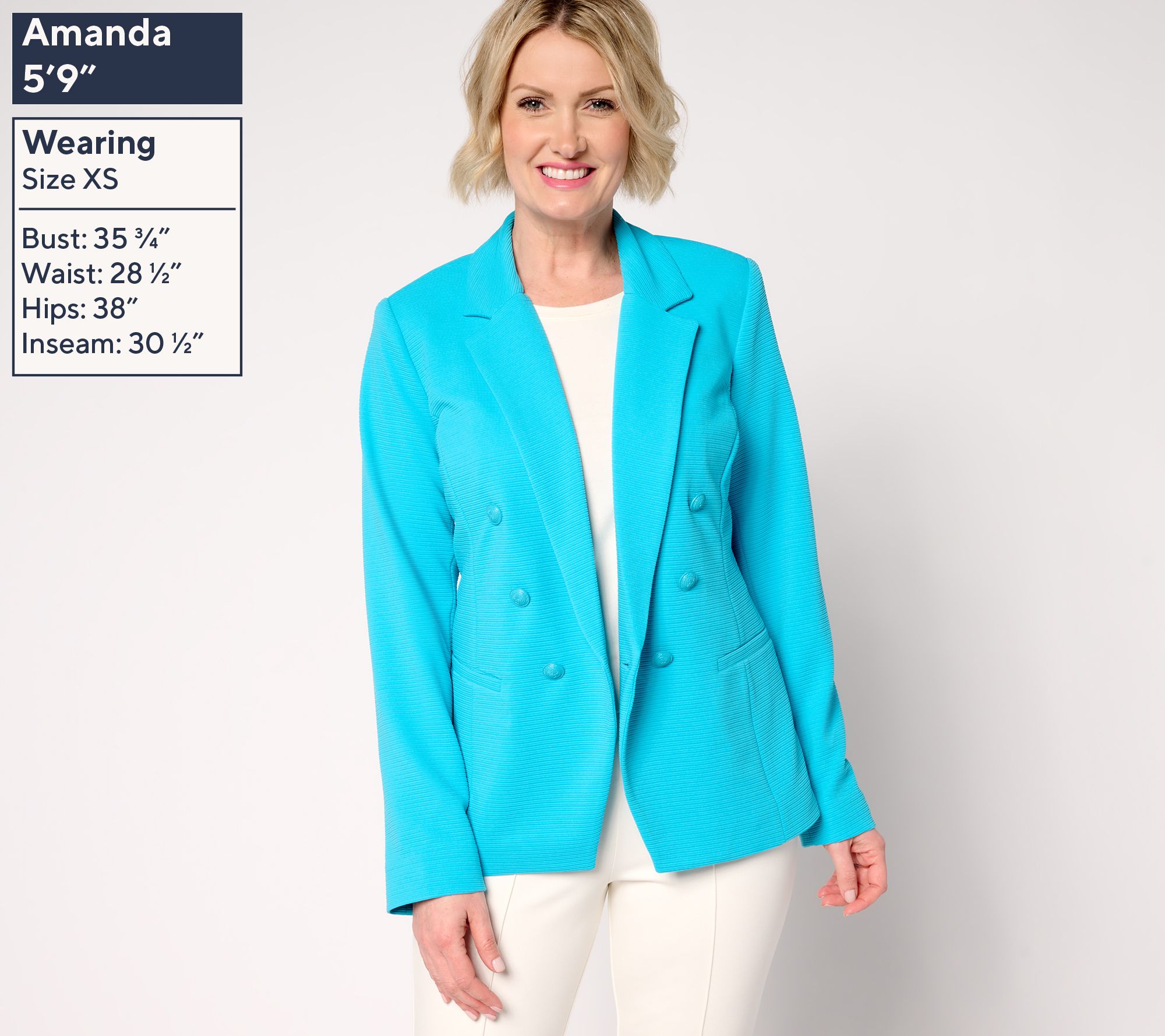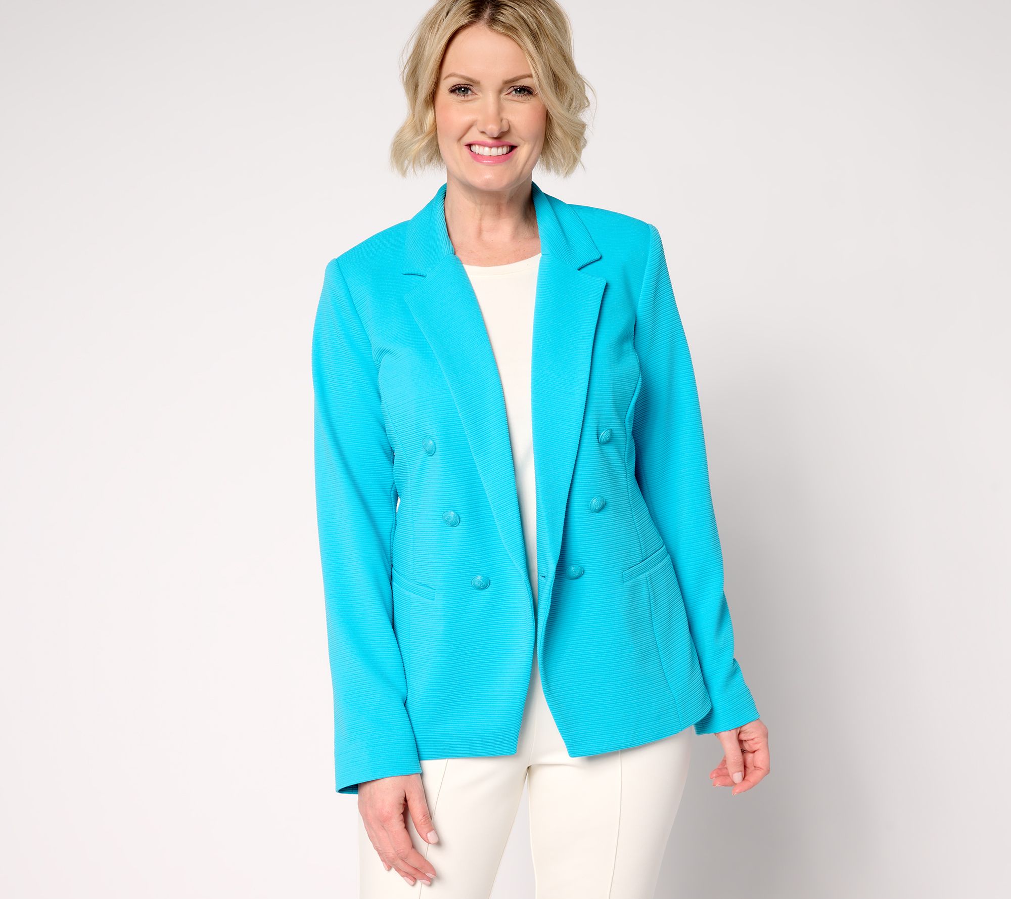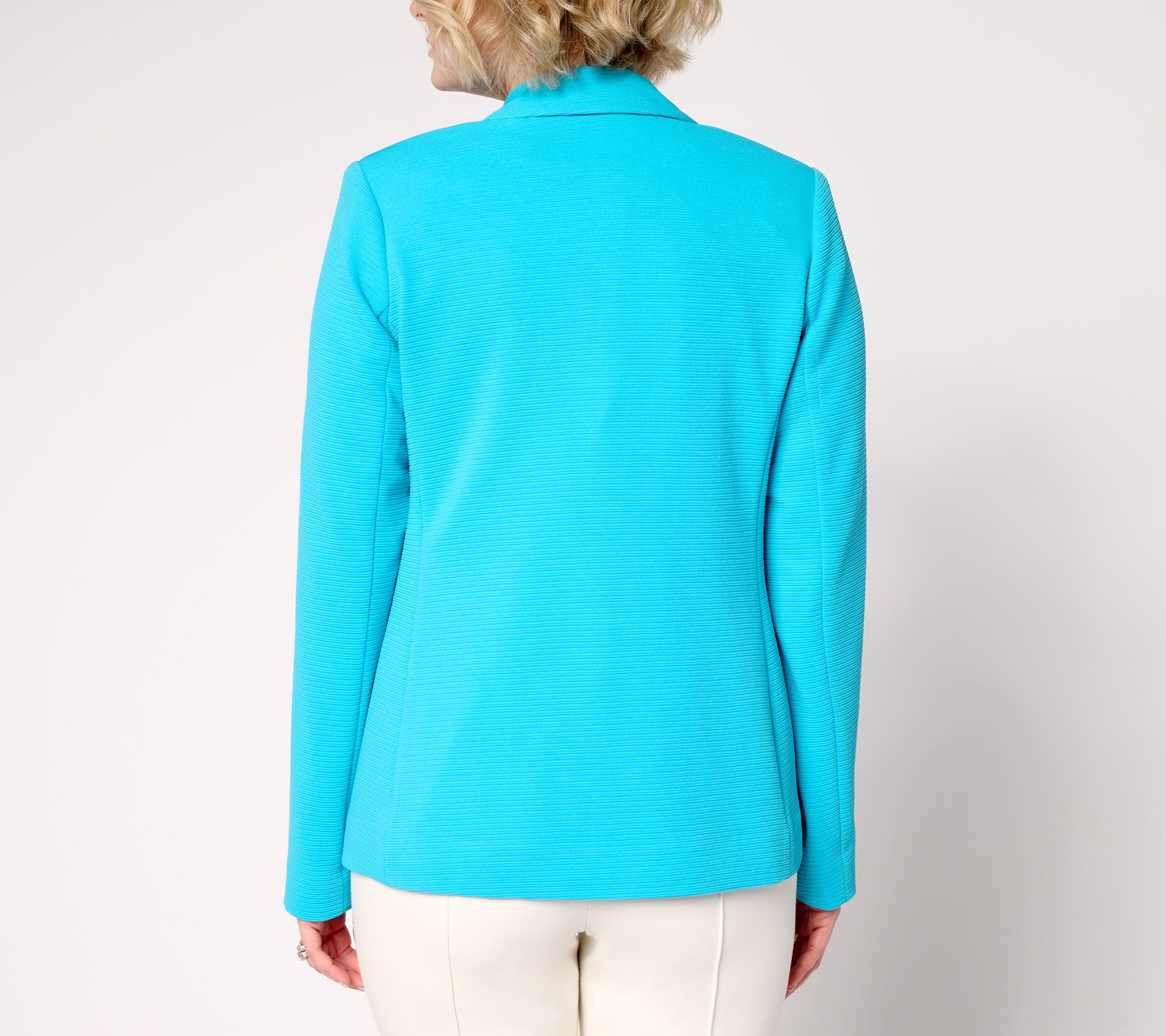 Incoming: a stylish layer to up your blazer game. Fashioned with the look of a double-breasted design, this cutaway blazer from Susan Graver stuns with statement-making style (minus the stuffy, structured look of years past). The slightly ribbed knit texture delivers all the comfort while the silhouette turns heads from every angle. From Susan Graver.