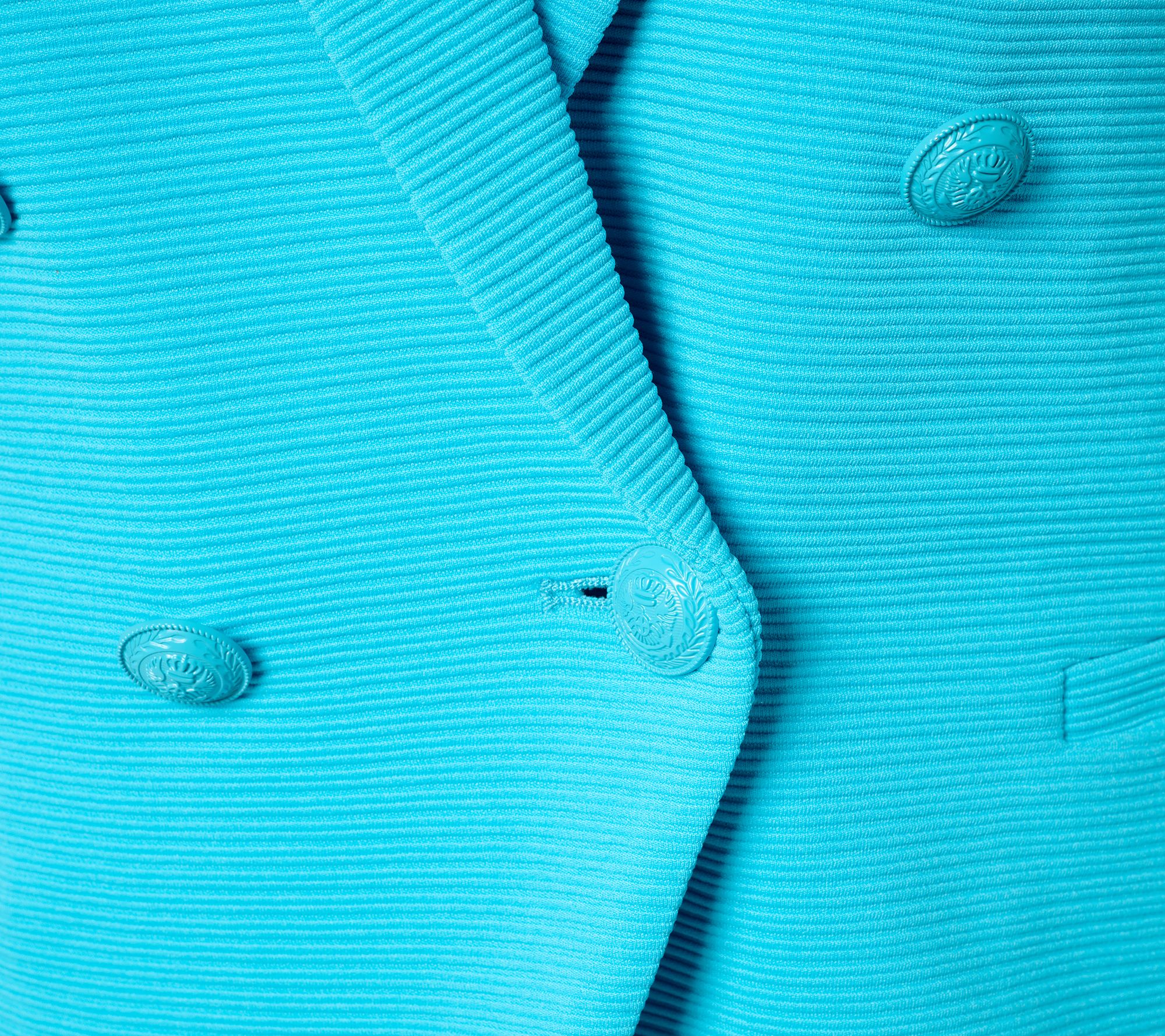 Features: double-breasted cutaway design, long sleeves, welt pockets, front and back princess seams