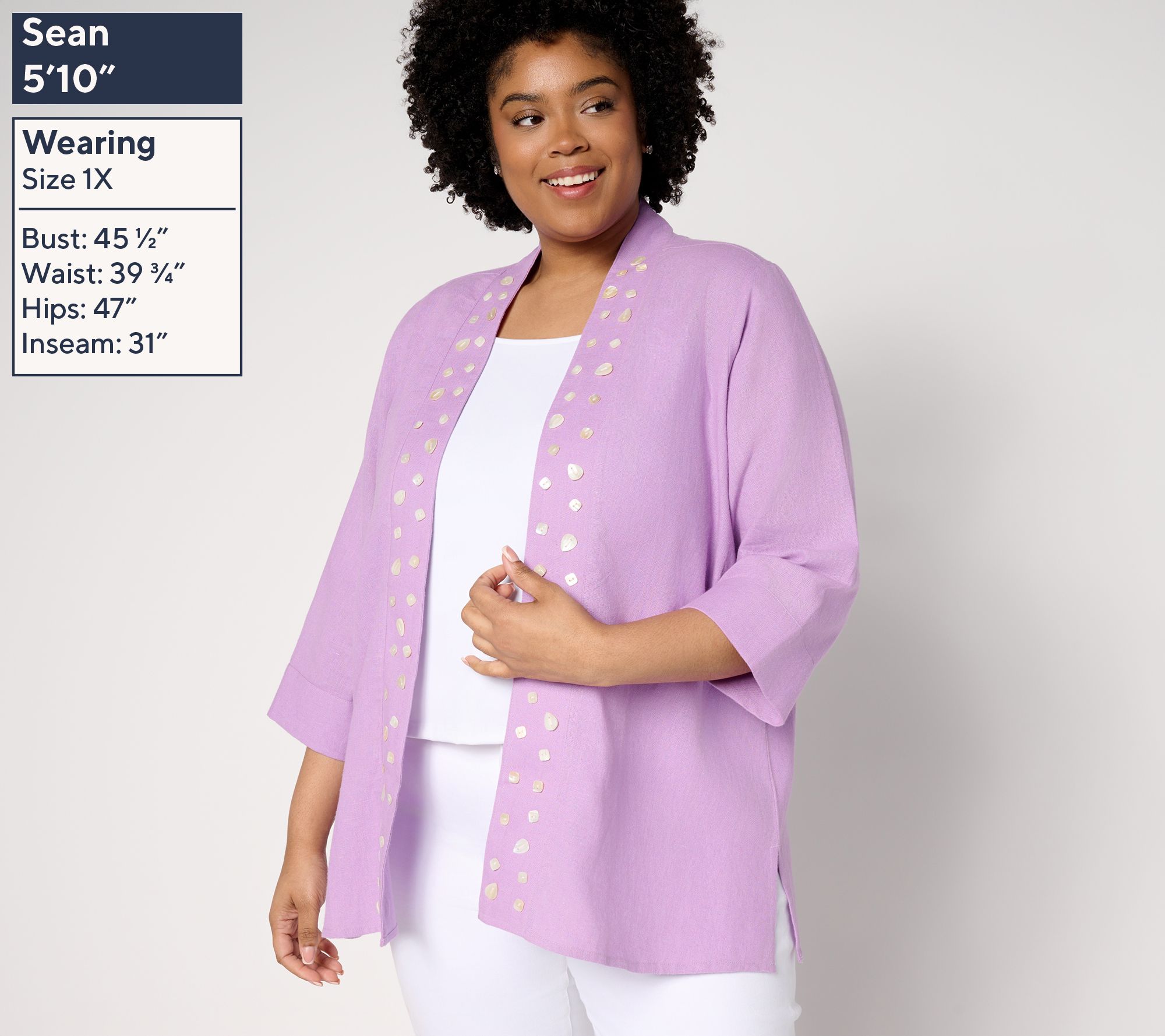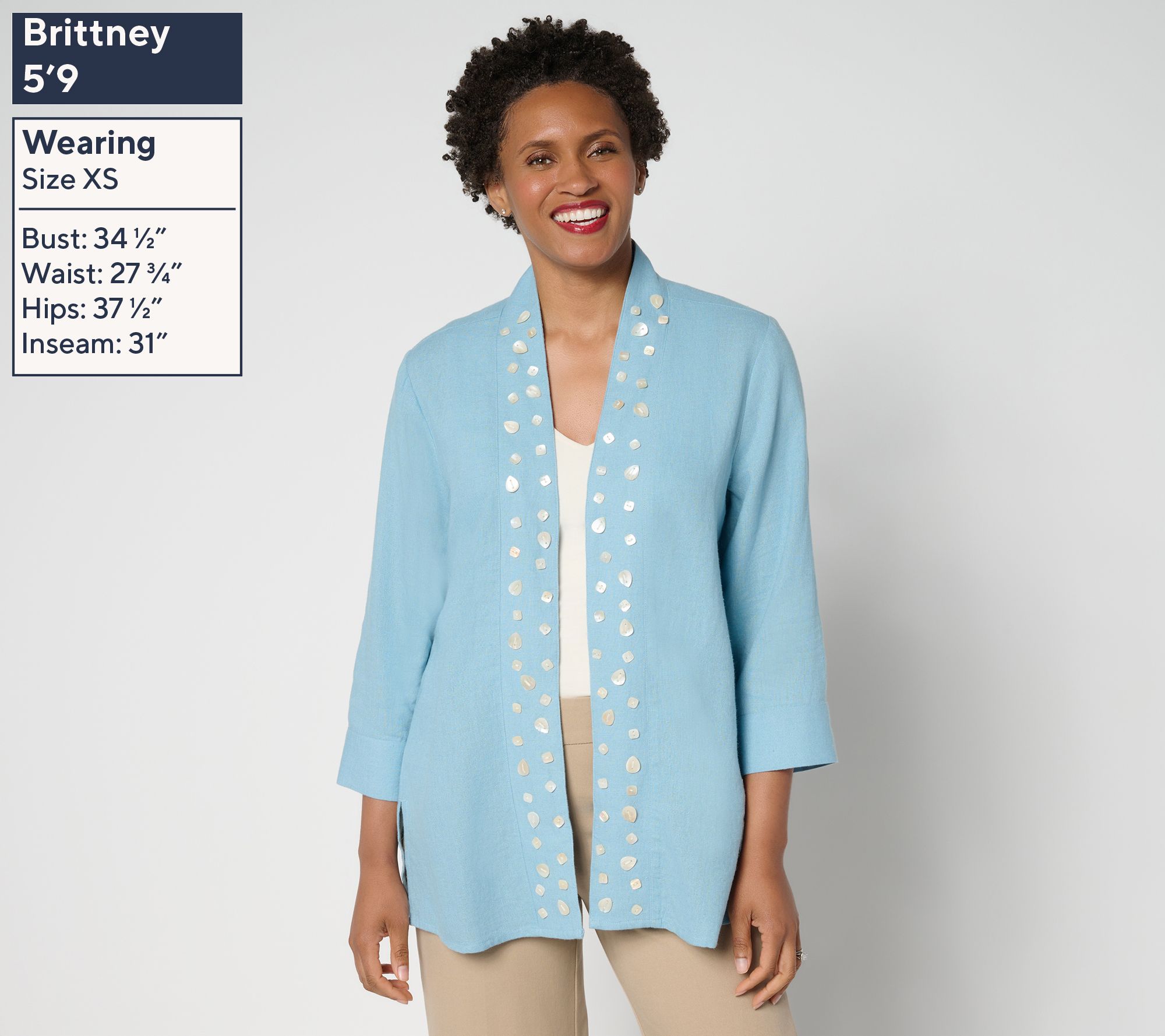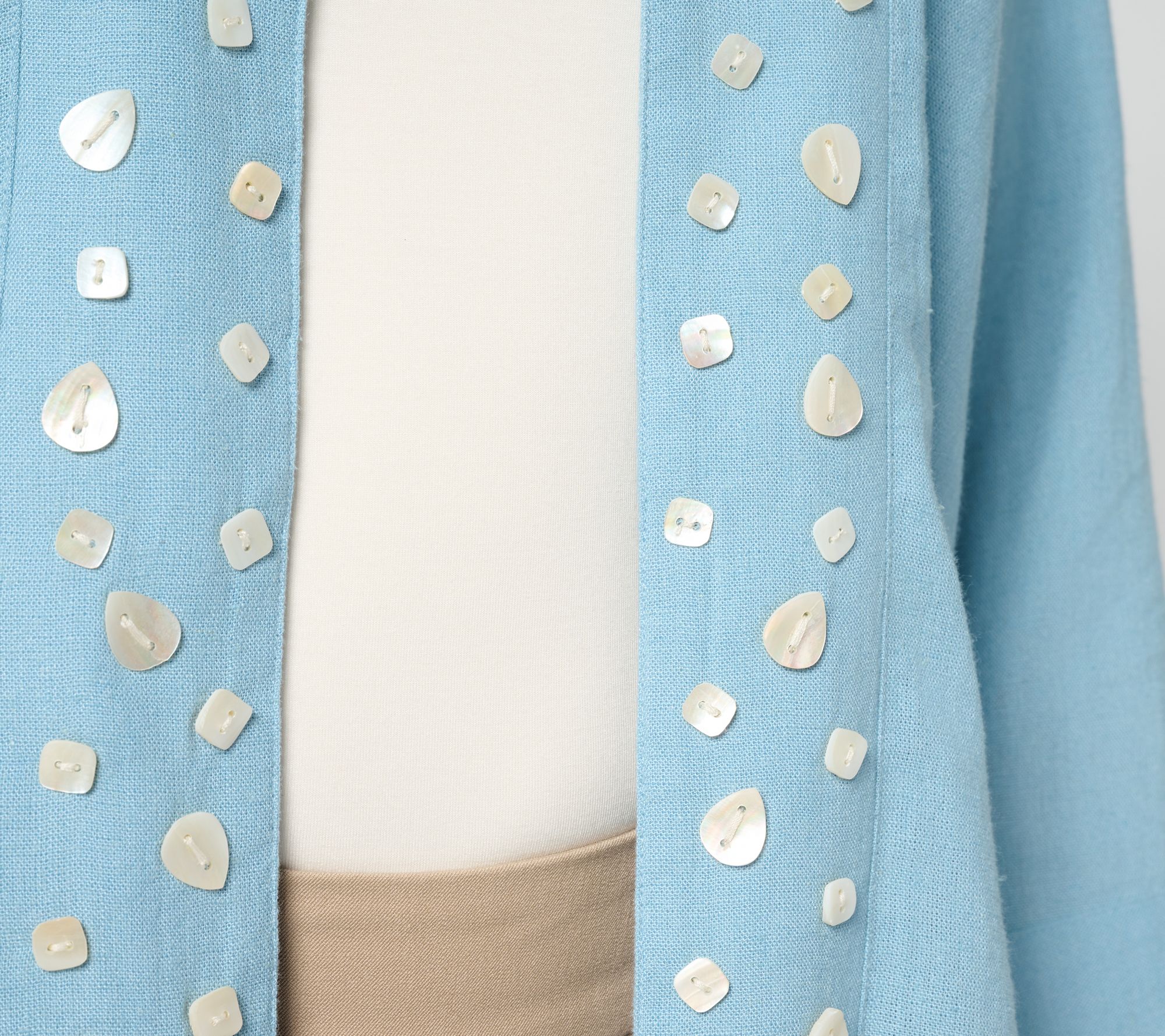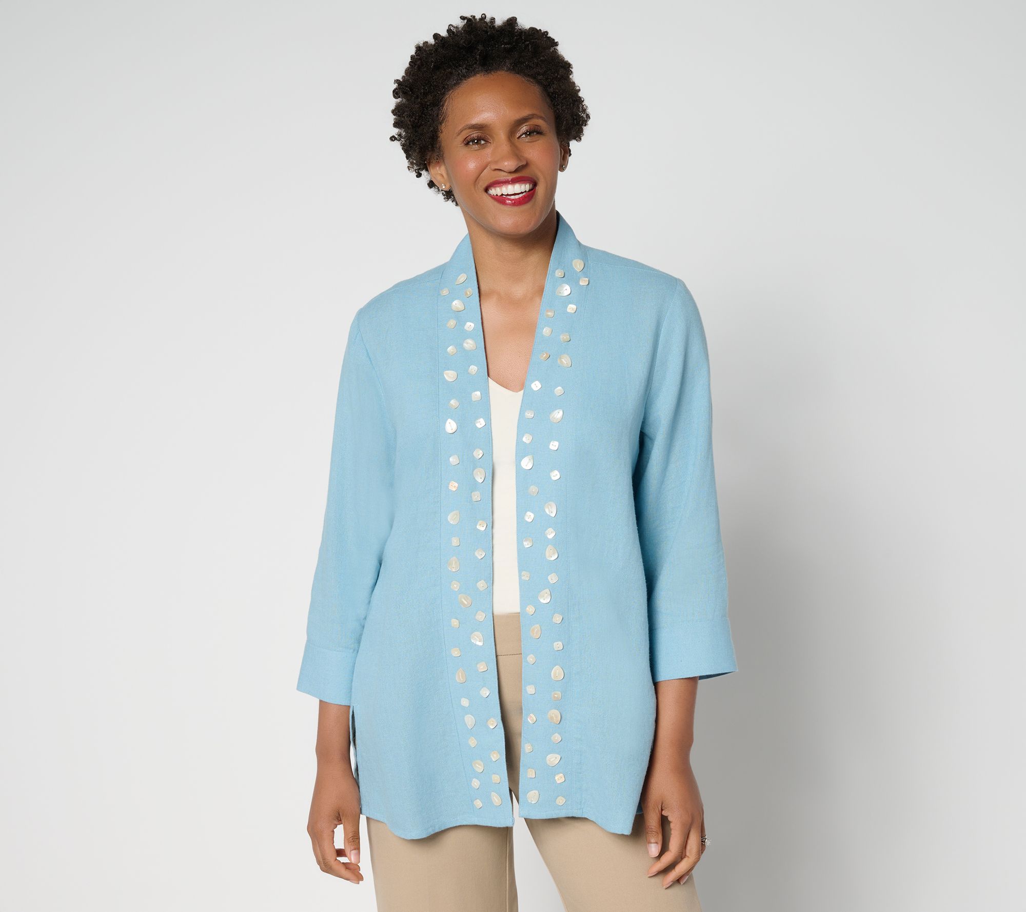 • Features: open front, shell embellishments, 3/4-length sleeves