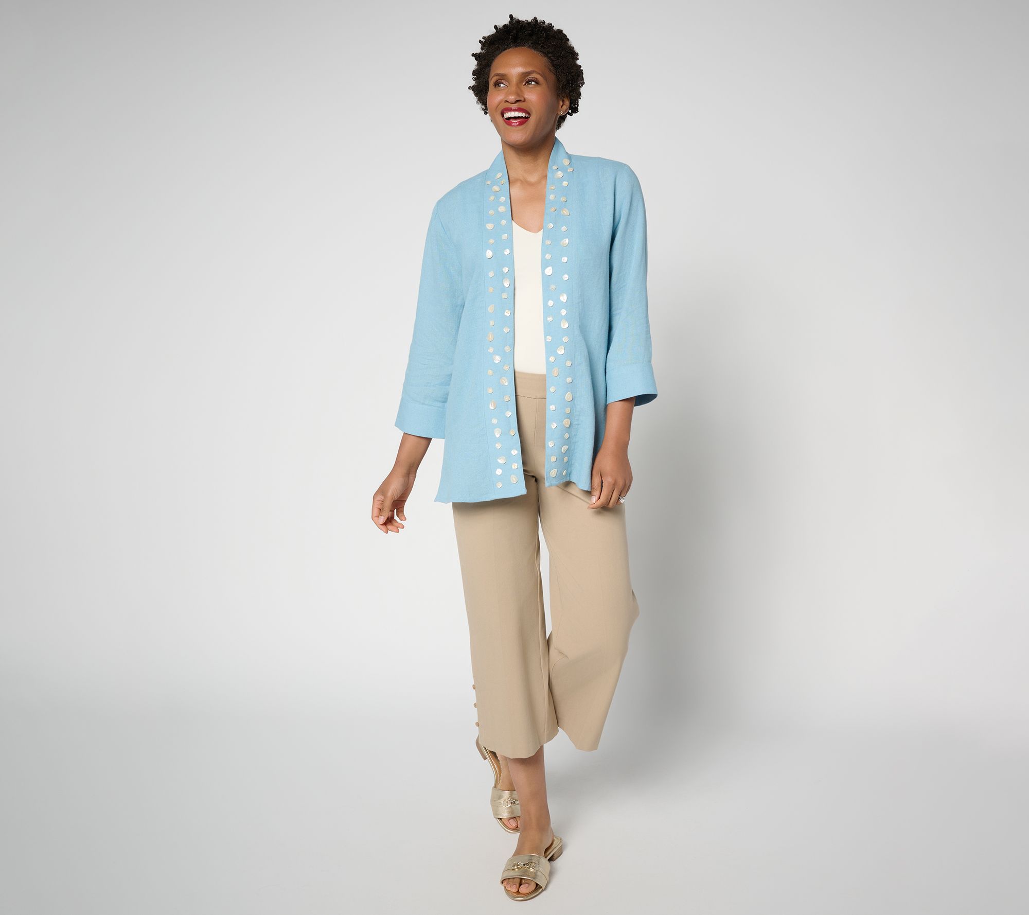 Being beach bound isn't always about wearing a swimsuit! For those evenings out by the water, you'll love having this linen-blend cardigan with lovely shell embroidery. From Susan Graver.