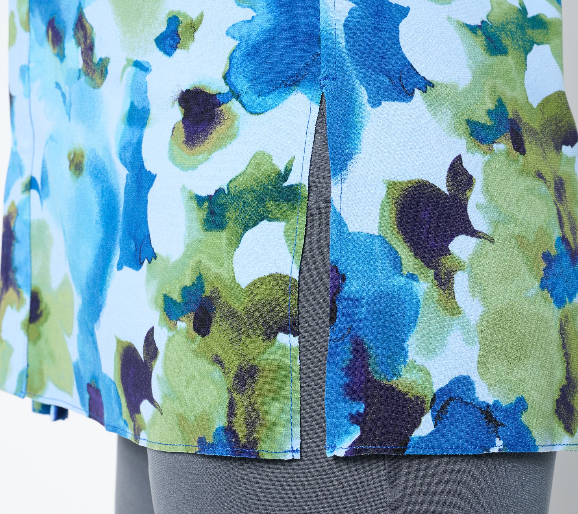 • Features: reversible design; one side printed and the other side solid color; open front with placket; side seam slits at straight hem