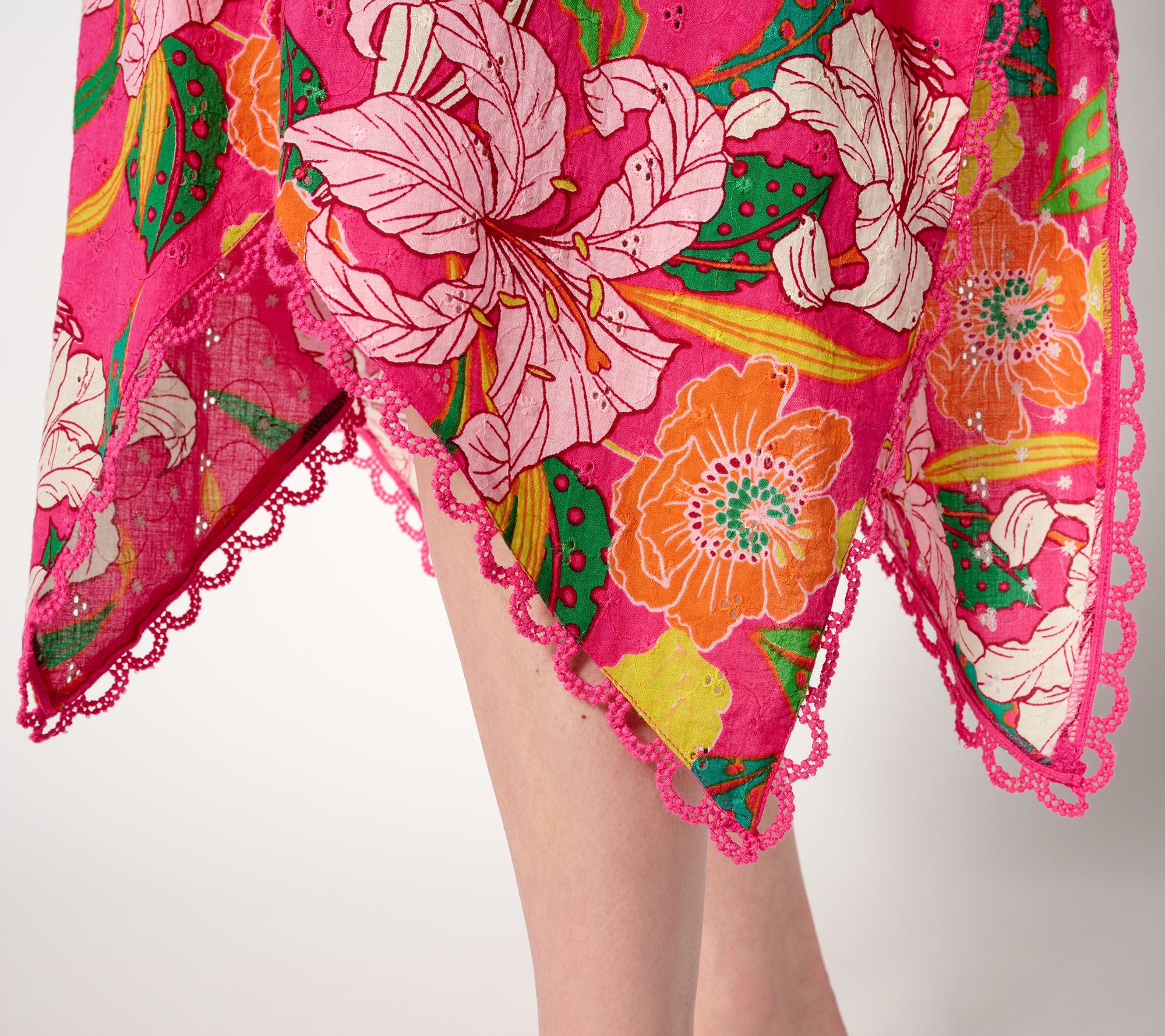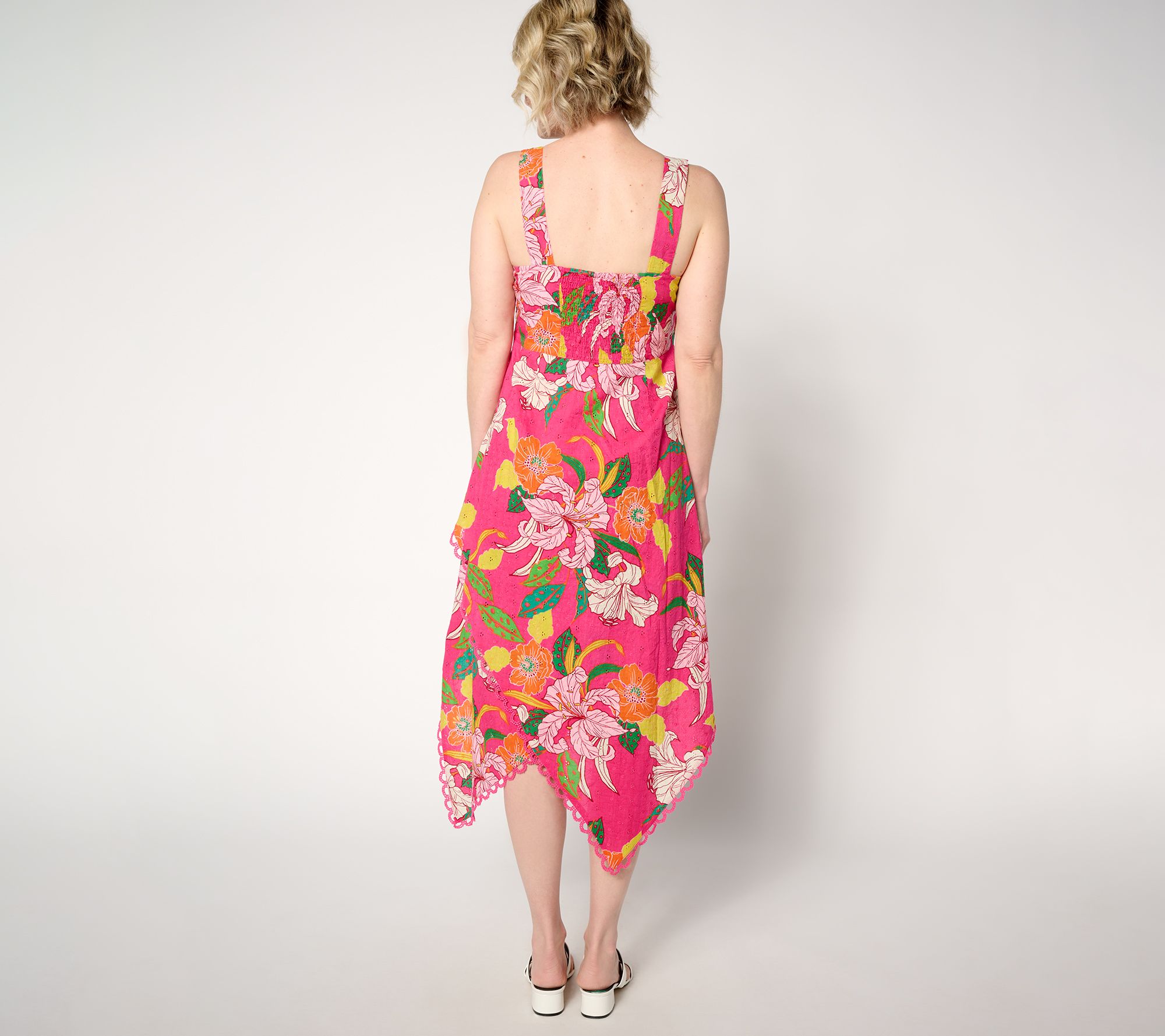 Embrace the summer sunshine in this sleeveless printed dress. With an asymmetric hem and eyelet detail, you'll feel flirty and feminine in this fashion-forward frock. From Susan Graver.