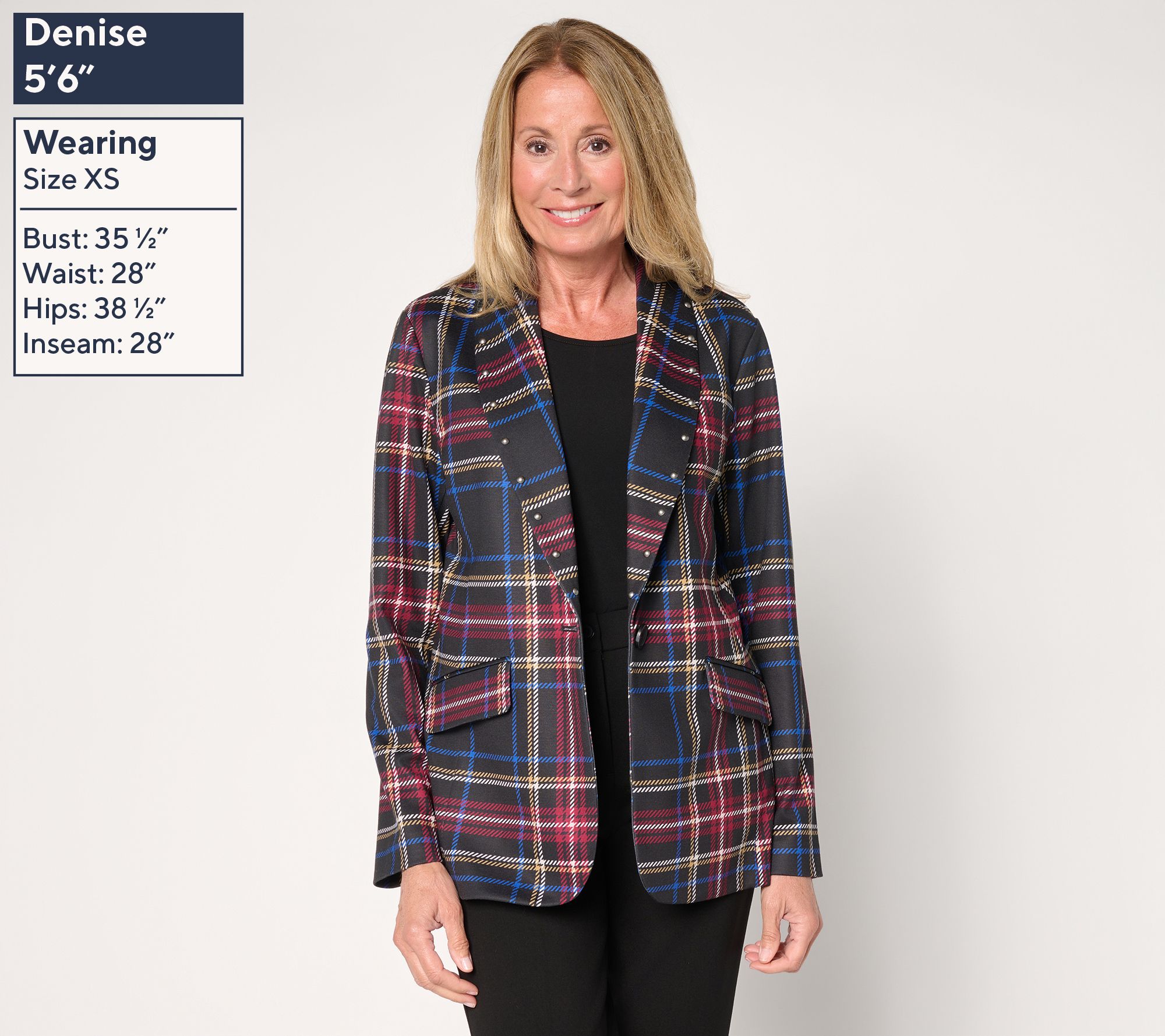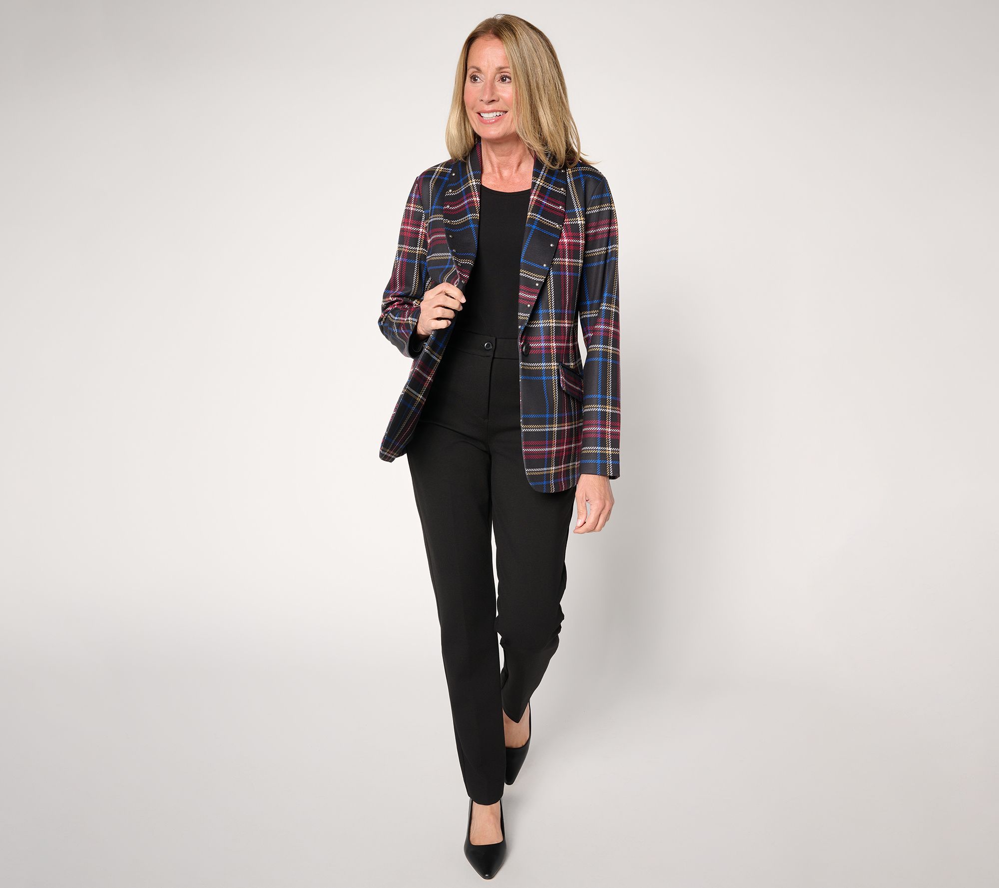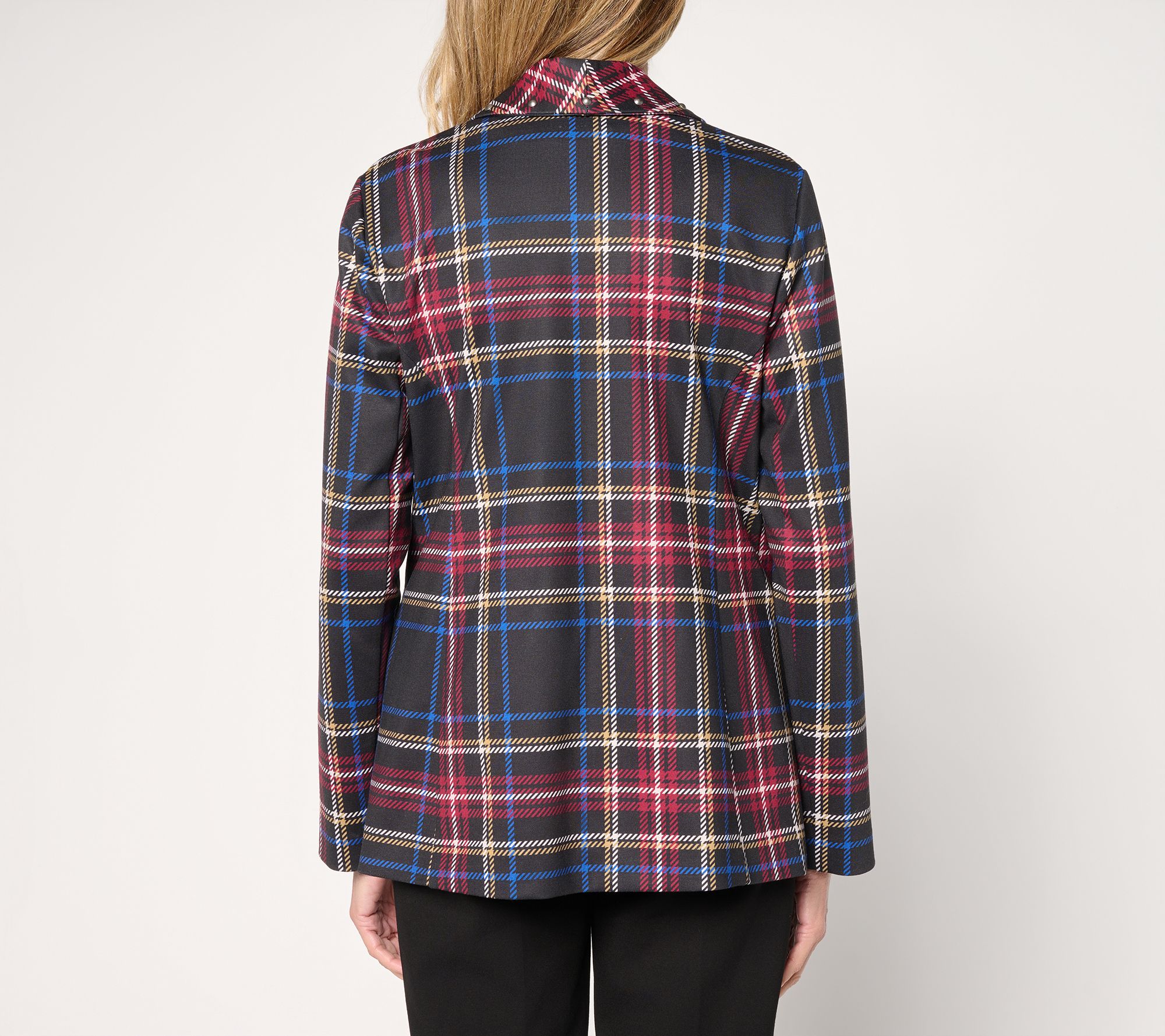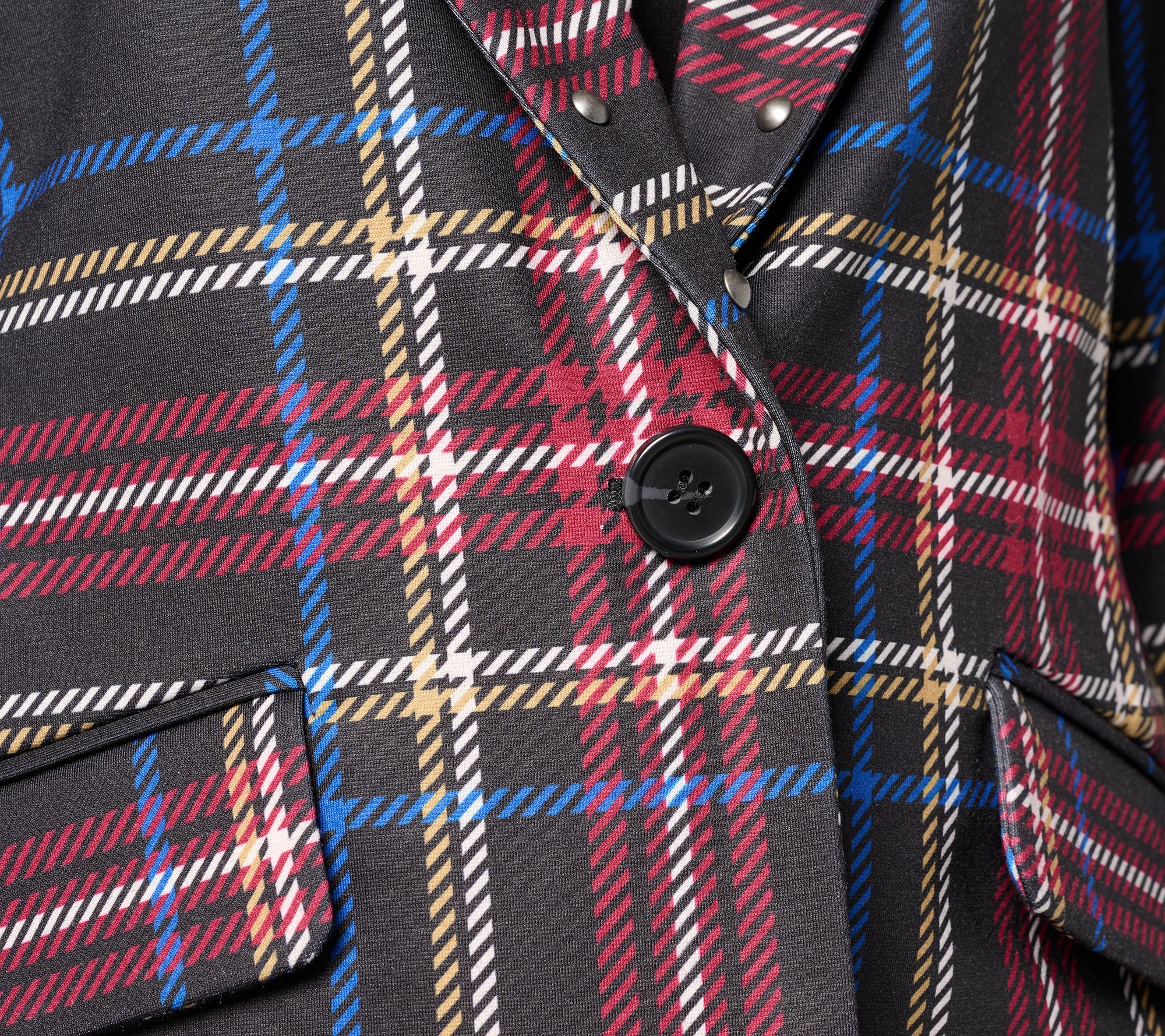 Pull together sharp work looks or add some edge to casual denim with this printed ponte blazer. The classic menswear-inspired print and nailhead studs at the shawl collar bring a modern twist to tailored outfits, while the unlined construction offers lightweight comfort from office to evening outings. From Susan Graver.