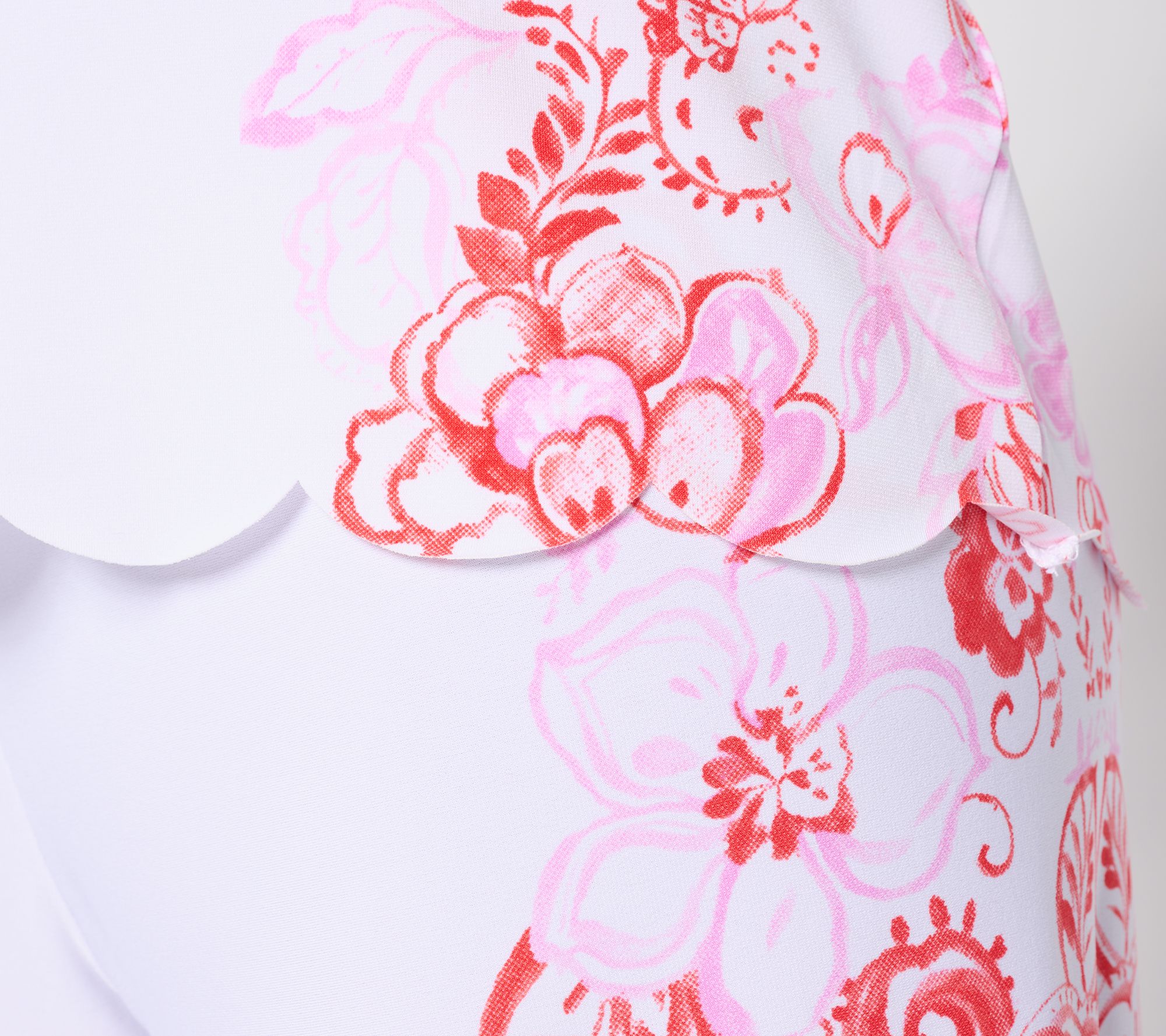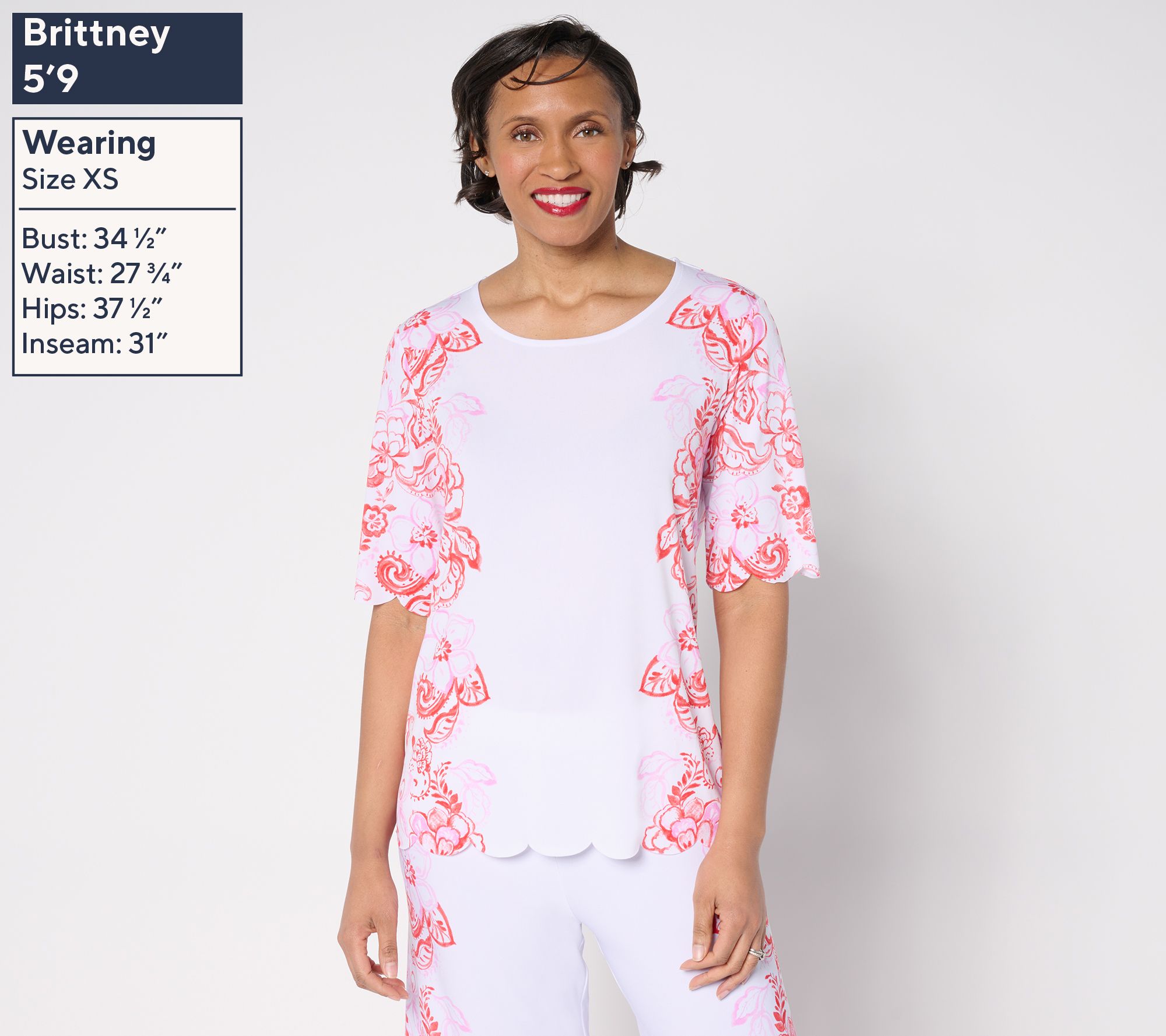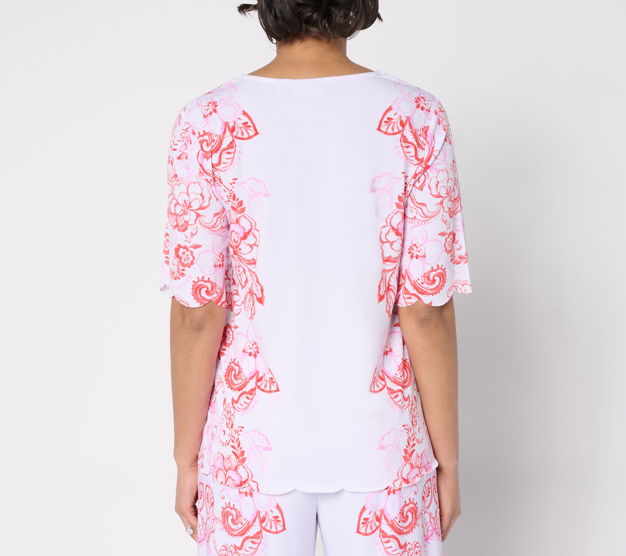 Upgrade your everyday look with this feminine top. Designed for those who appreciate a sophisticated touch, it's fashioned with scalloped edges and a chic placement print. From Susan Graver.