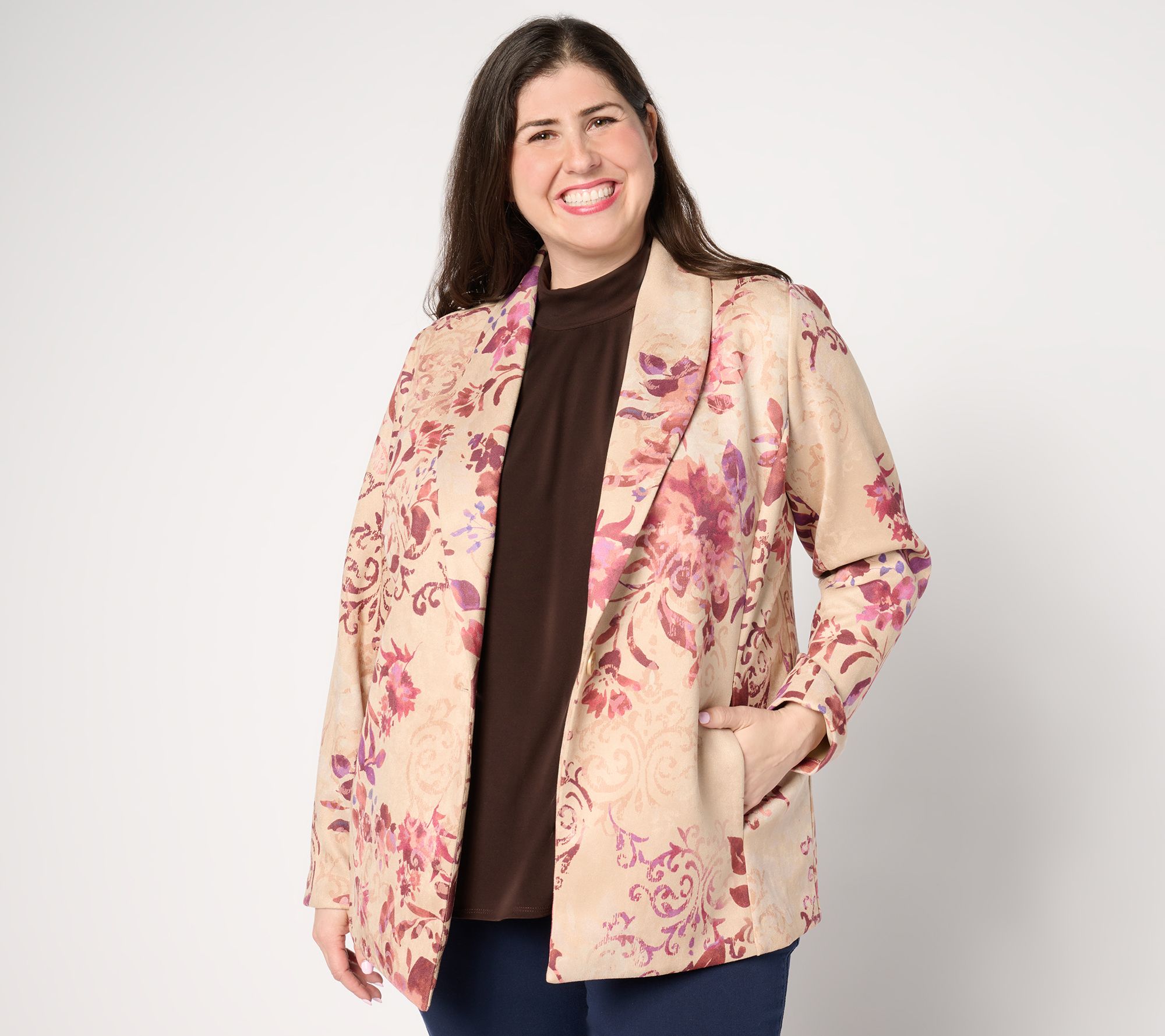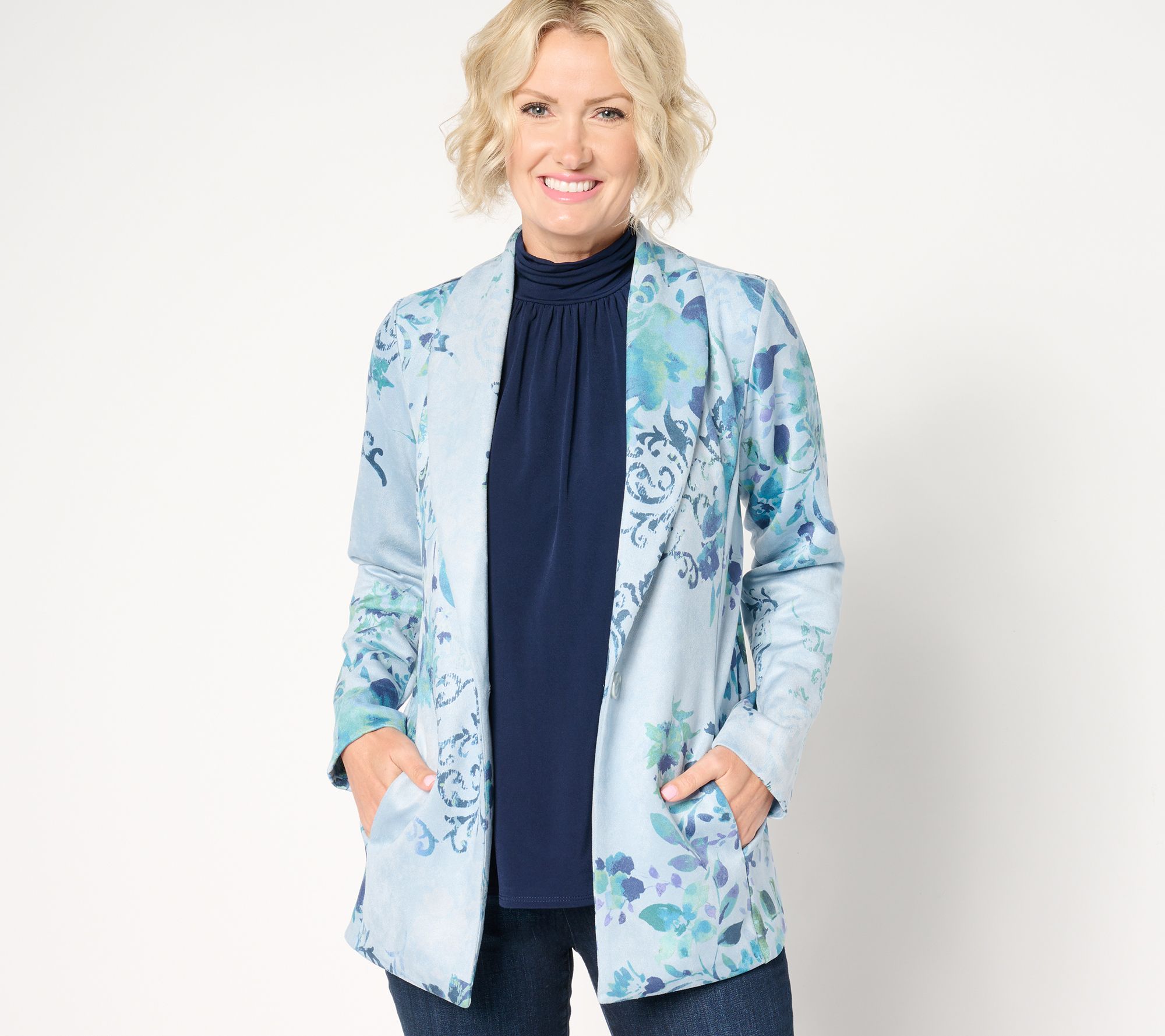 A playful spin on a professional silhouette, this faux suede blazer provides a subtle structured style paired with a fresh and fun print. From Susan Graver.