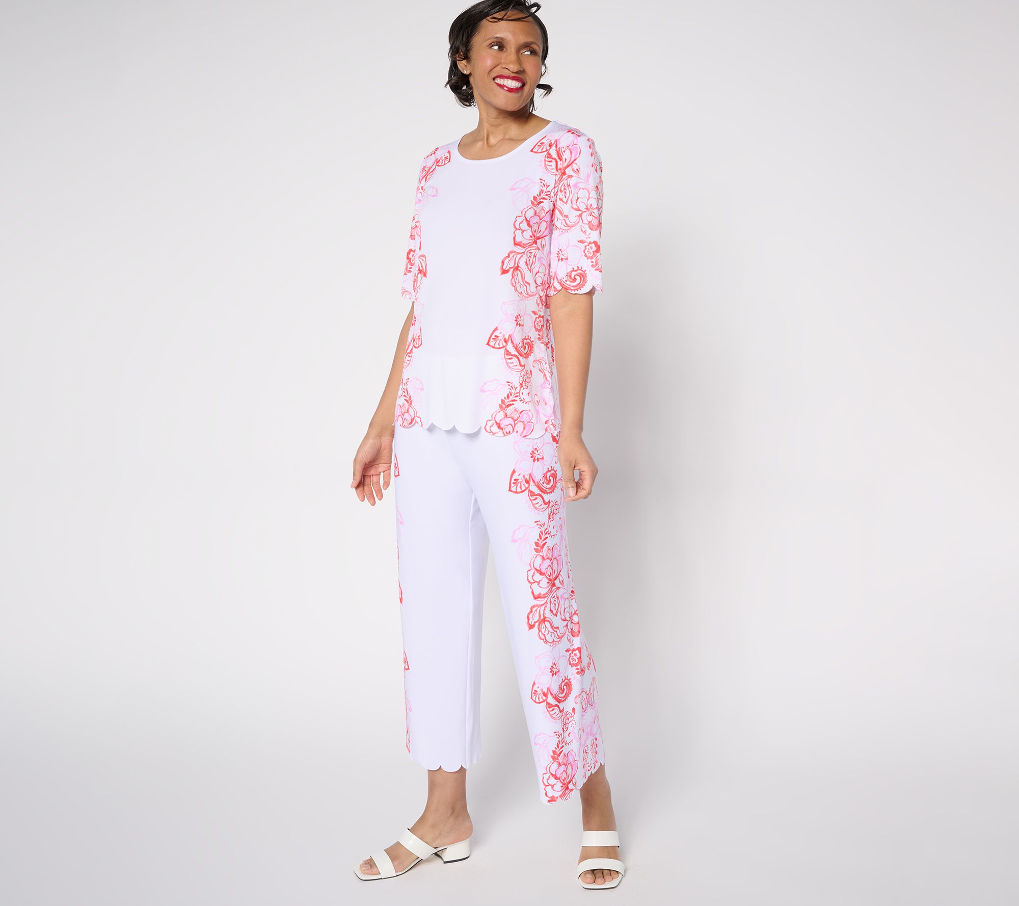 Your wardrobe is practically calling out for the playful style of these printed knit crop pants. With a charming scalloped hem and a placement print, these pants are just the thing for brunches or gallery tours. Their pull-on design makes them easy to slip into, whether you're pairing them with ballet flats or strappy sandals. From Susan Graver.