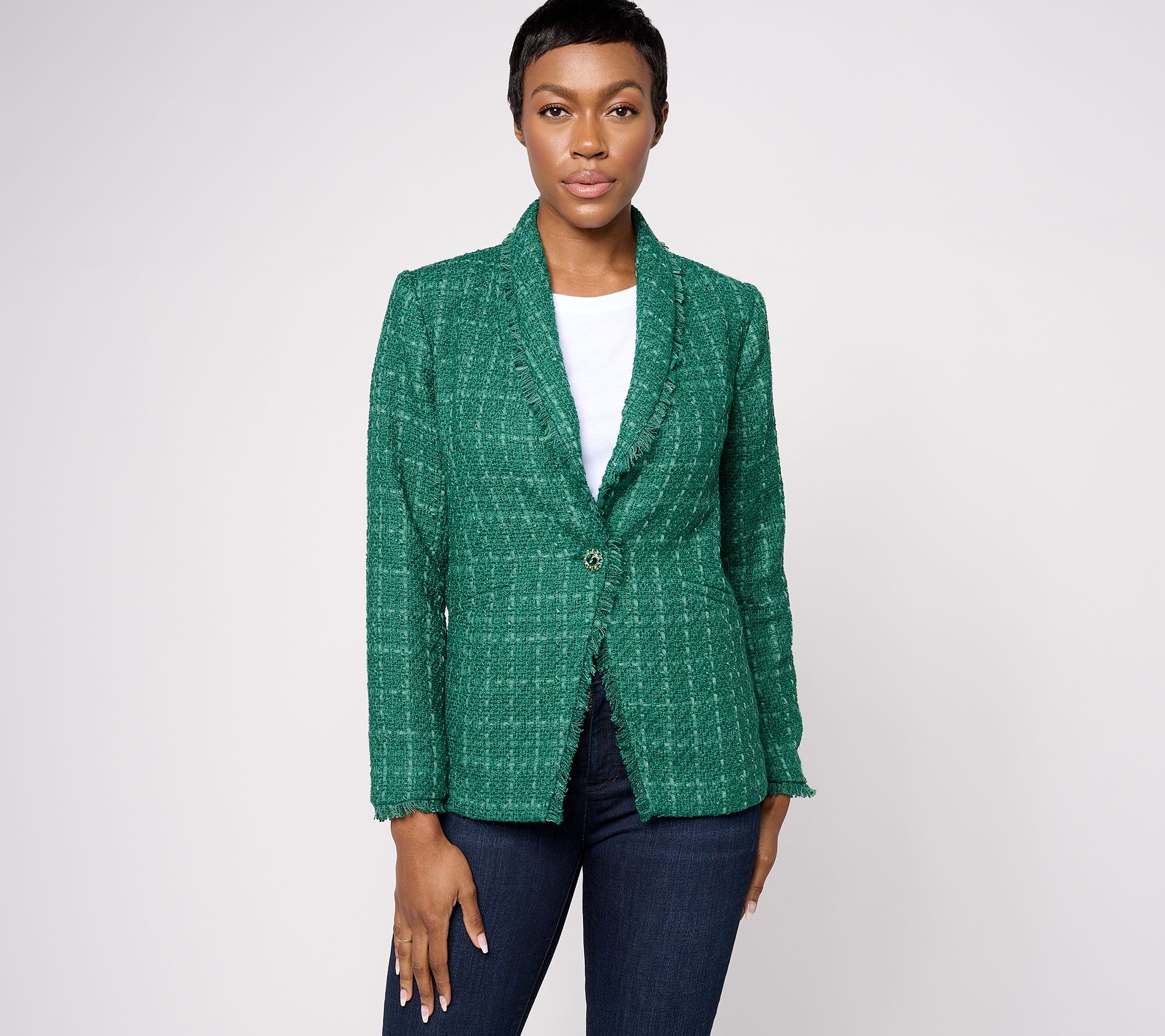 Finish off your look with this classic tweed blazer. Frayed edges give it a modern feel while a decorative button adds a pretty-yet-polished touch. From Susan Graver.