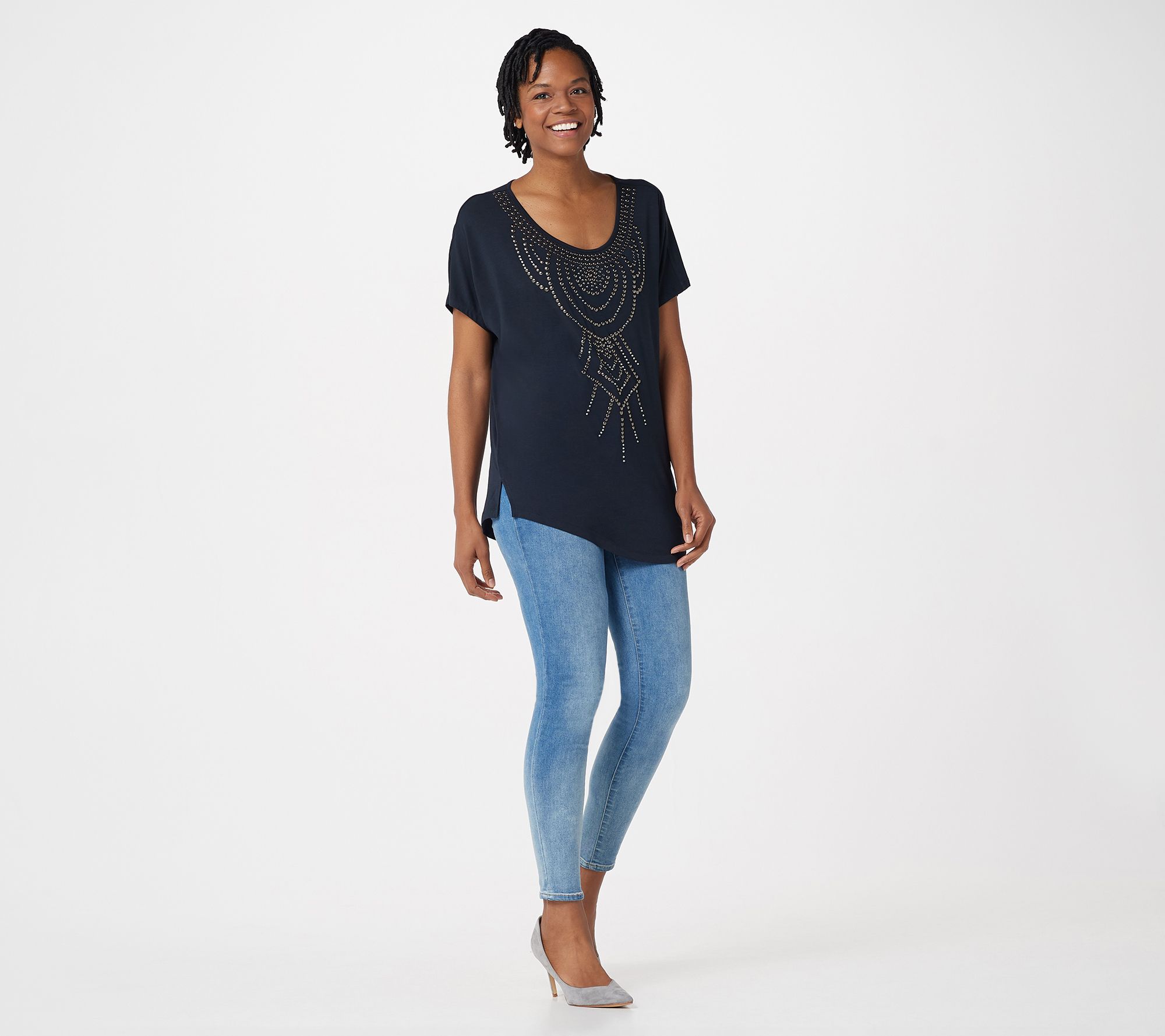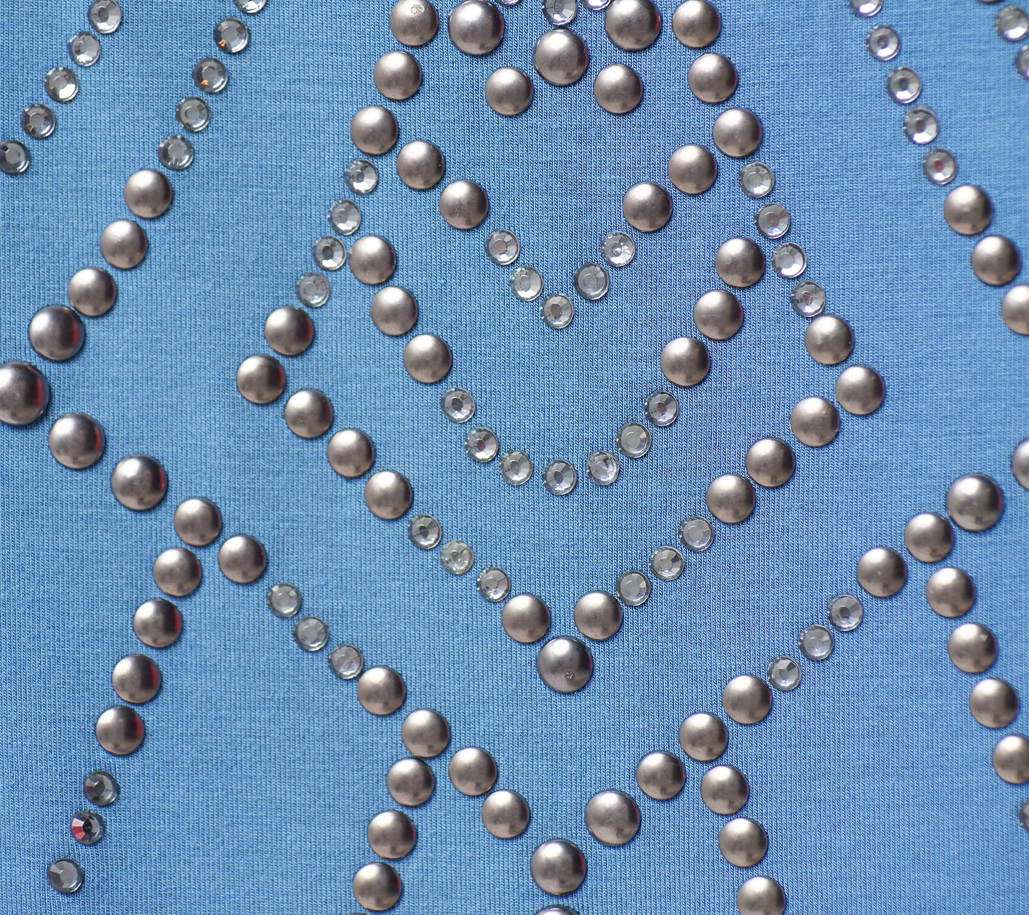 • Features: short sleeves, scoop neckline, side vents, curved hem, antique gunmetal metal studs, silvertone gunmetal rhinestones