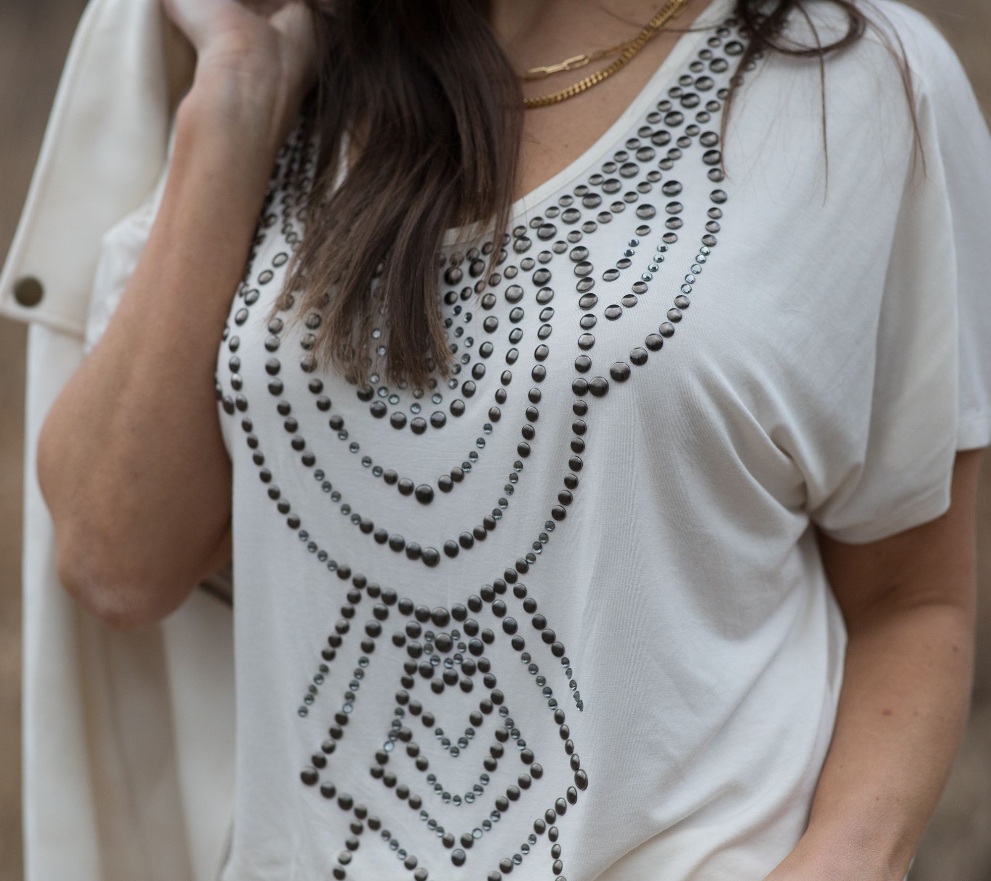 A little bit sassy, a little bit sweet, this short-sleeve top is dotted with studs and rhinestones in an eye-catching, abstract pattern. From Haute Hippie Tribe.