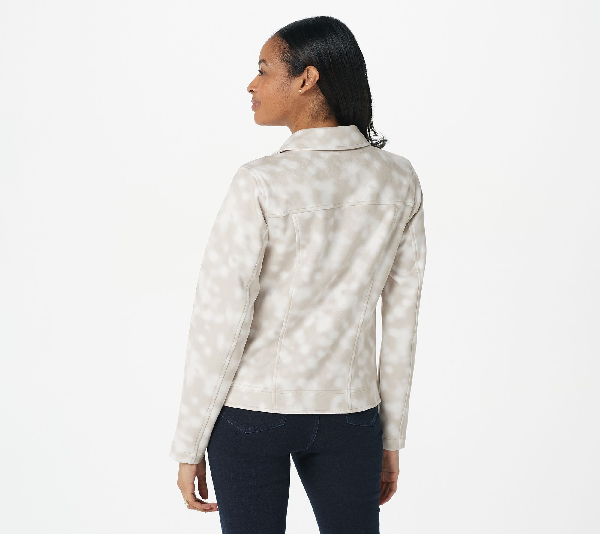 • Features: printed tie-dye design, lined body, metal snaps on collar, long sleeves with pockets