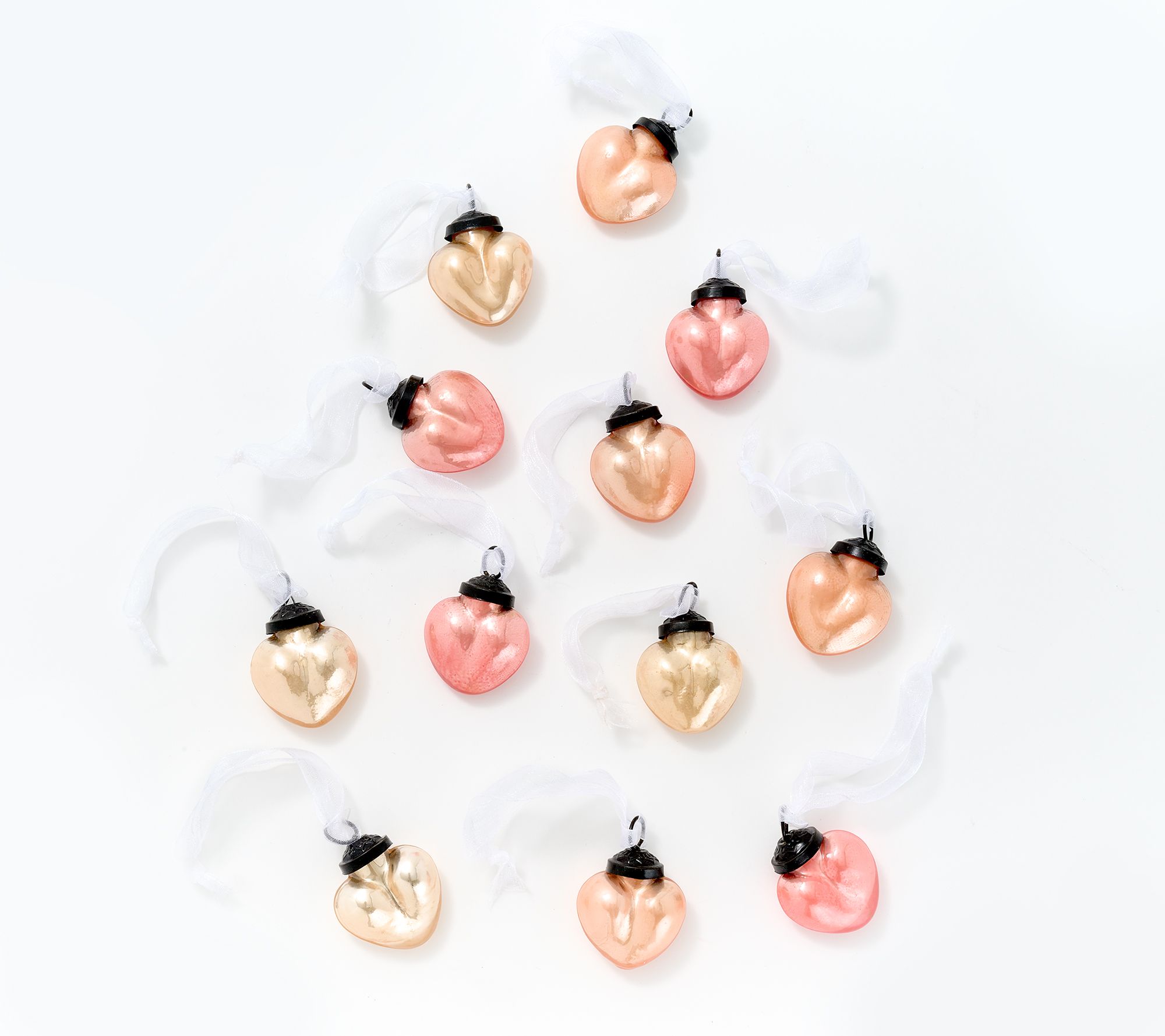 Bring joyful charm to your home any time of year with this set of 12 mini glass heart ornaments. From Home Reflections.