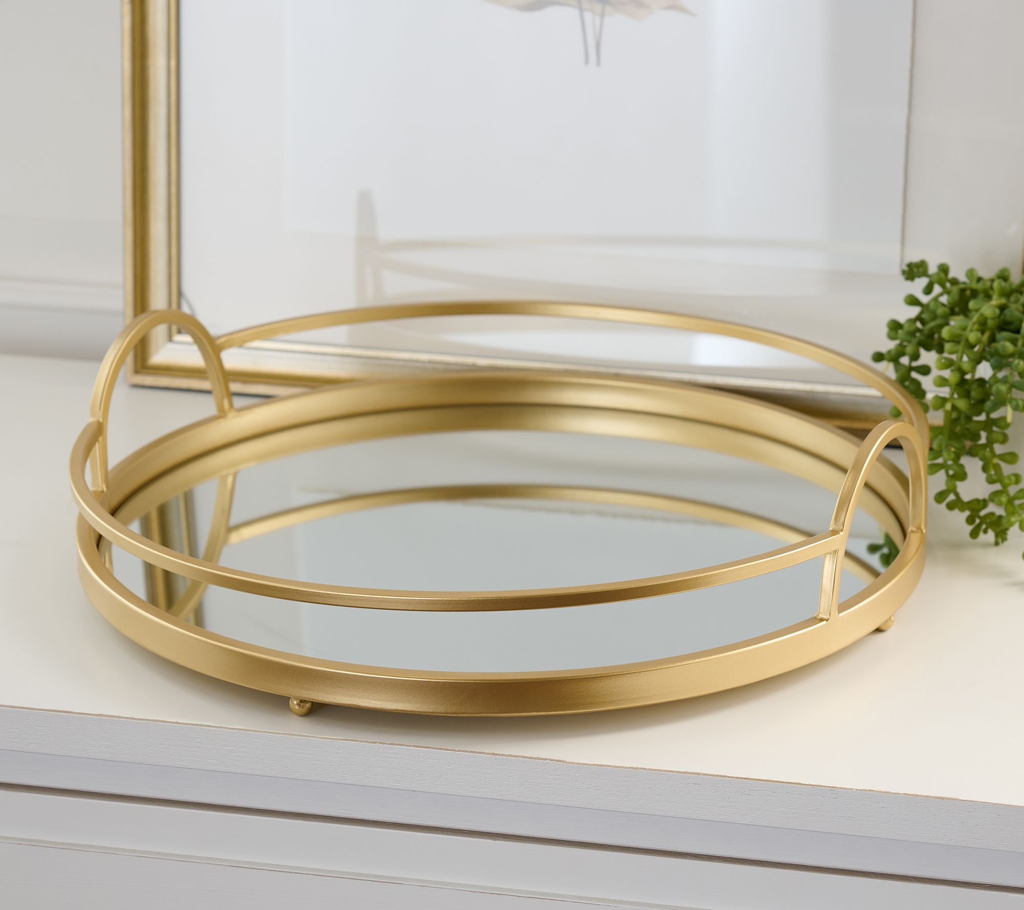 Invite a little luxury into your everyday routine -- this goldtone mirrored tray makes serving guests, displaying collectibles, or corralling your favorite candles a stylish affair. Whether it's keeping refreshments handy for movie night or showcasing perfume bottles atop your vanity, its handles make transportation easy and elegant. From Home Reflections®.