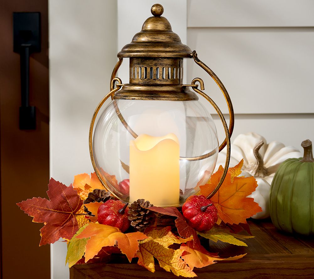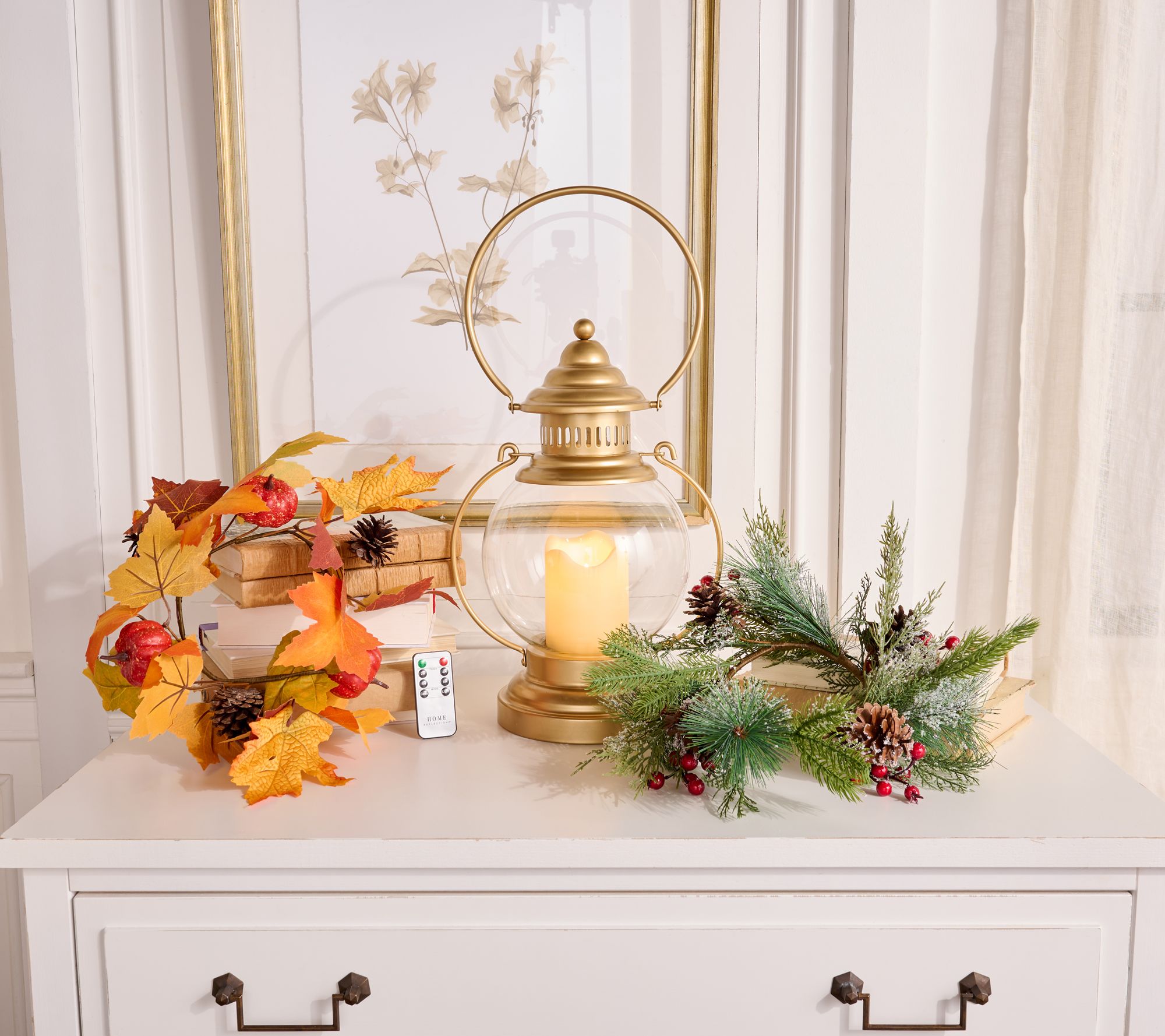 Harvest even more cheer! Two attachable indoor-use wreaths -- one with snow-dusted winter greenery and one with bright autumnal leaves -- turn your lantern into the festive main feature of any nook, tablescape, or nightstand. For an interior designer moment, style the flame-less lantern among pumpkins, ornaments, mirrored elements, or whatever gives you goosebumps (the good kind). From Home Reflections®.