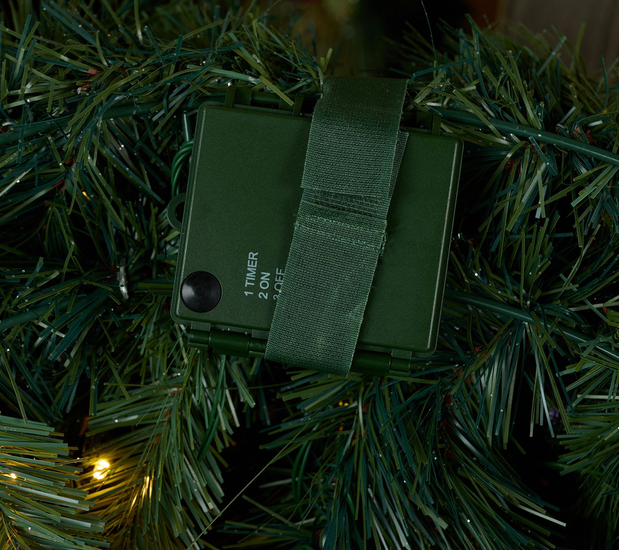 • Illuminated faux pine wreath with glitter twig detail, pinecones, and plastic baubles