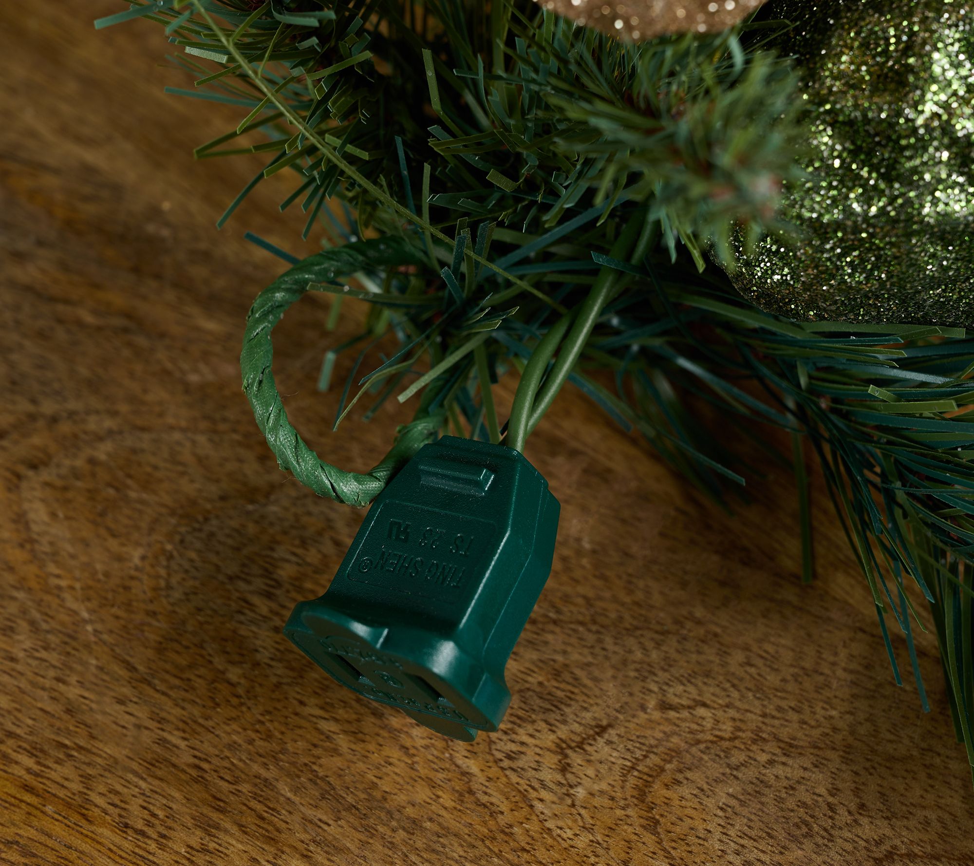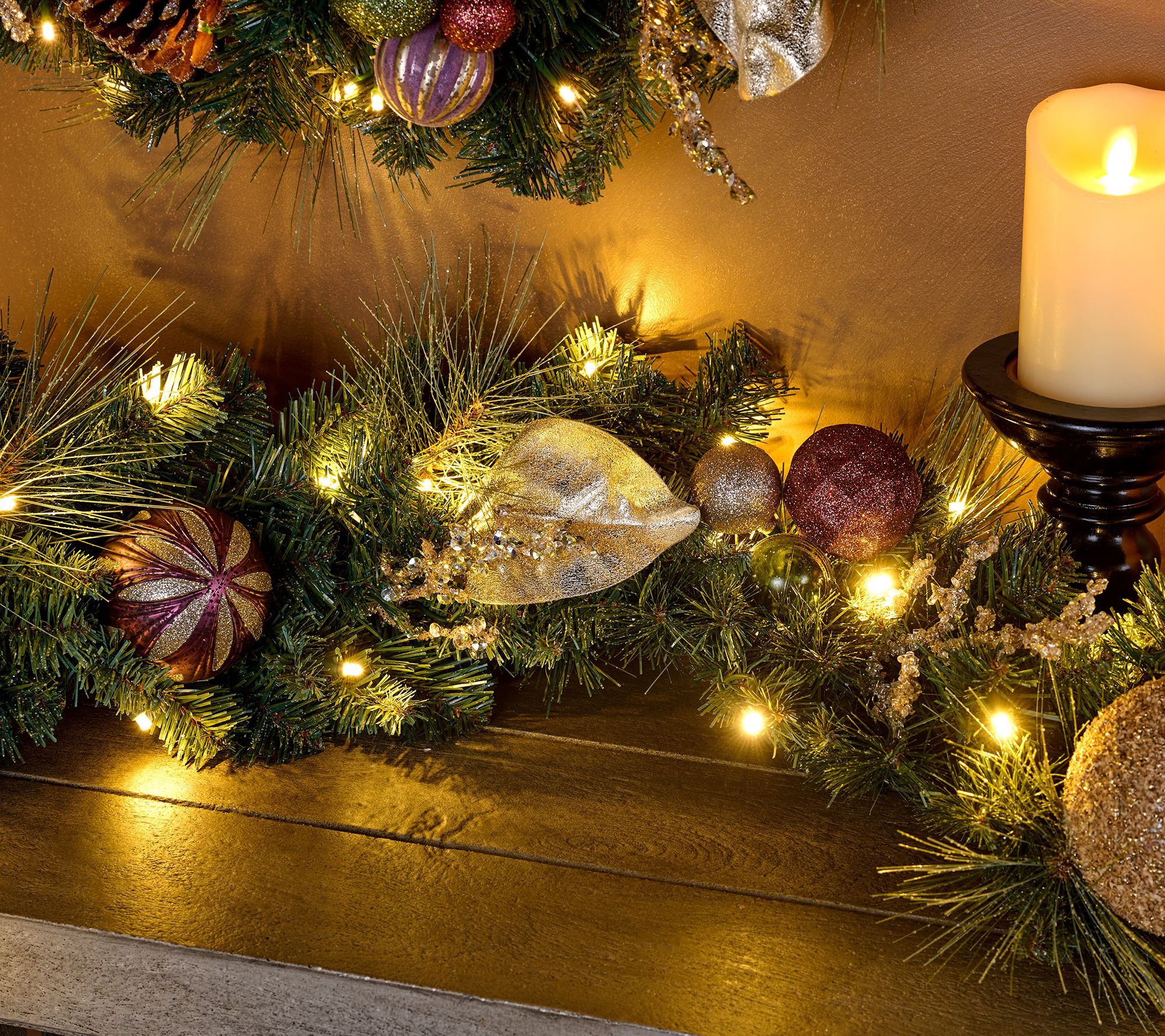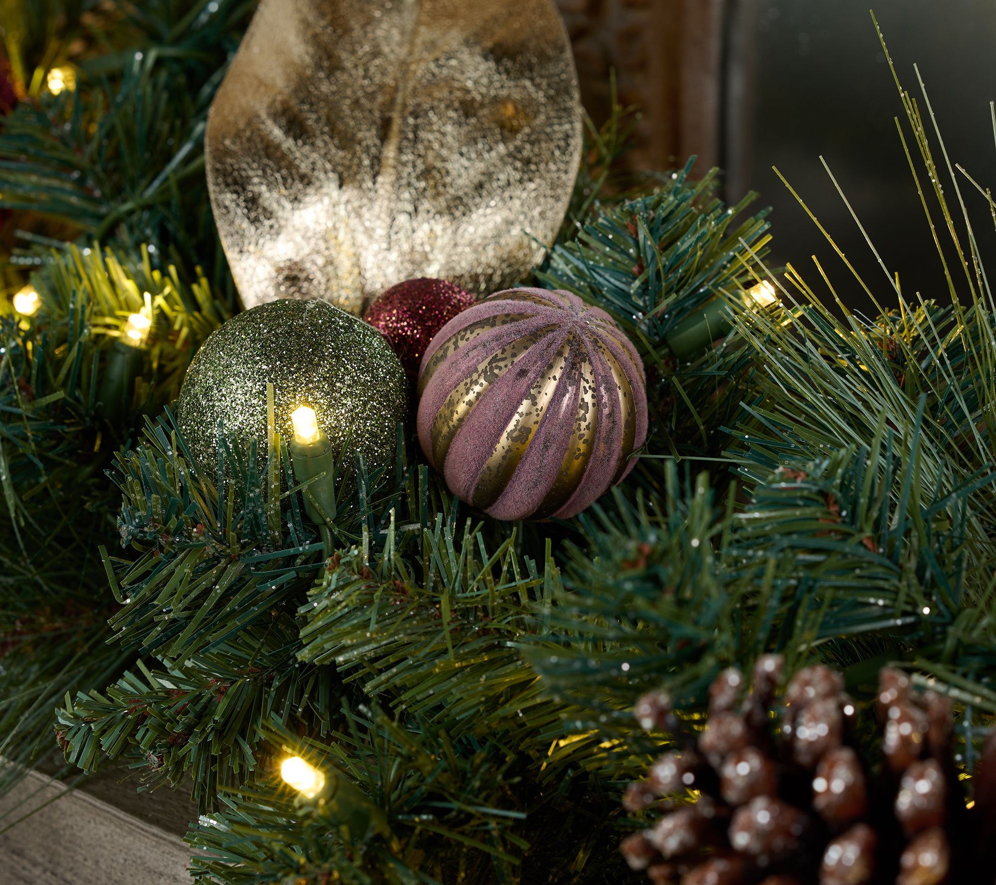 • Illuminated faux pine garland with glitter twig detail, pinecones, and plastic baubles