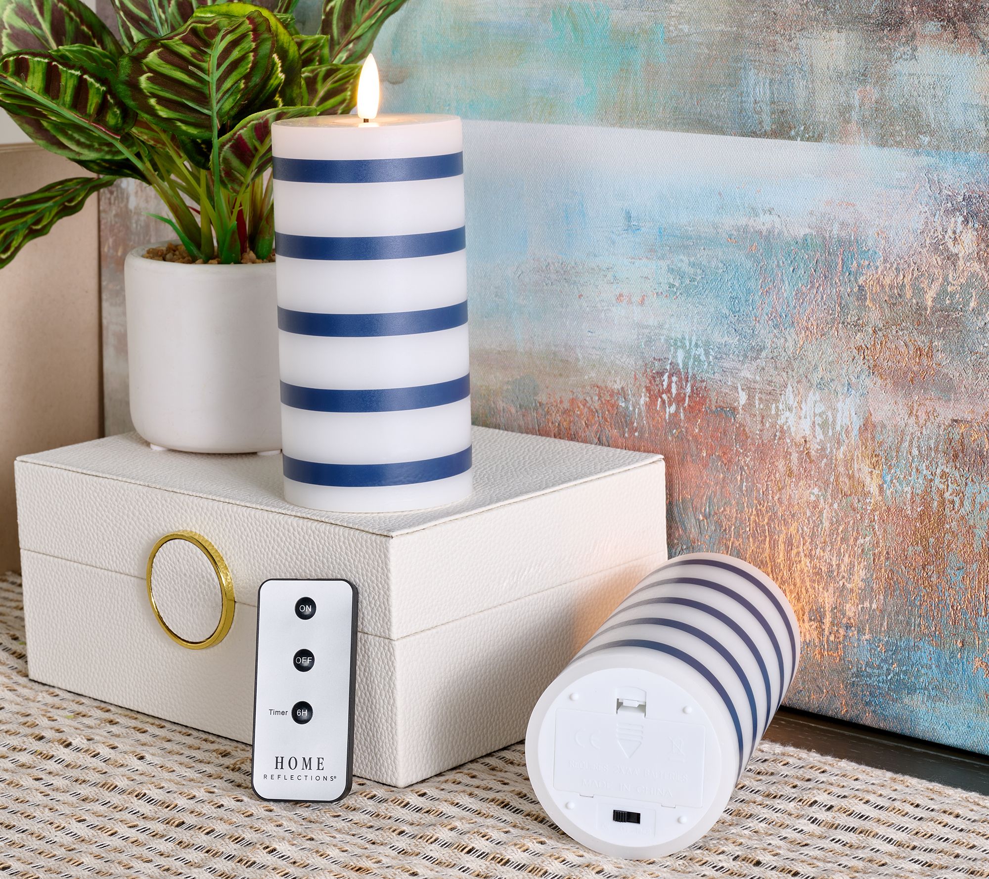 Brighten your home and create a welcoming glow with these striped flameless pillar candles. Effortlessly add style to your coffee table or dining area, and easily control the ambience with the included remote and timer feature. A charming way to enhance your decor without any worry. From Home Reflections®.