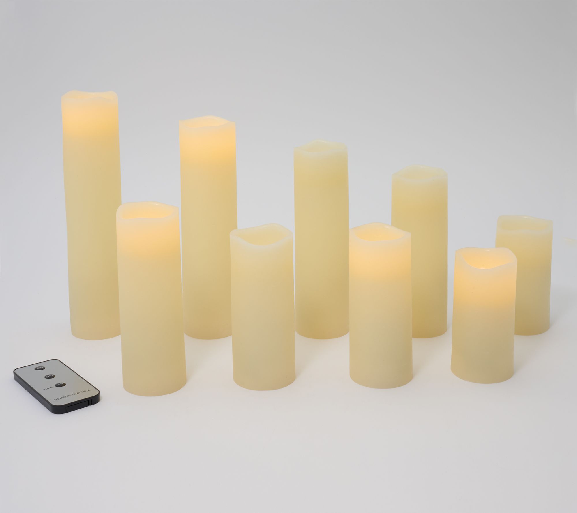 • Includes one 8-7/8"H flameless candle, one 7-7/8"H flameless candle, one 6-7/8"H flameless candle, two 5-7/8"H flameless candles, two 4-7/8"H flameless candles, two 4"H flameless candles, and one remote