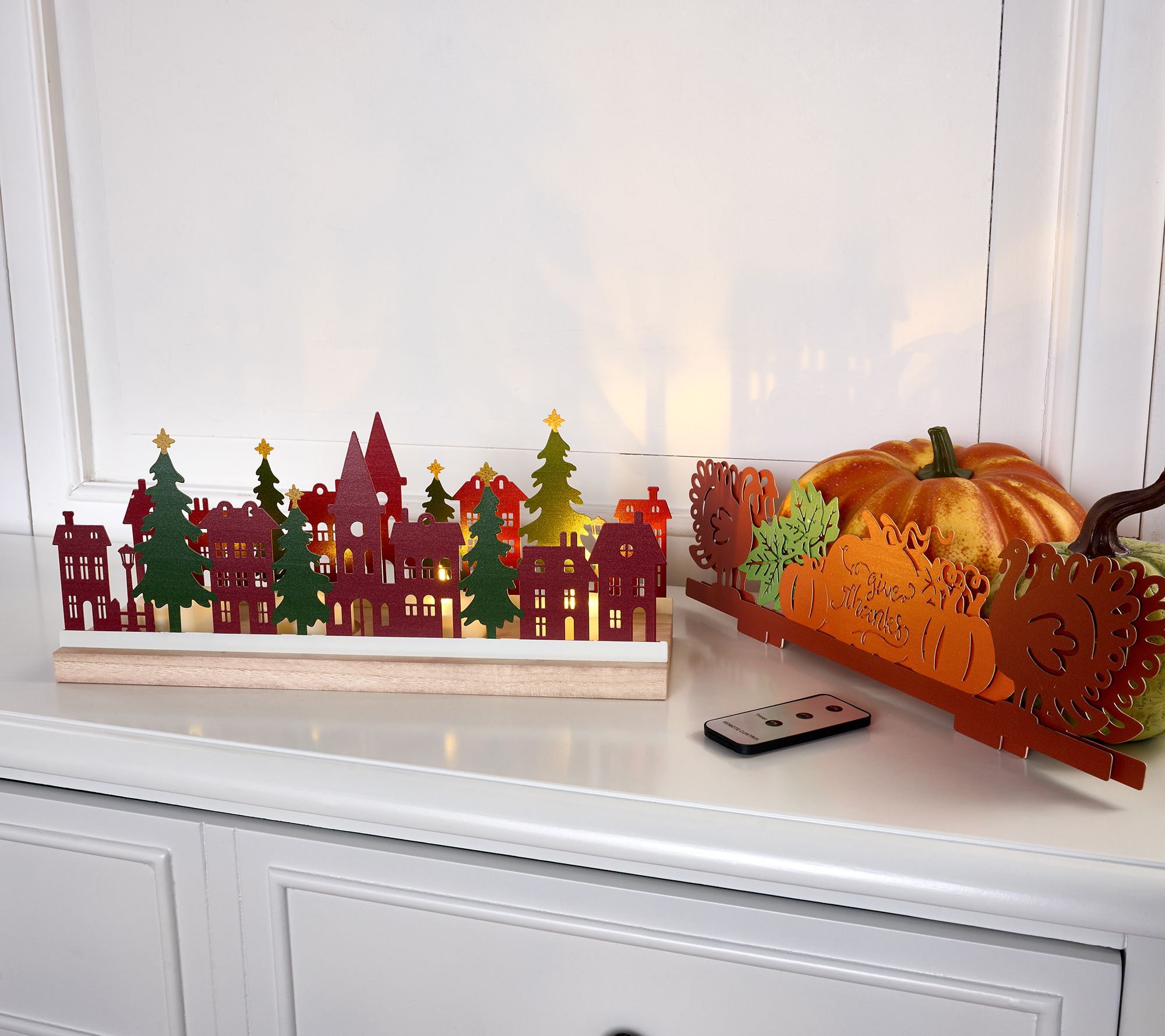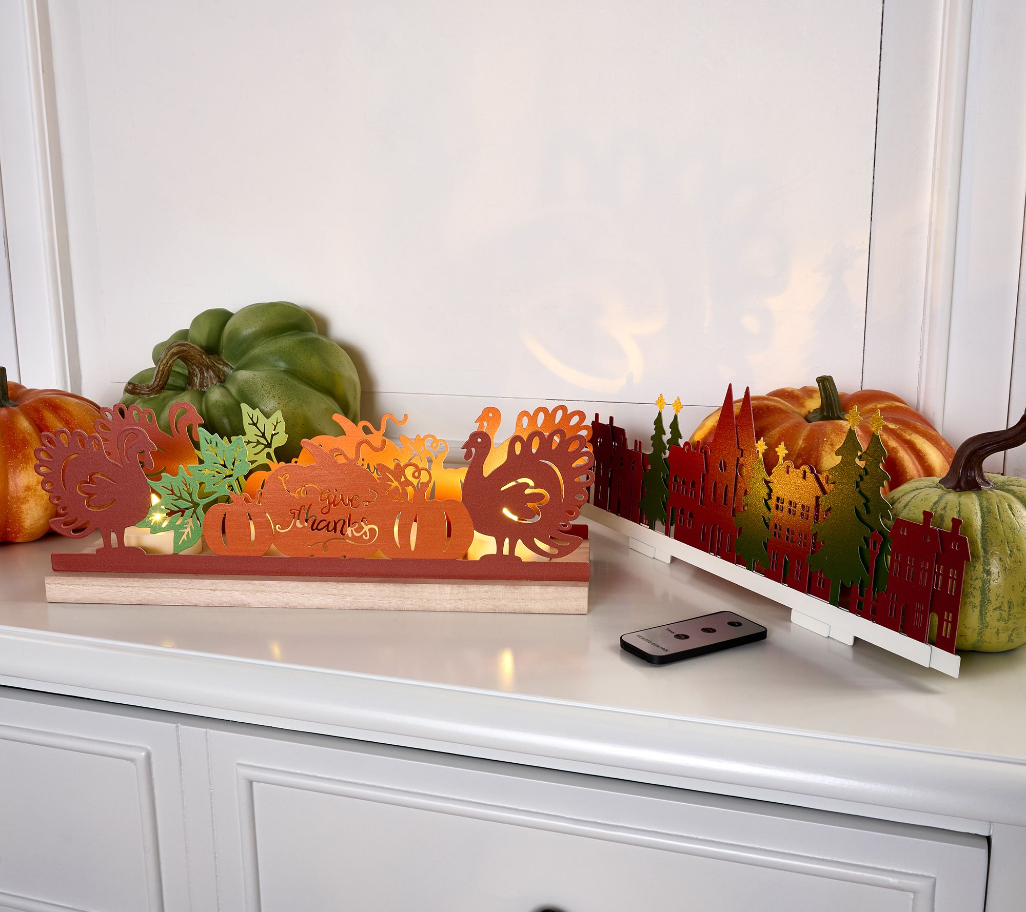 Greet the holiday season or any special day with this charming tealight scene, where glowing silhouettes add a cheerful flair to gatherings or quiet evenings. Mix and match the interchangeable holiday or everyday scenes, illuminated by tea lights that are easy to control with the handy remote and timer. From Home Reflections®.