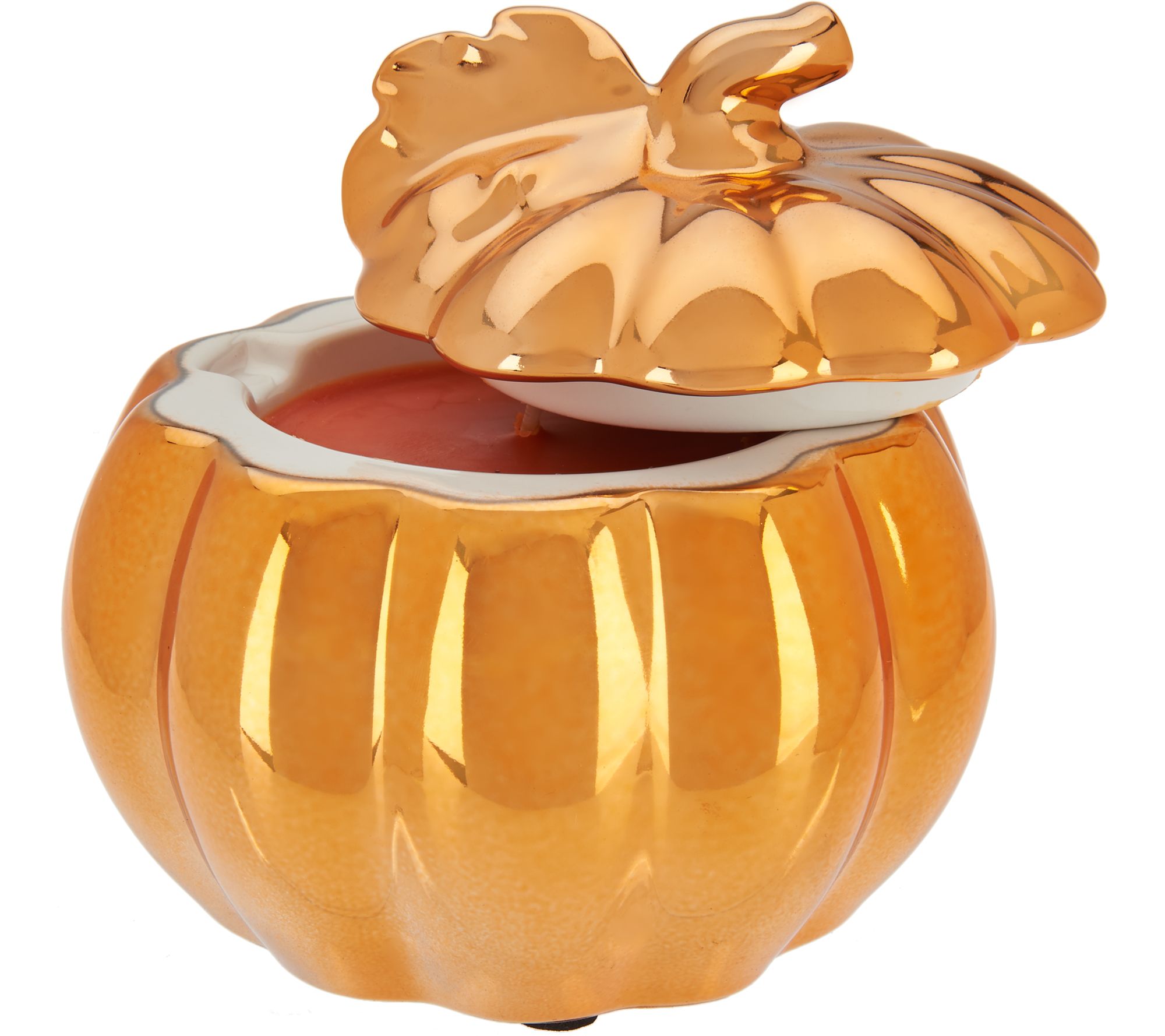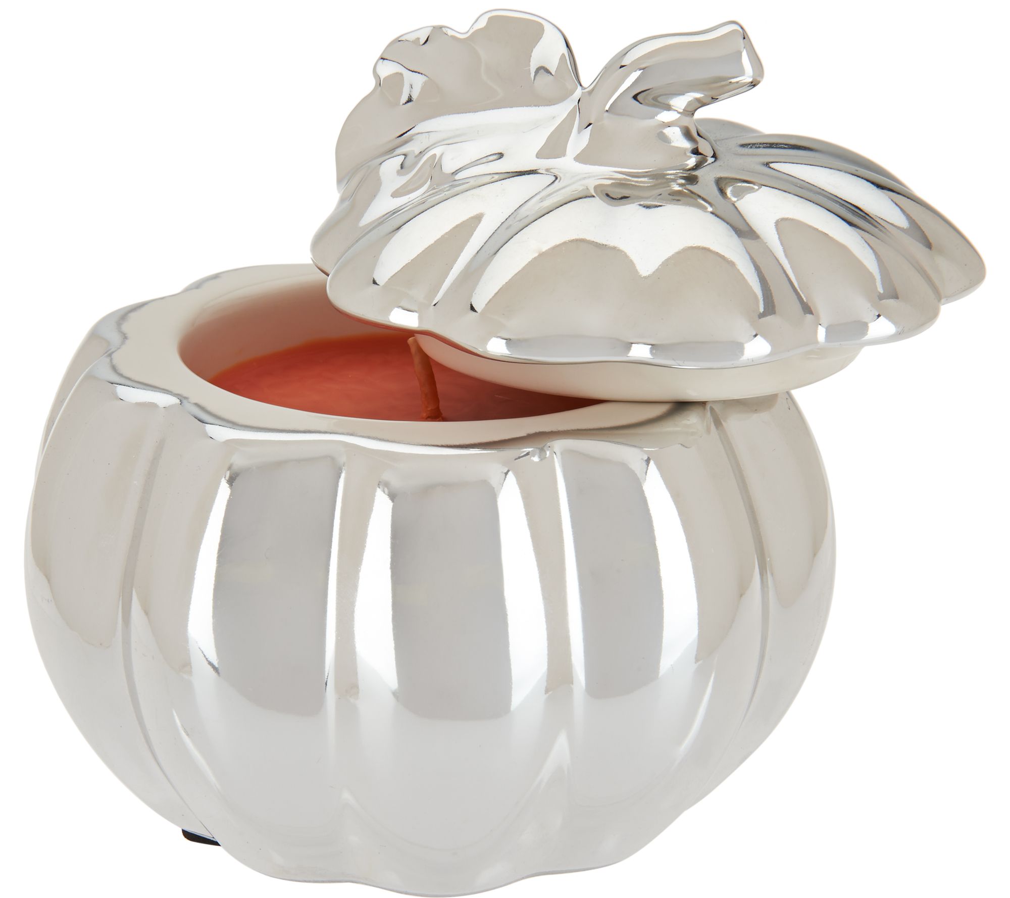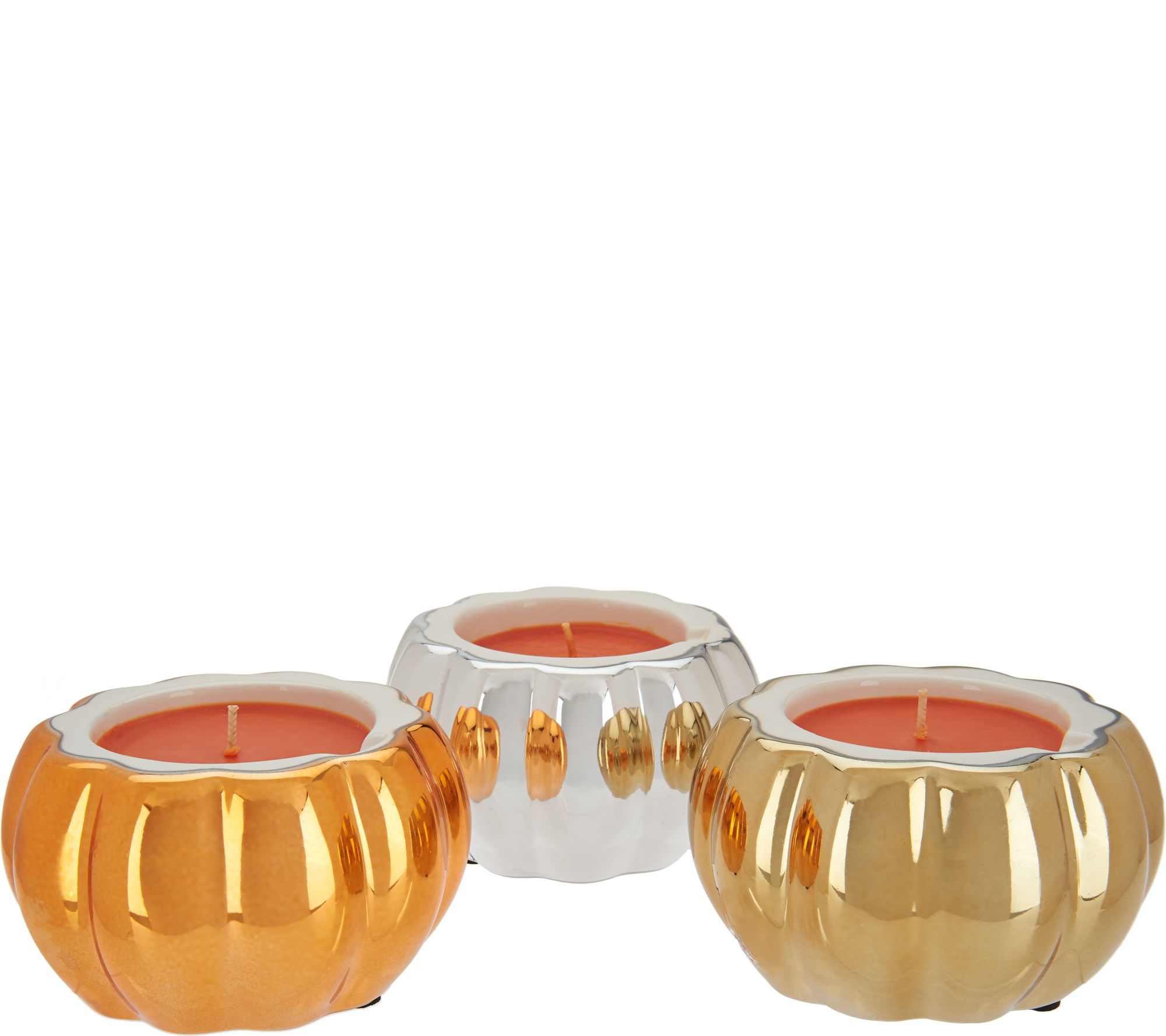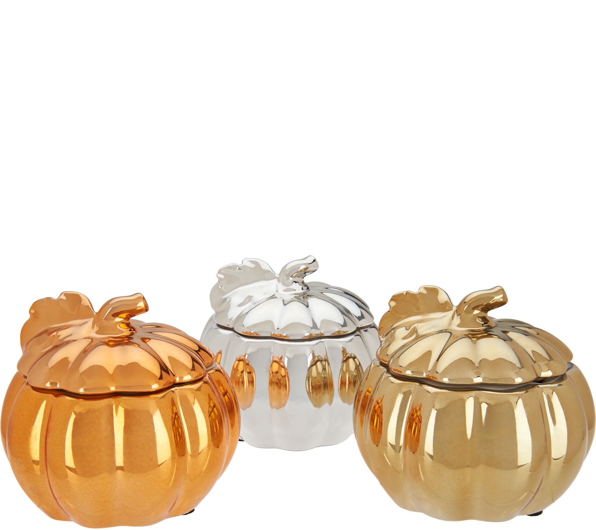 Includes three figural pumpkin canisters with lids and 4-oz candle: one each in orange, goldtone, and silvertone