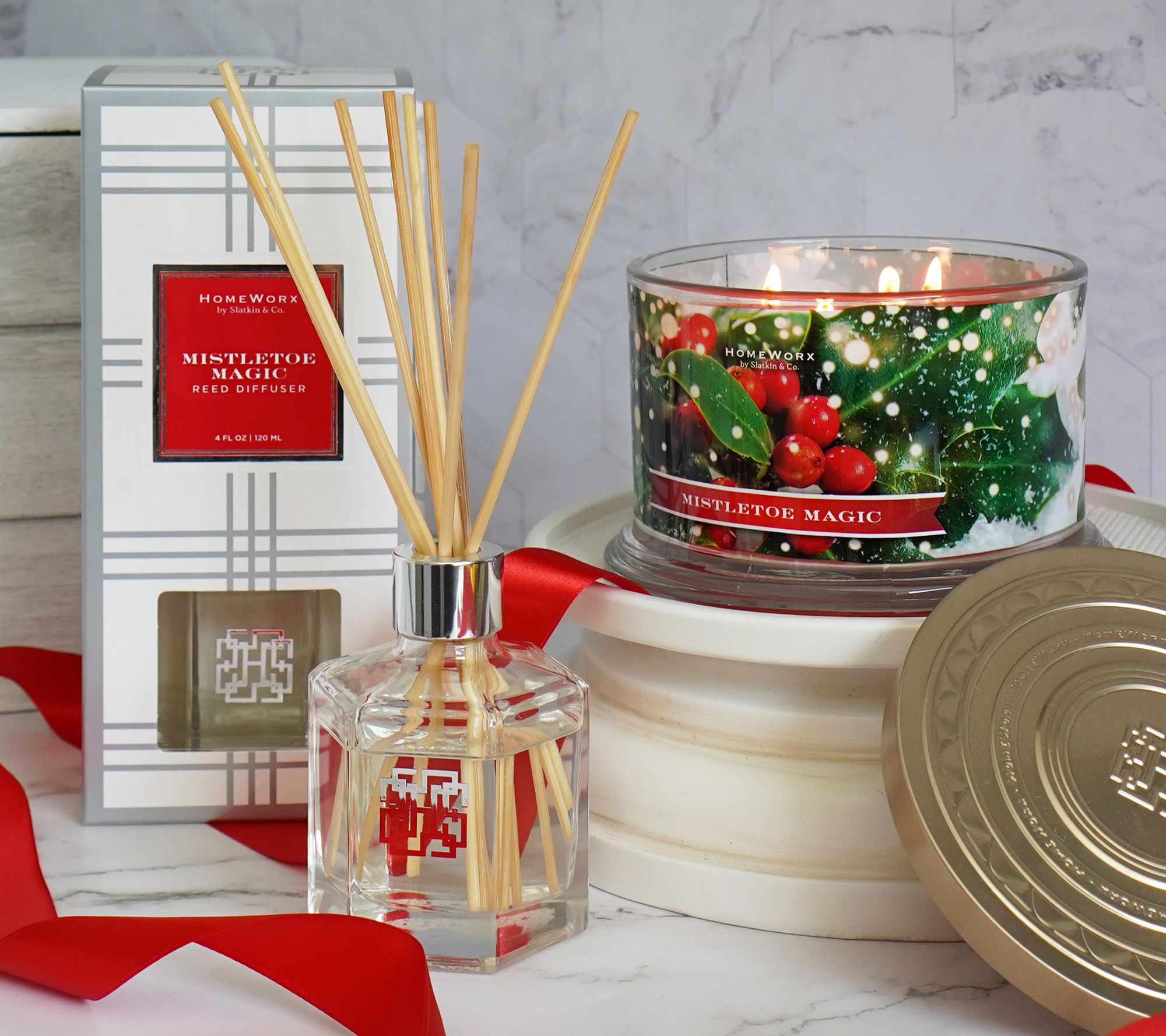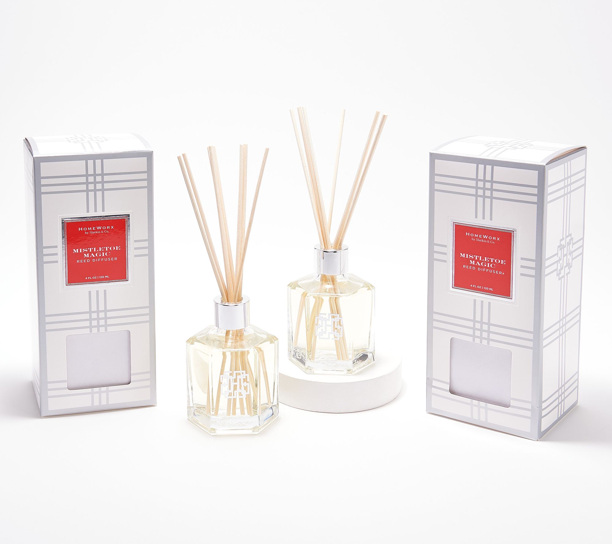 Inject the enticing aroma of black currant, pine needles, fir balsam, and pomelo into your space with these Mistletoe Magic reed sticks that create just the ambience you've been looking for. From HomeWorx by Slatkin & Co.
