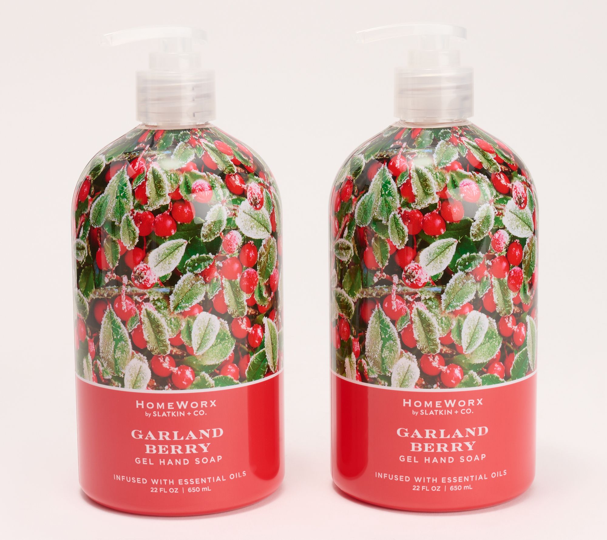 • Includes two 22-oz gel hand soaps in Garland Berry scent