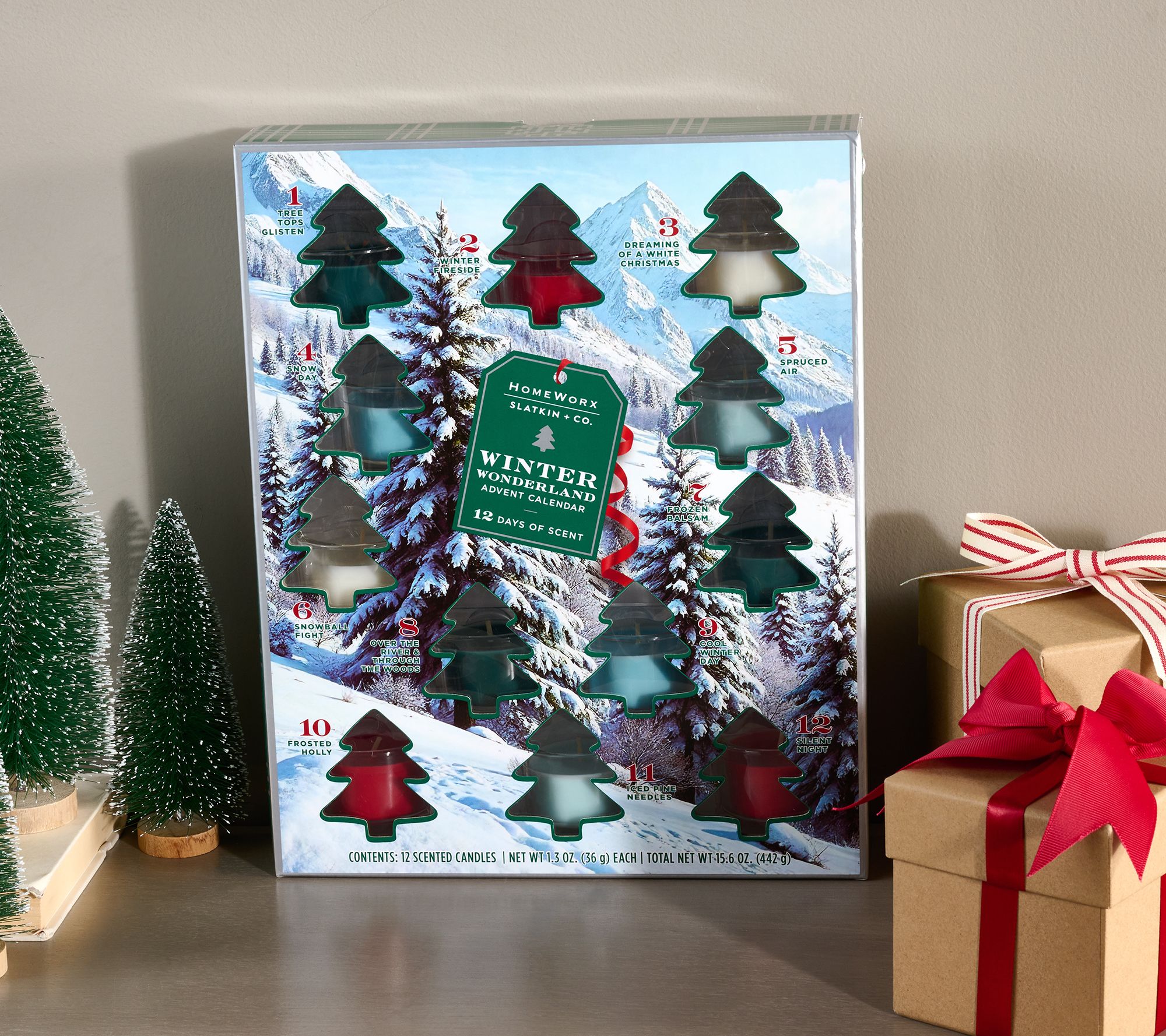 • Includes advent calendar with twelve 1.3-oz scented candles in Tree Tops Glisten, Winter Fireside, Dreaming of a White Christmas, Snow Day, Spruced Air, Snowball Fight, Frozen Balsam, Over the River and Through the Woods, Cool Winter Day, Frosted Holly, Iced Pine Needles, and Silent Night