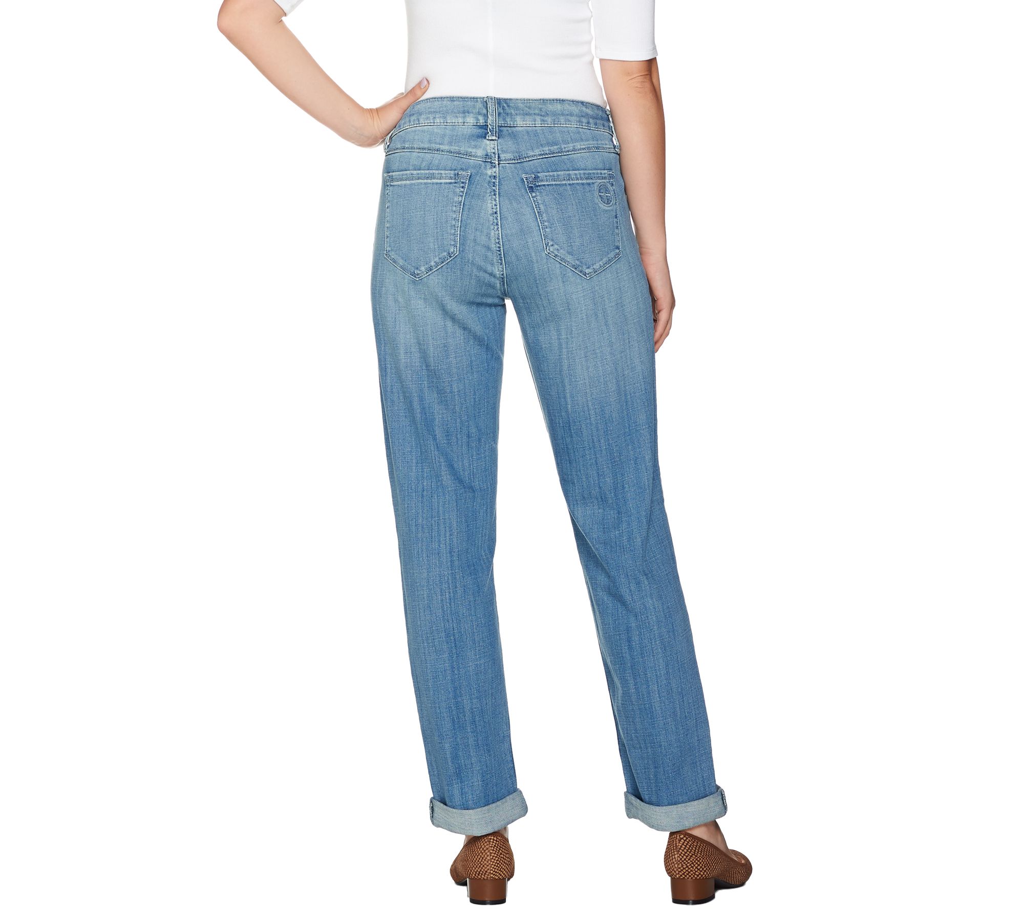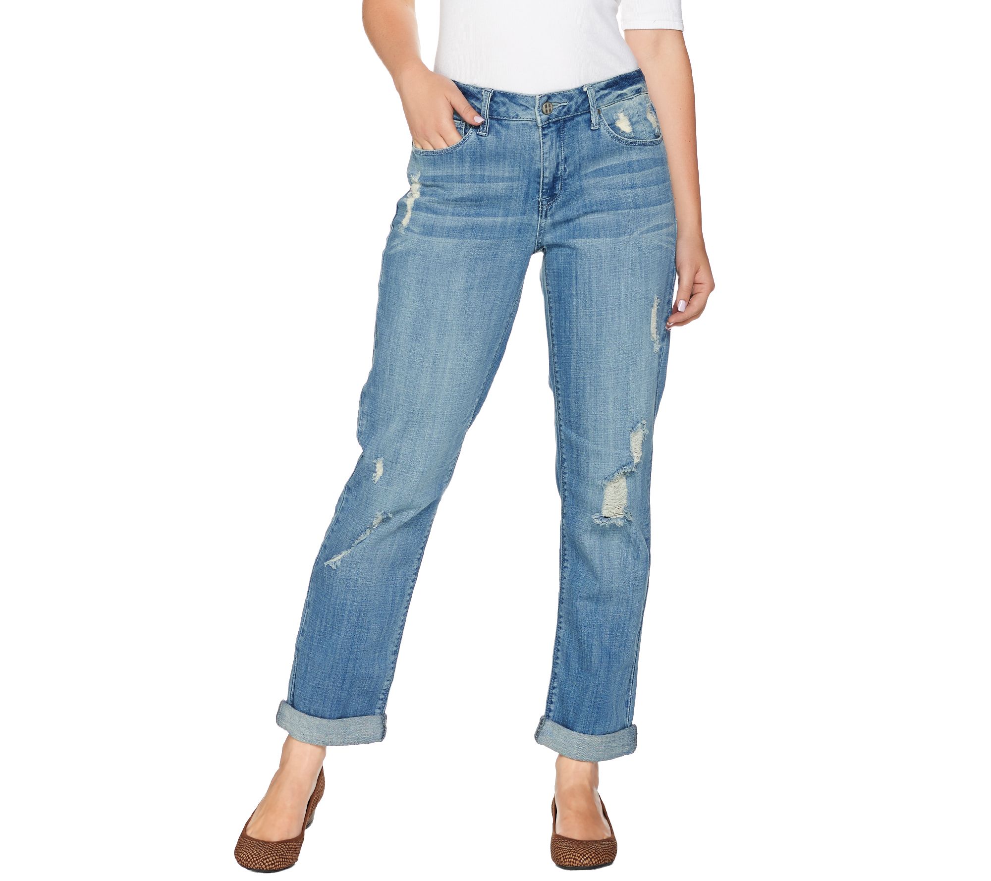It's all about the details. Done in distressed denim, these Hot in Hollywood boyfriend jeans have cuffed bottoms that you can roll up or down to suit your mood. From Hot in Hollywood.