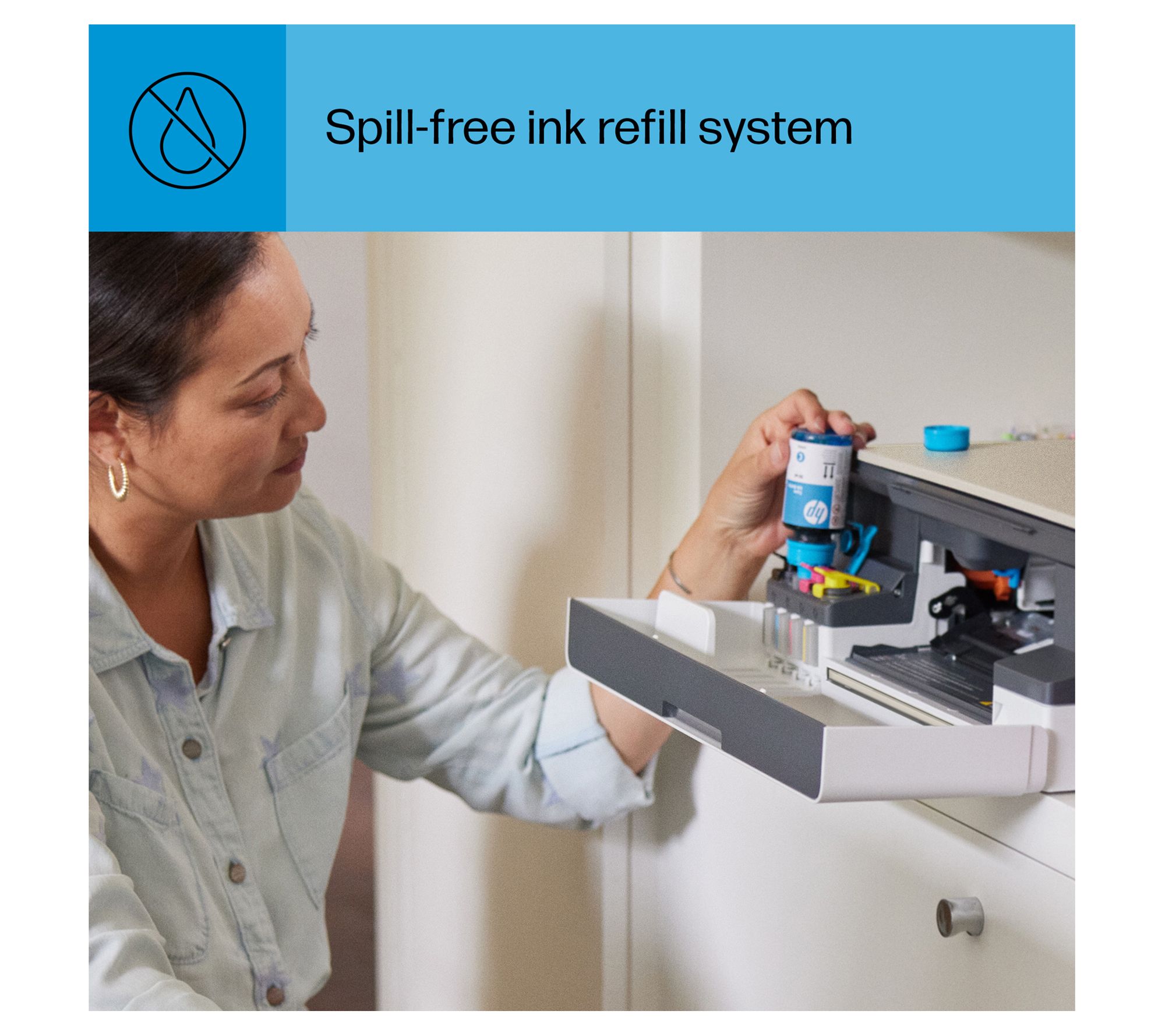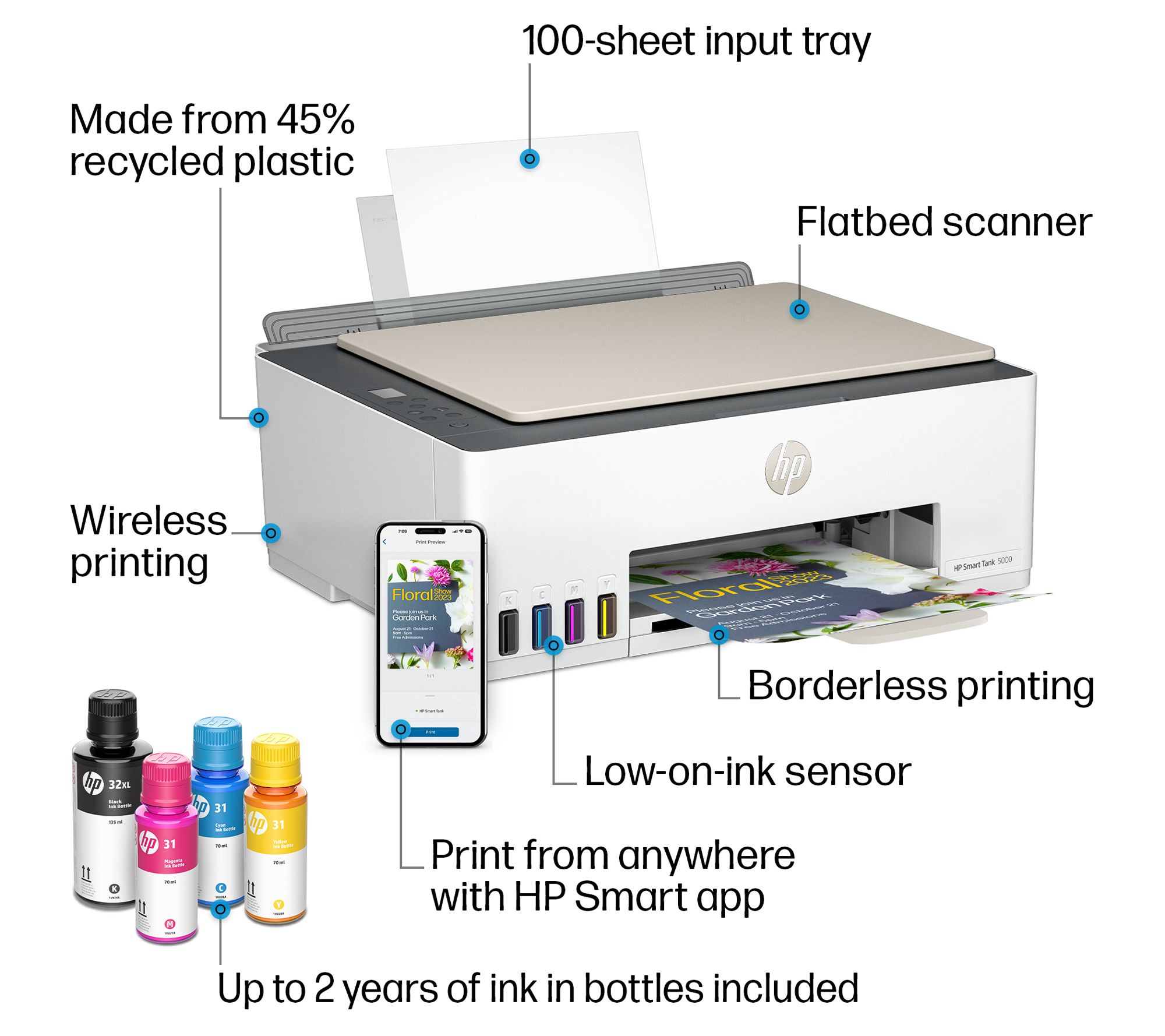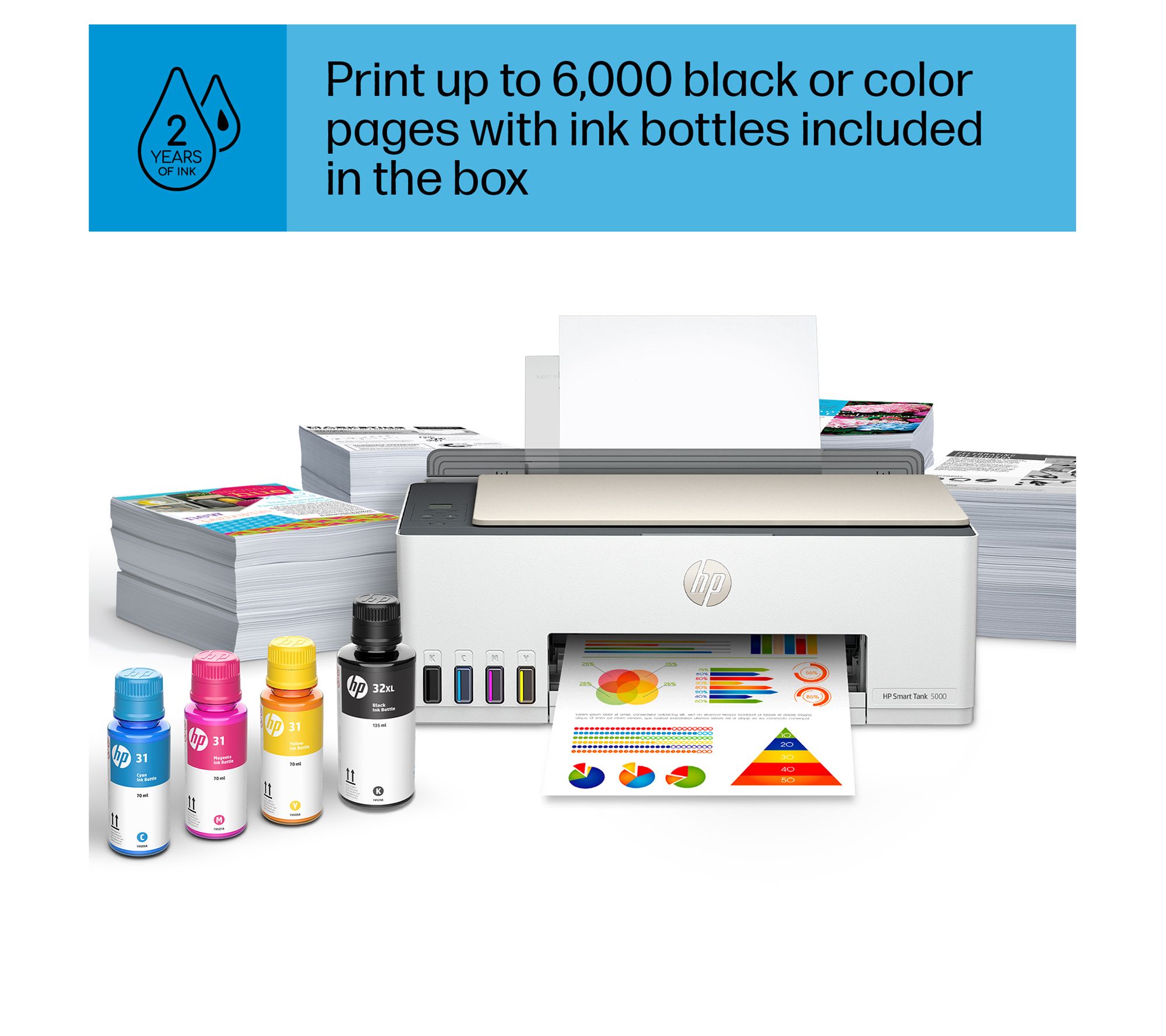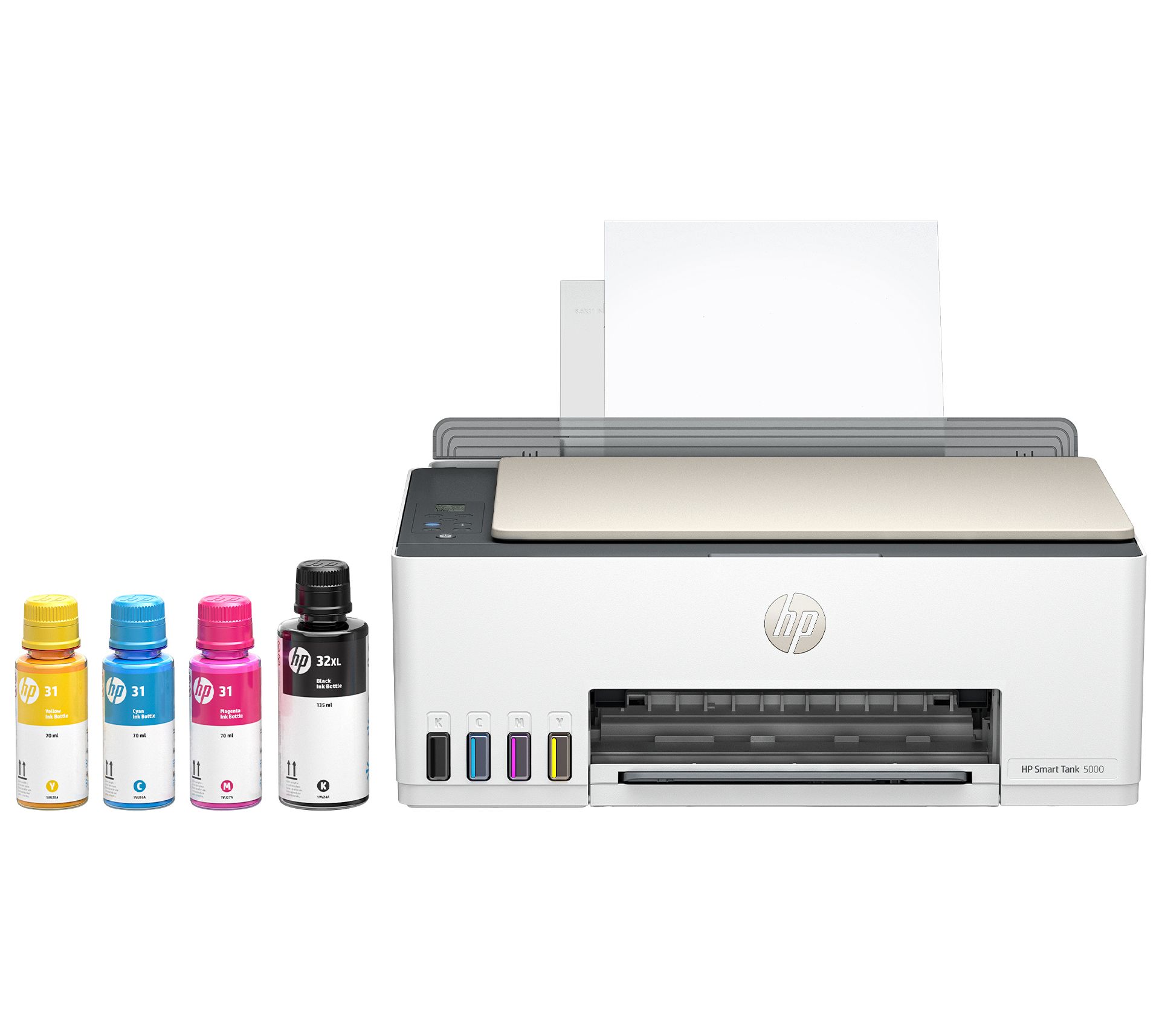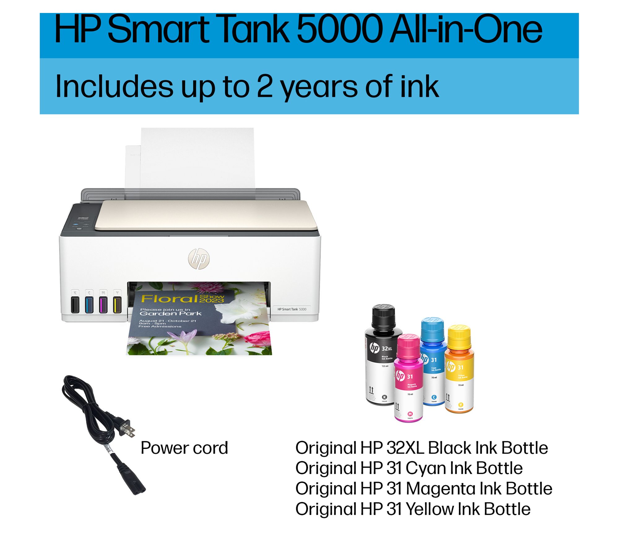 • Includes Smart Tank all-in-one printer with power cord, HP 32XL black ink bottle, HP 31 cyan ink bottle, HP 31 magenta ink bottle, HP 31 yellow ink bottle, black printhead, tri-color printhead, and 50 sheets of 4x6 photo paper