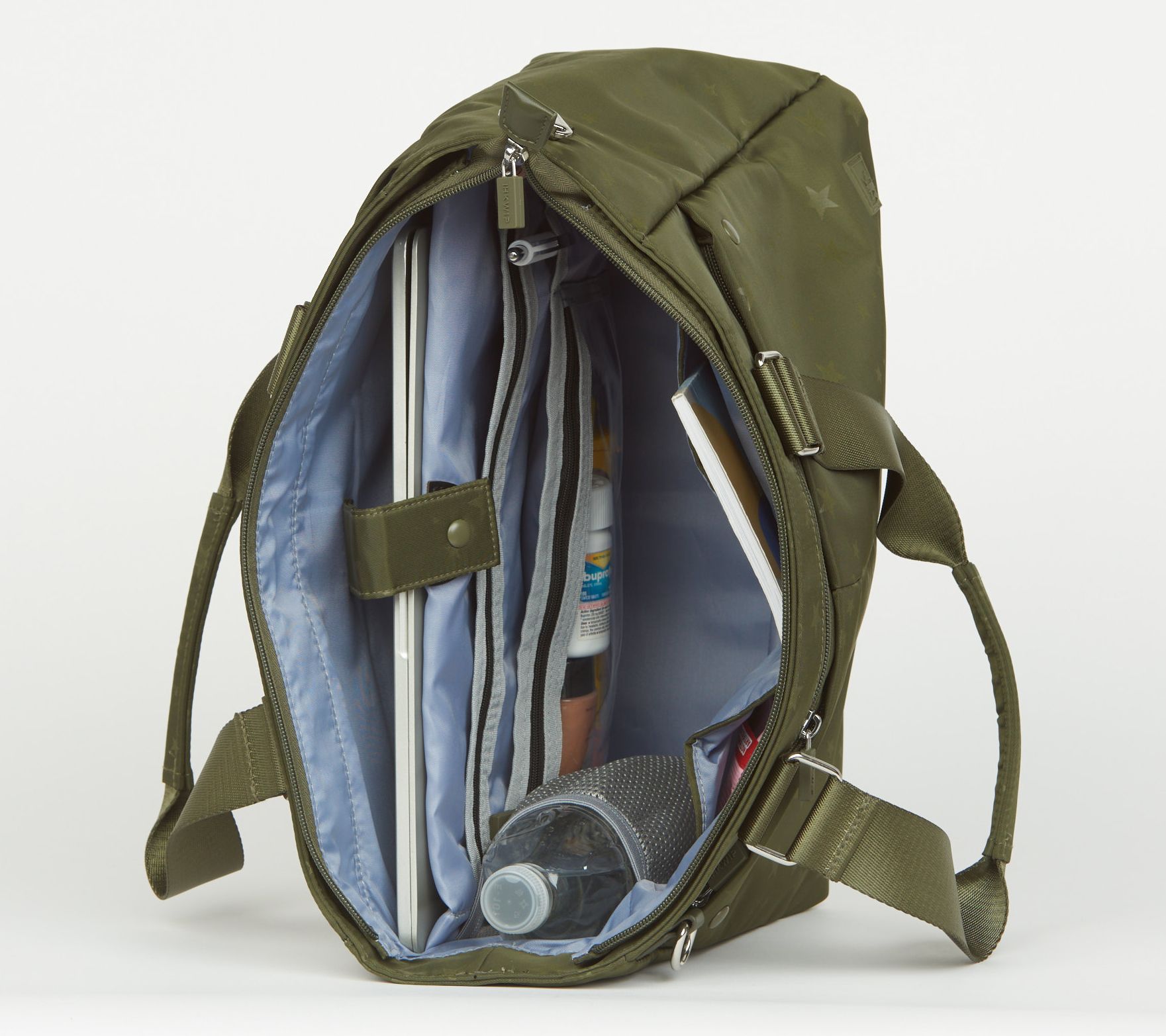 • Lined interior, zip pockets, slip pockets, padded laptop sleeve, bottle holder, clear pocket, pen holders, soft-lined cellphone and glasses zip pocket