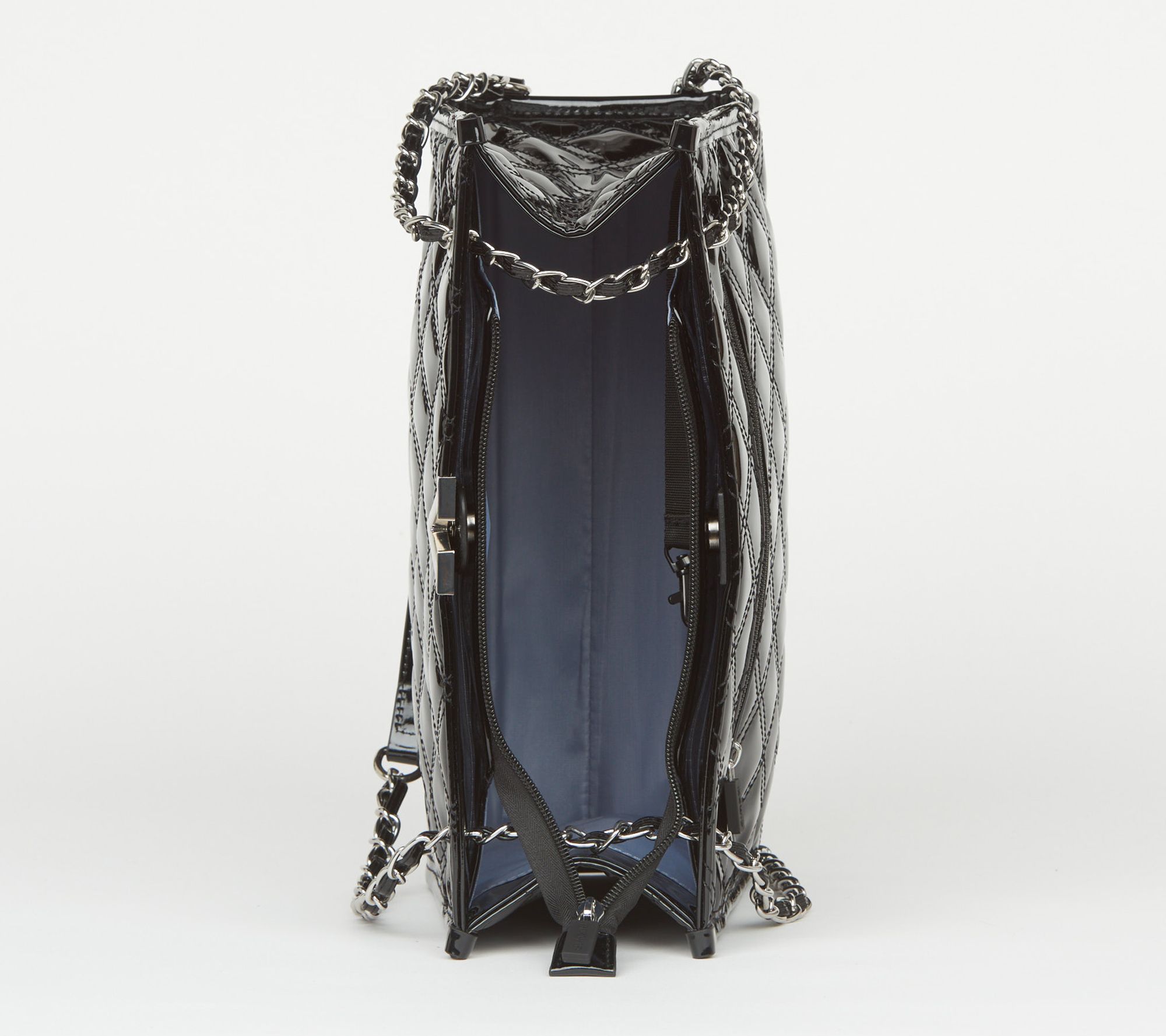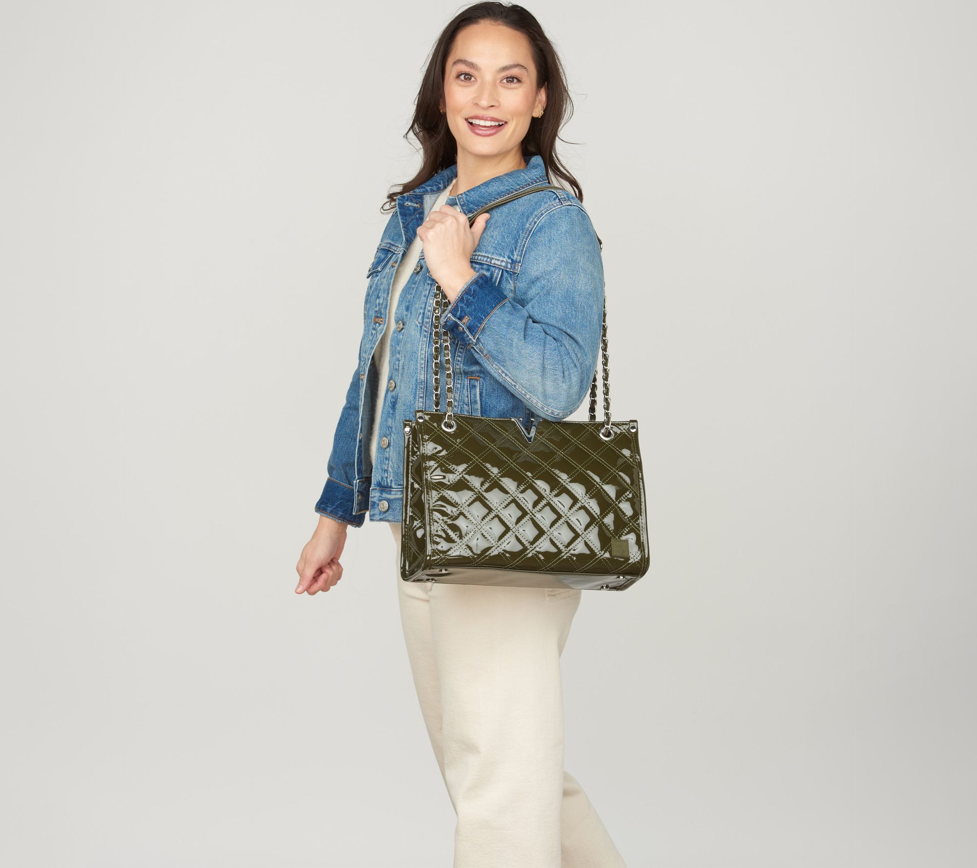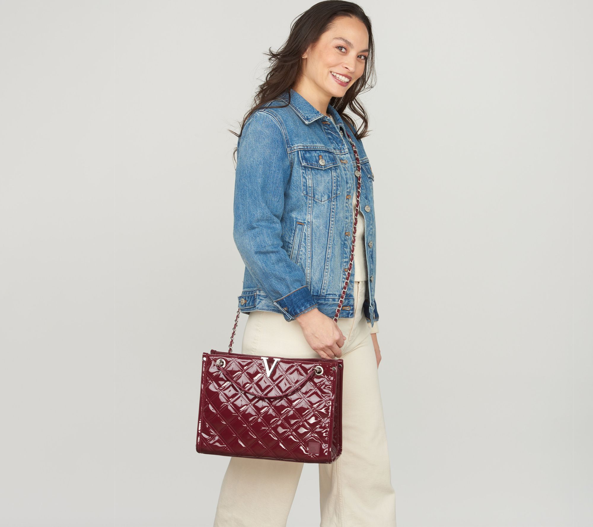 • Water-repellent quilted exterior, adjustable chain strap converts from shoulder to crossbody, Roman numeral V-hardware detail, purse feet, triple top closure with main zipper entry and two snap pockets, rear soft-lined zip pocket