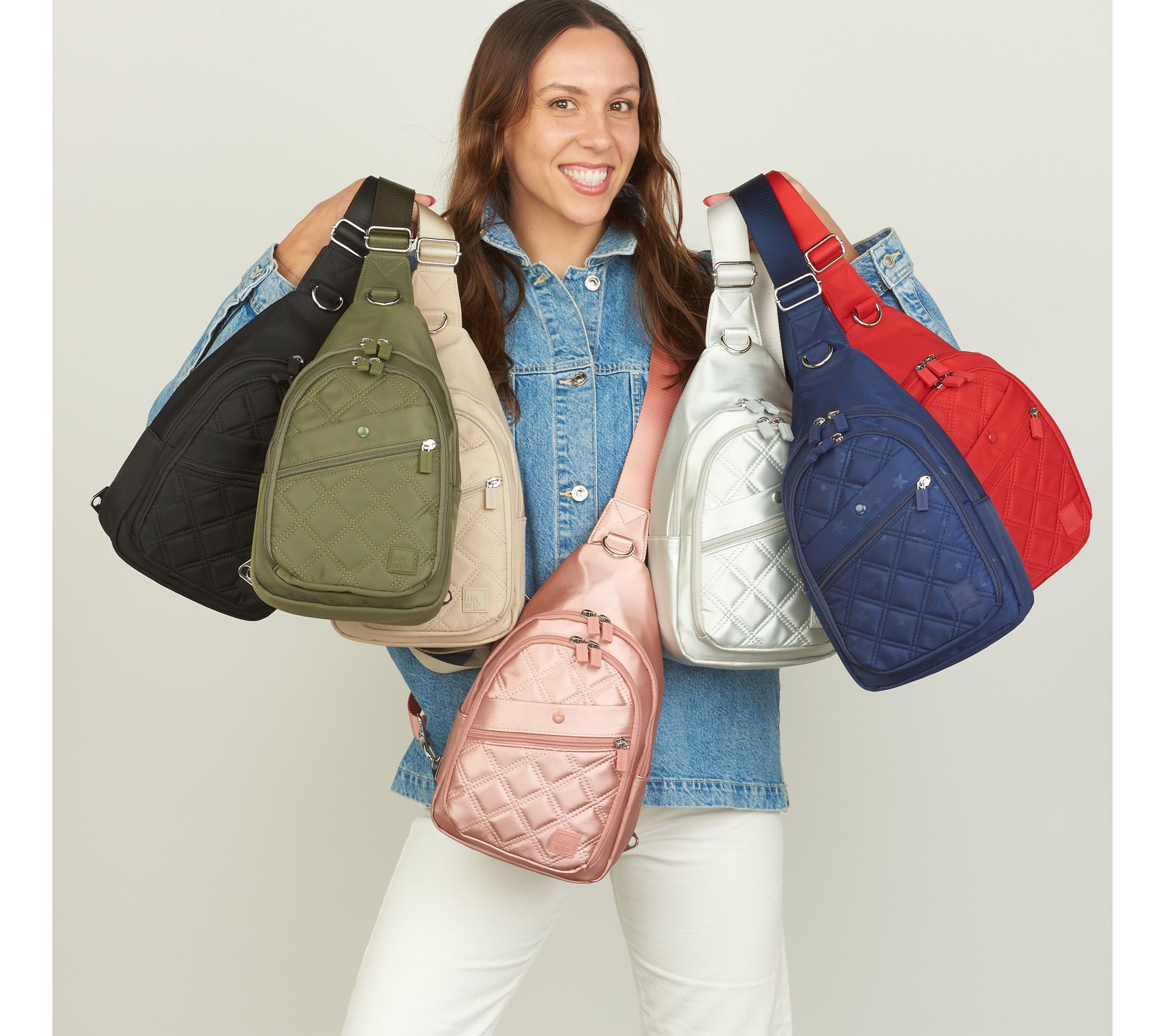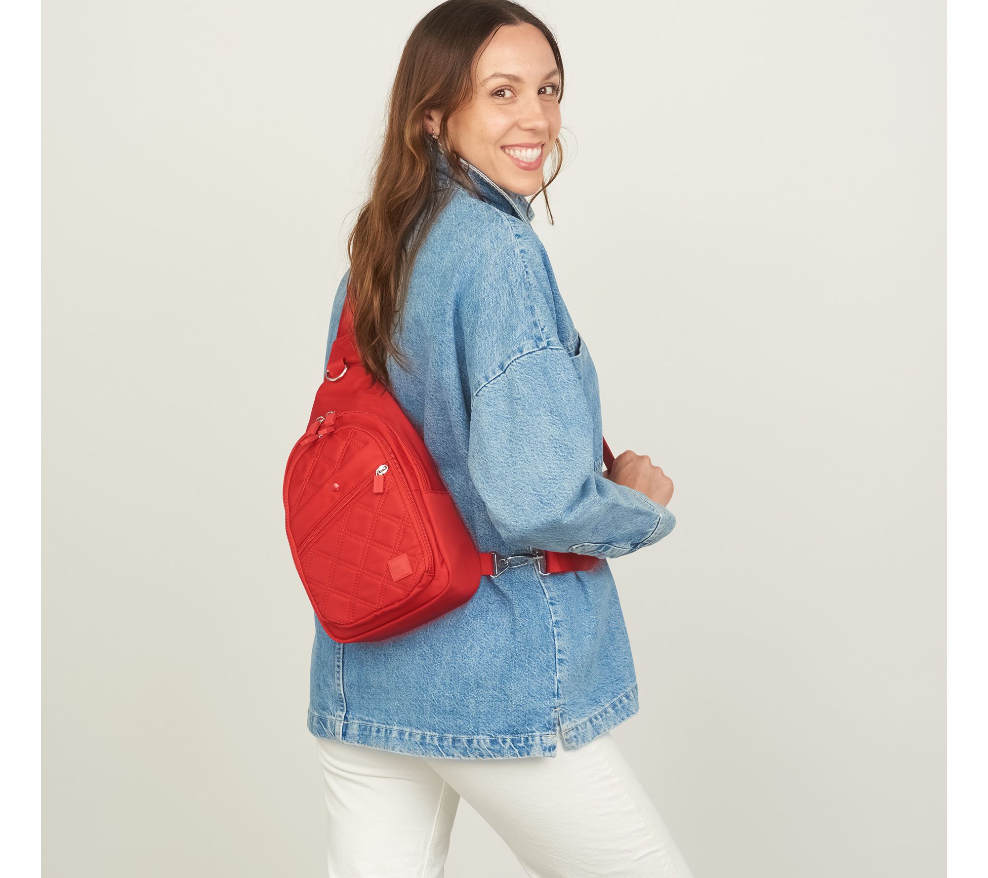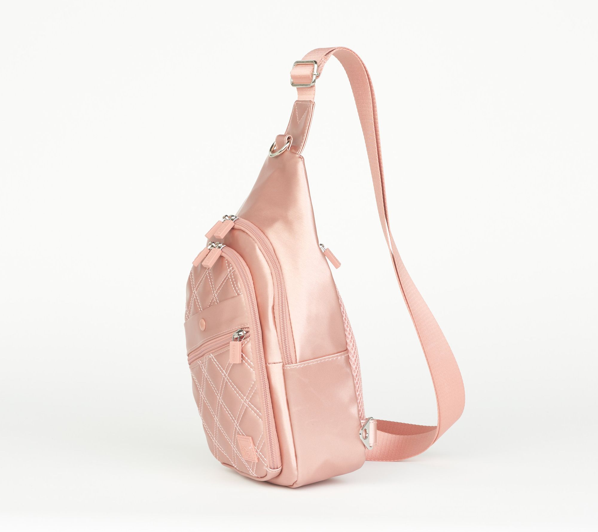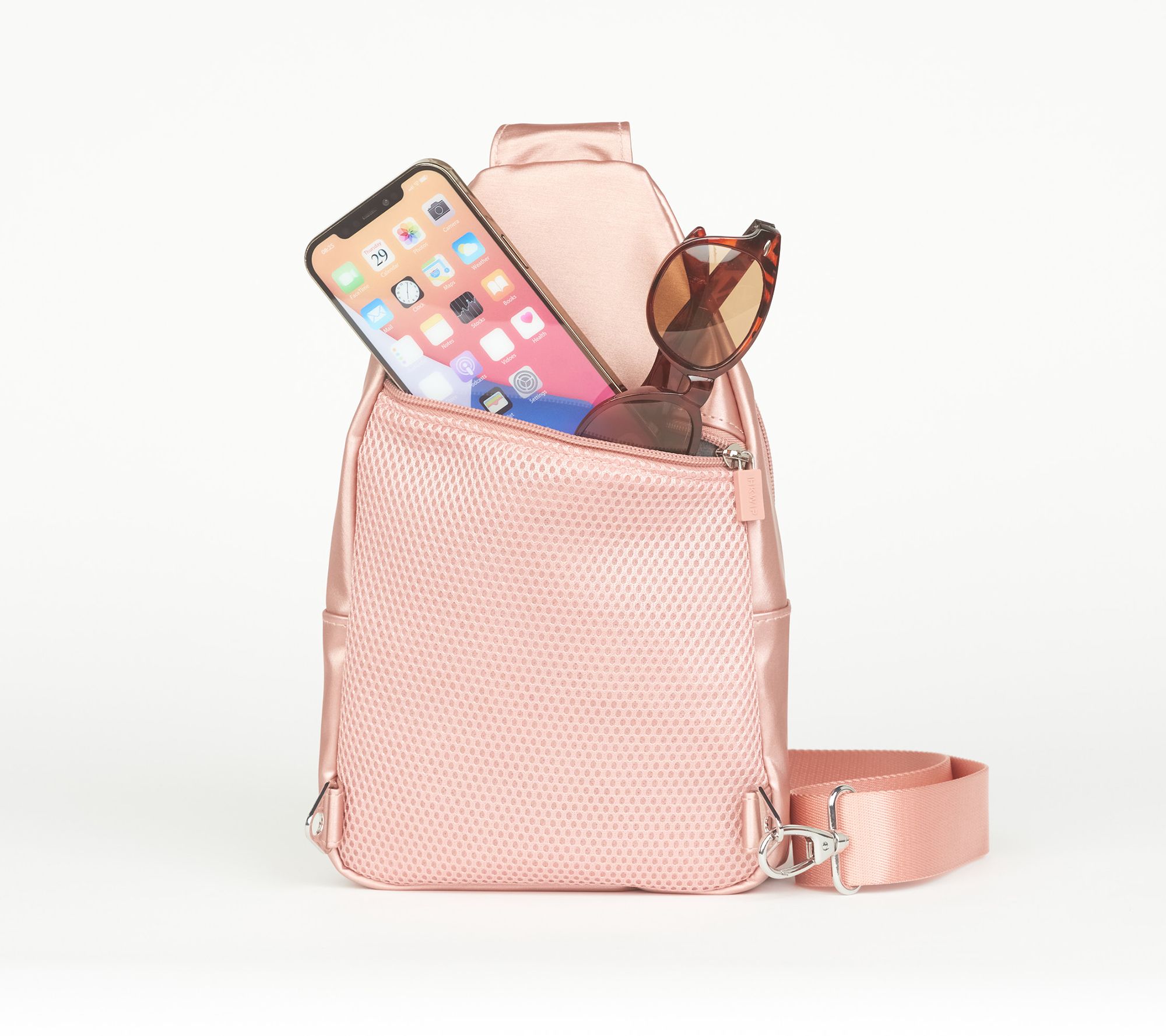 • Water-repellent exterior, adjustable strap, coverts from a backpack to a sling bag, front diagonal zip pocket, front magnetic-snap pouch pocket, main dual-zip pocket, front dual-zip gusseted pocket, rear zip pocket, top D-ring