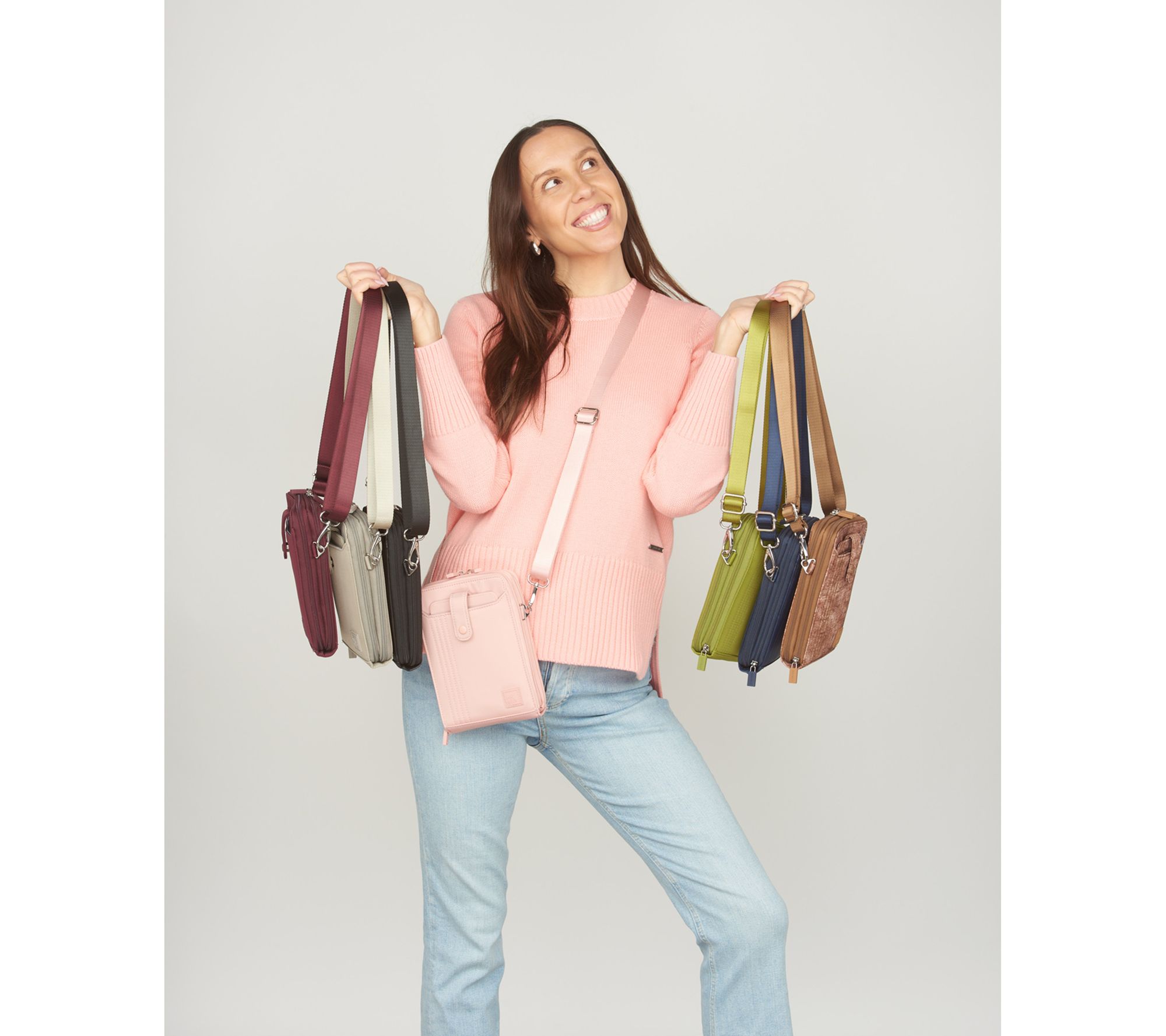 • Water-repellent exterior, north/south silhouette, converts from crossbody to belt bag or wallet, removable/adjustable strap, dual zip compartments with gusseted sides, back zip pocket