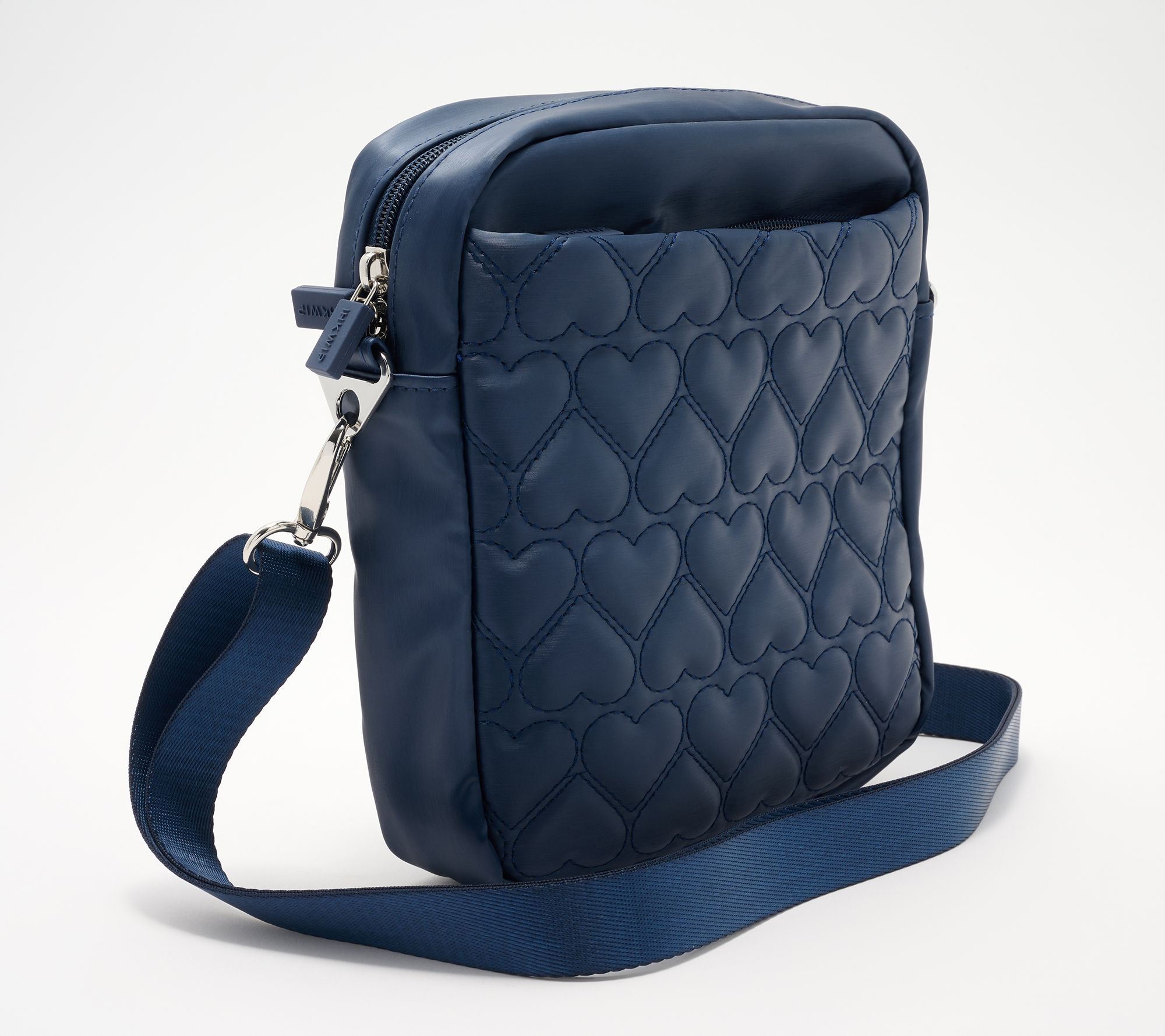 • Quilted heart pattern, removable and adjustable crossbody strap, dual zip-top closure, front flap pocket, rear exterior zip pocket