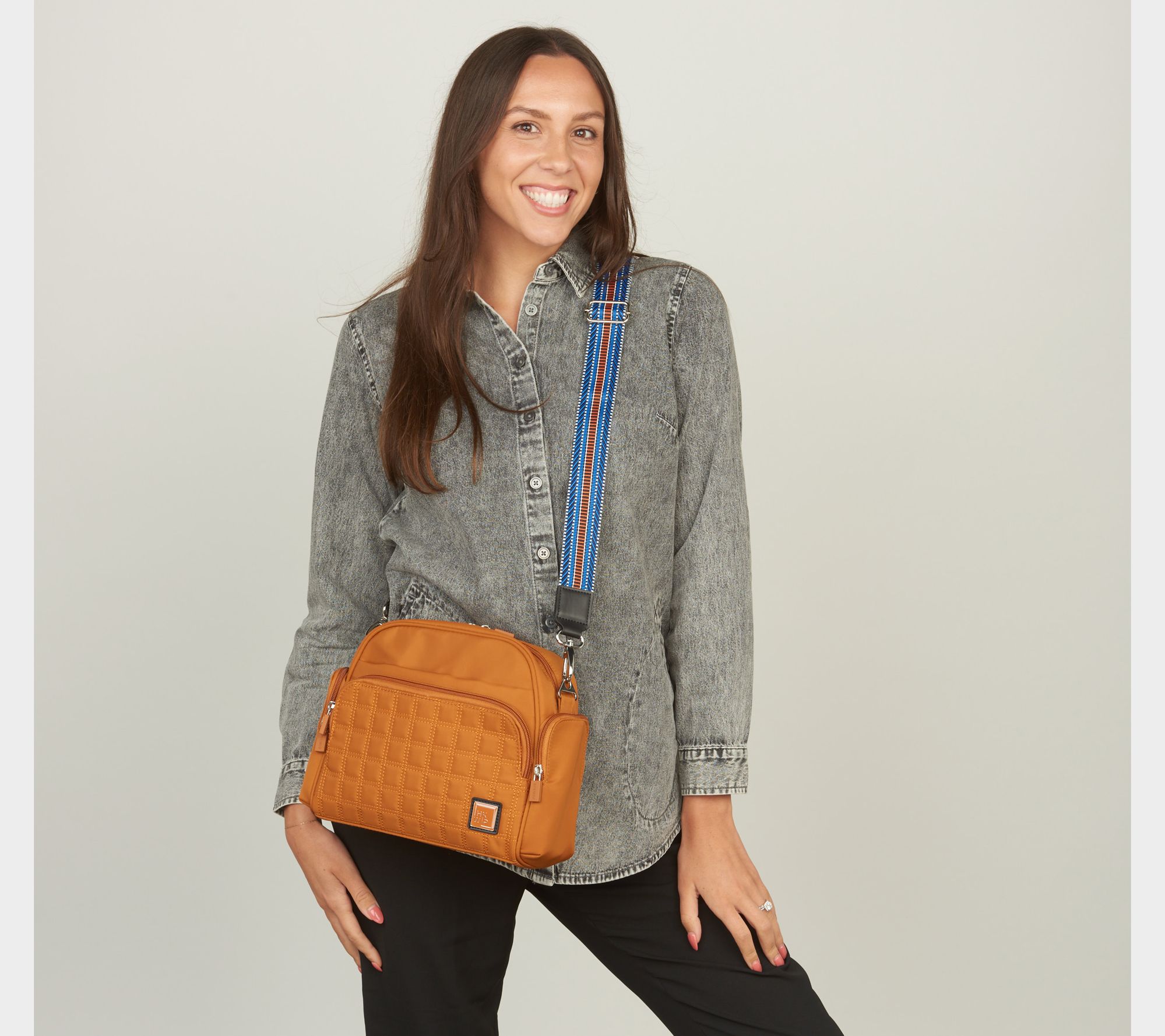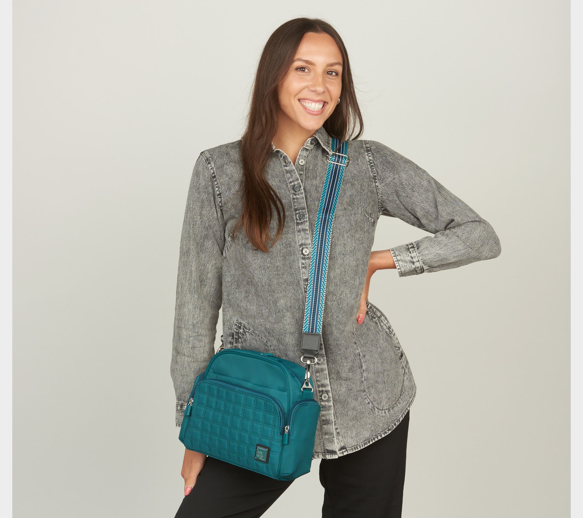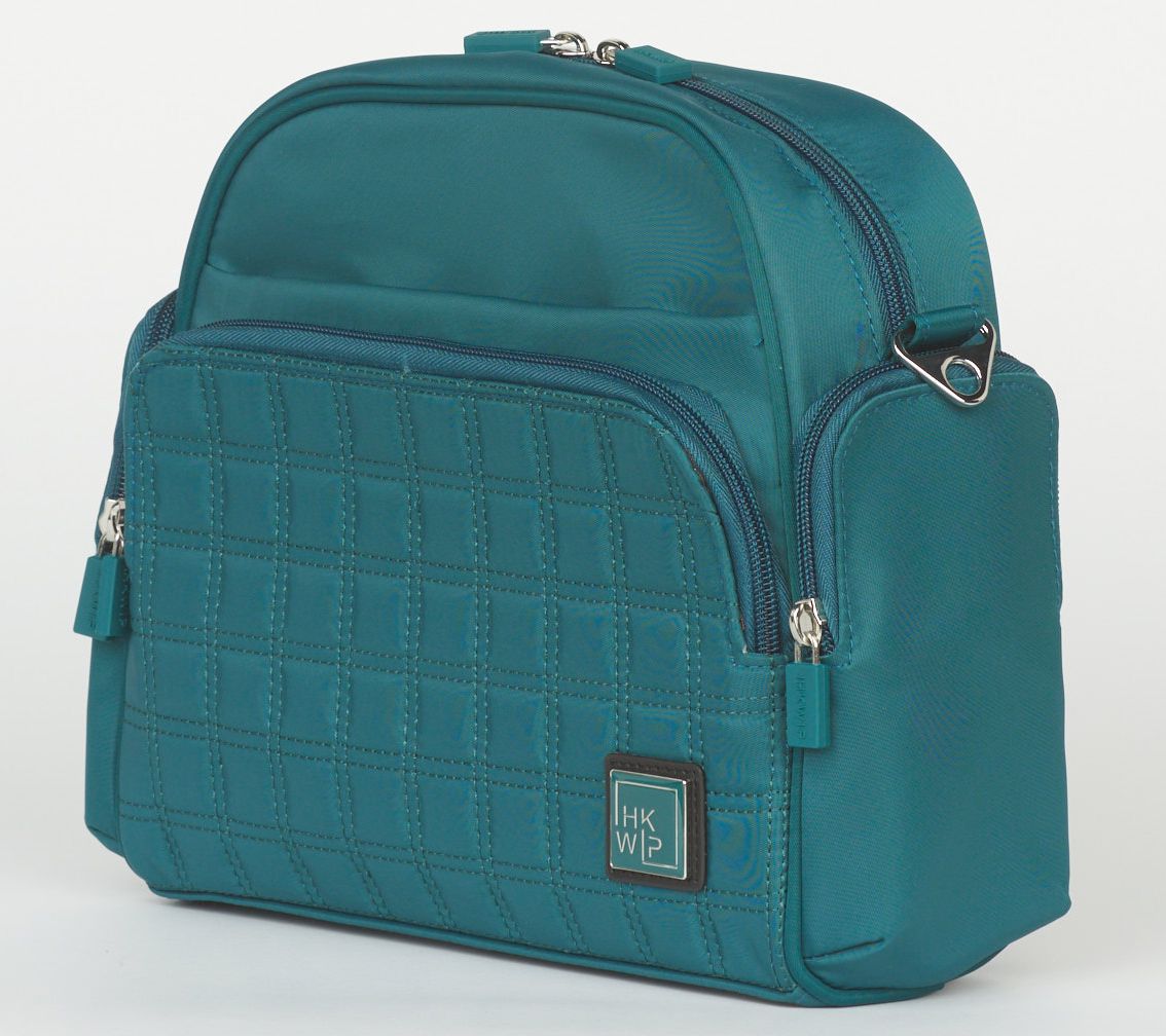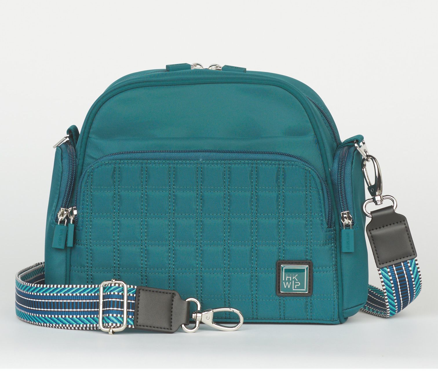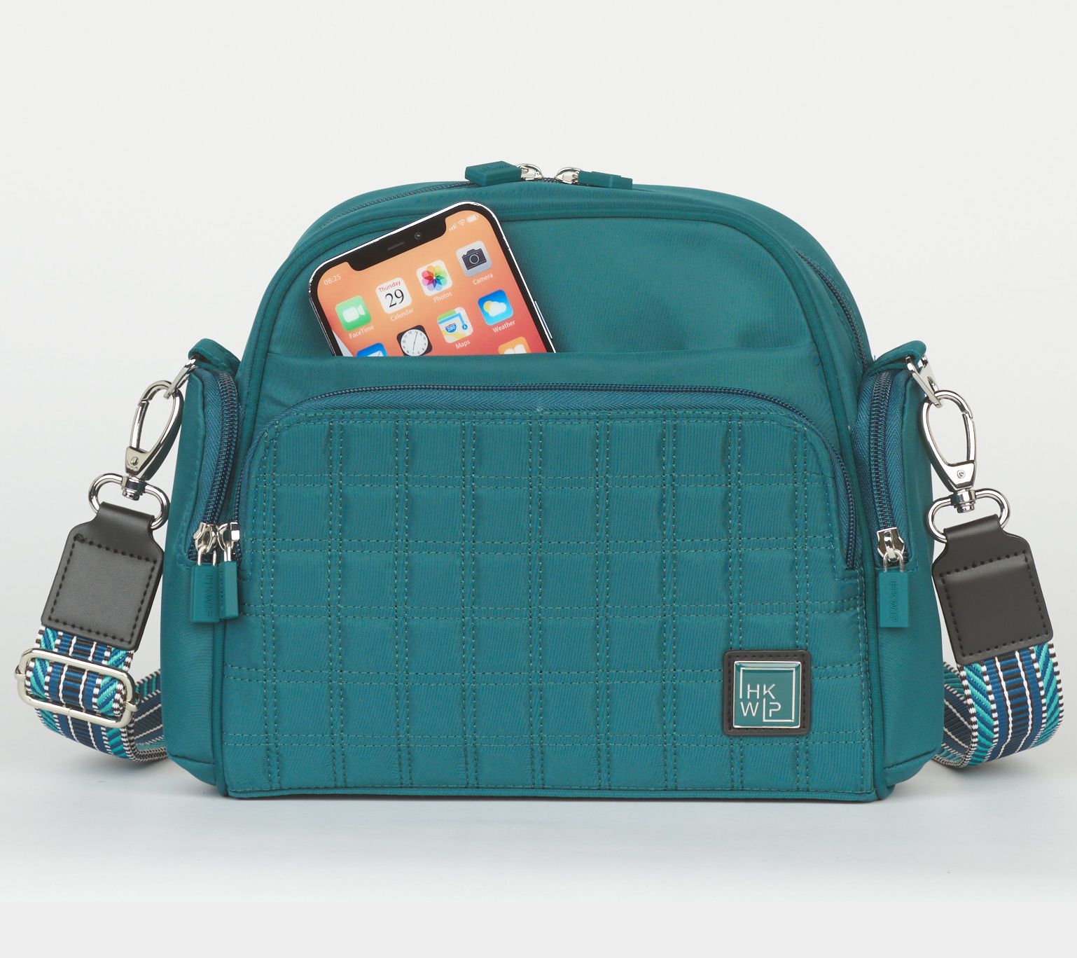 • Quilted front compartment with wallet and card slots, removable and adjustable jacquard-pattern strap, soft-lined slip pocket for phone or glasses storage, zipper closure