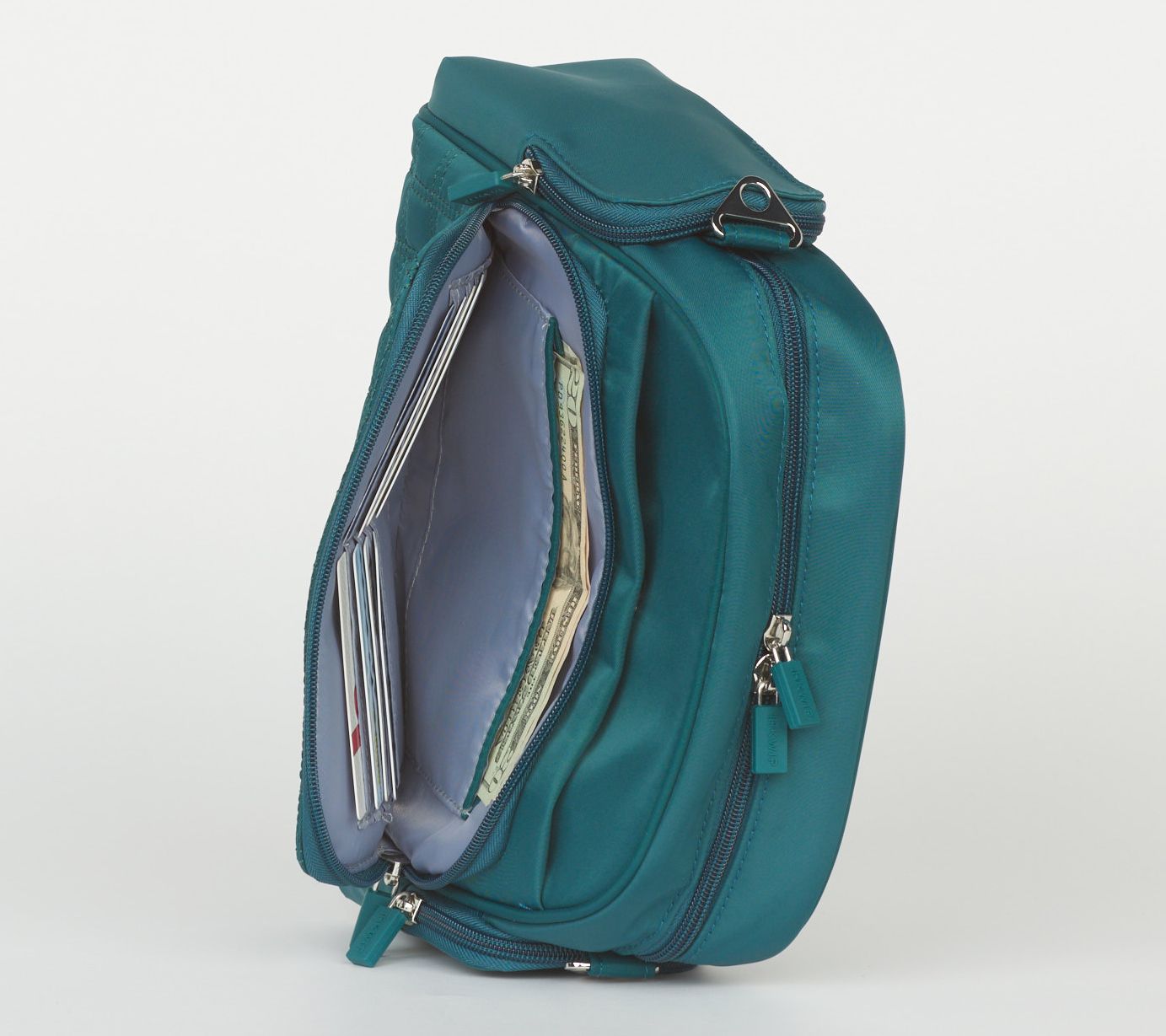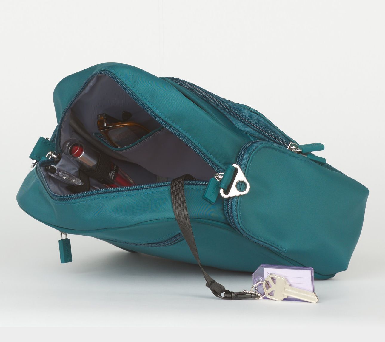 • Lined interior, key leash, slip pockets, zip pocket, and pen/lipstick loop holder