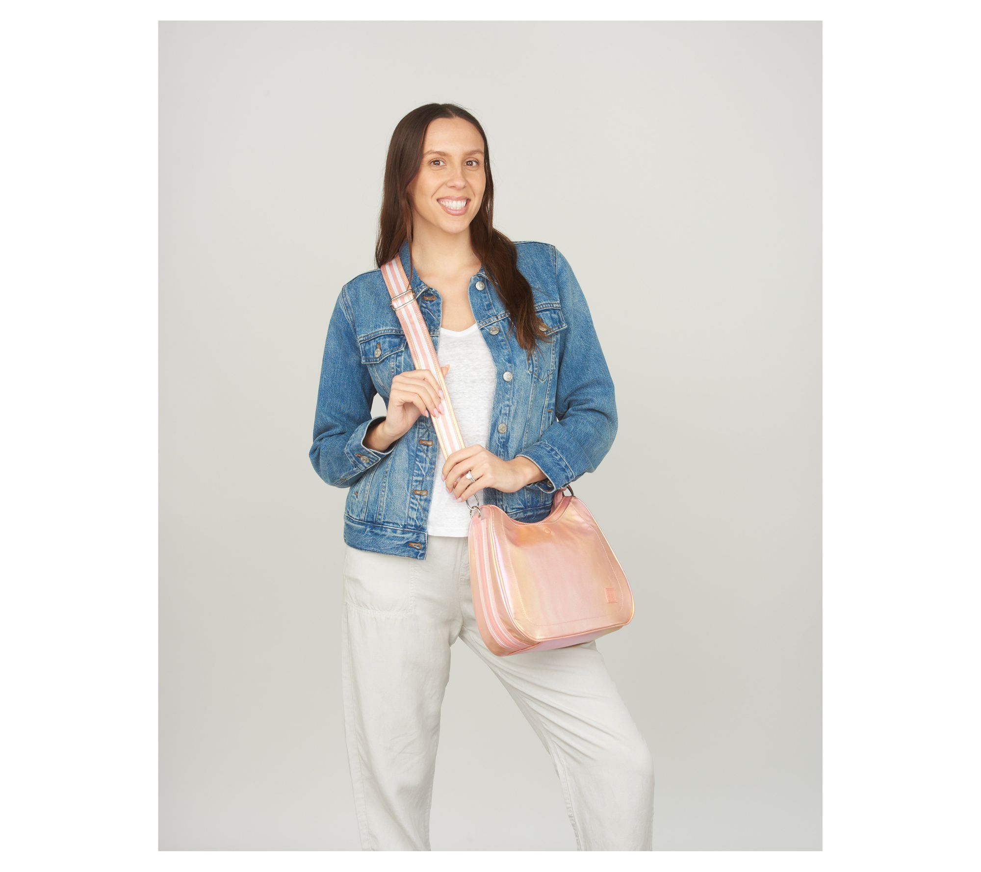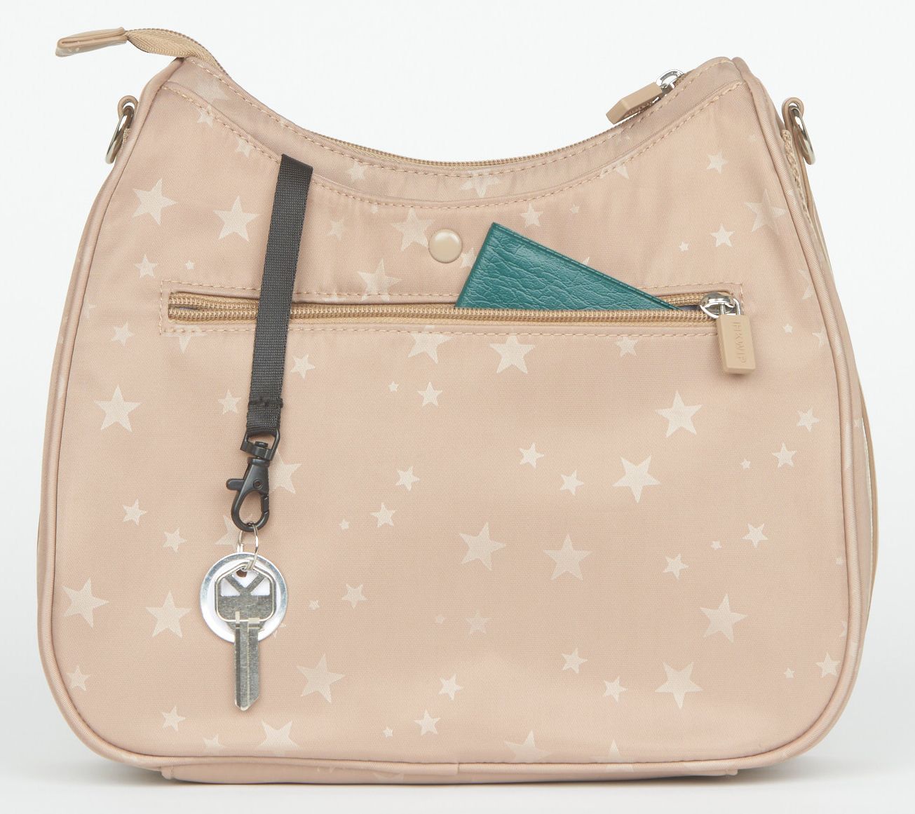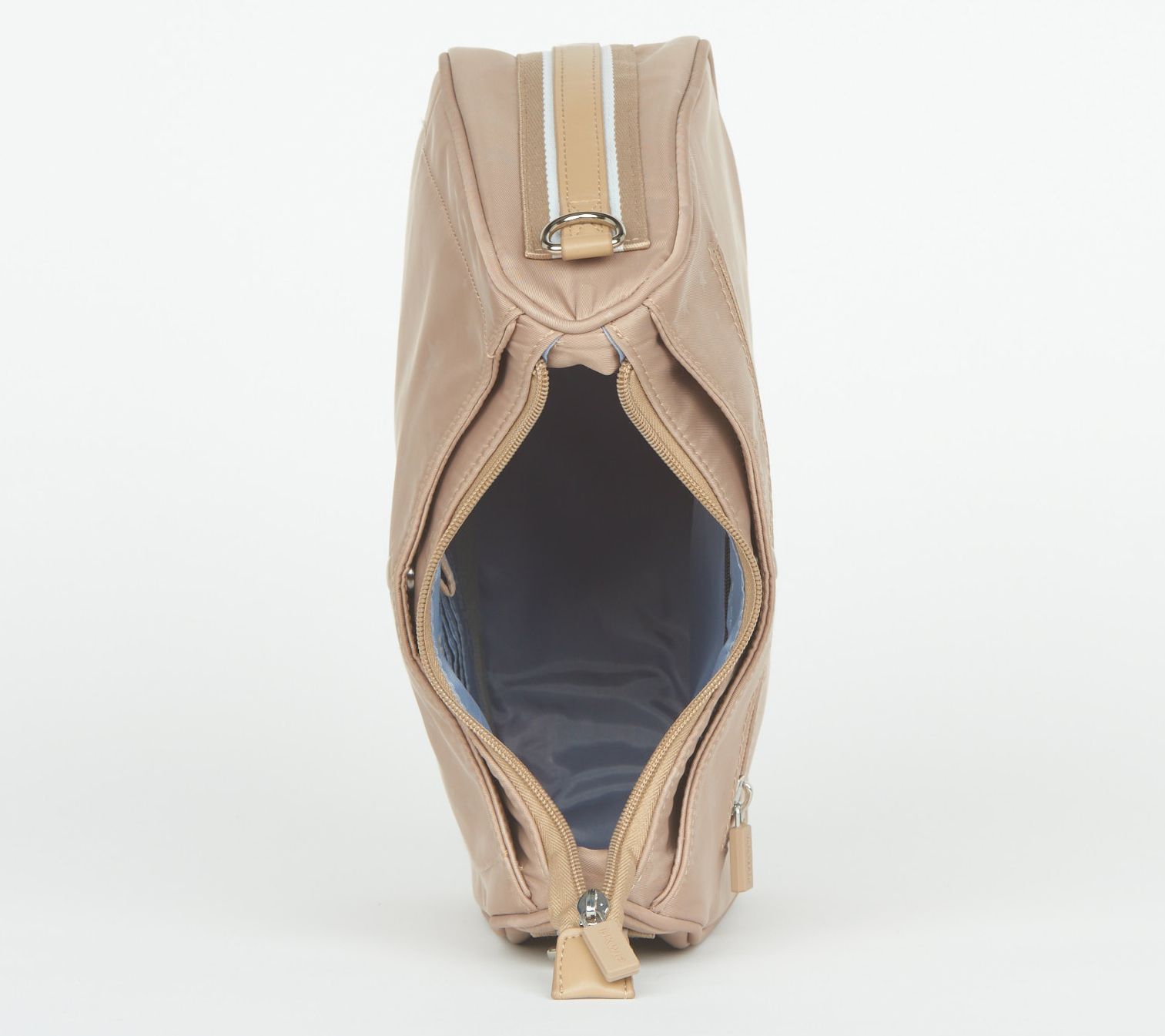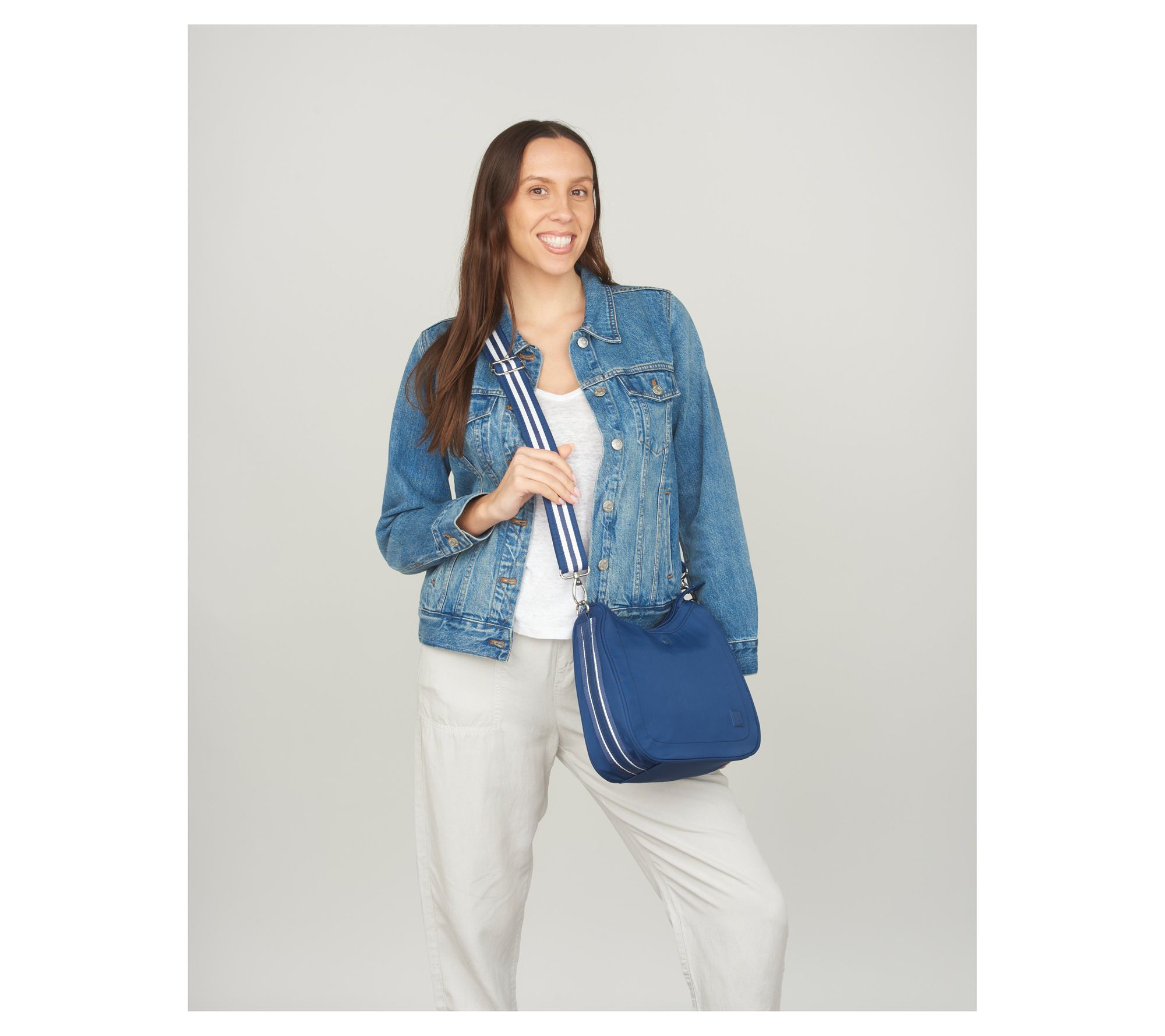 • Water-repellent exterior, rear soft-lined phone and glasses zip pocket, contrast-striped fashion crossbody strap, zip-top closure, two snap-closure compartments