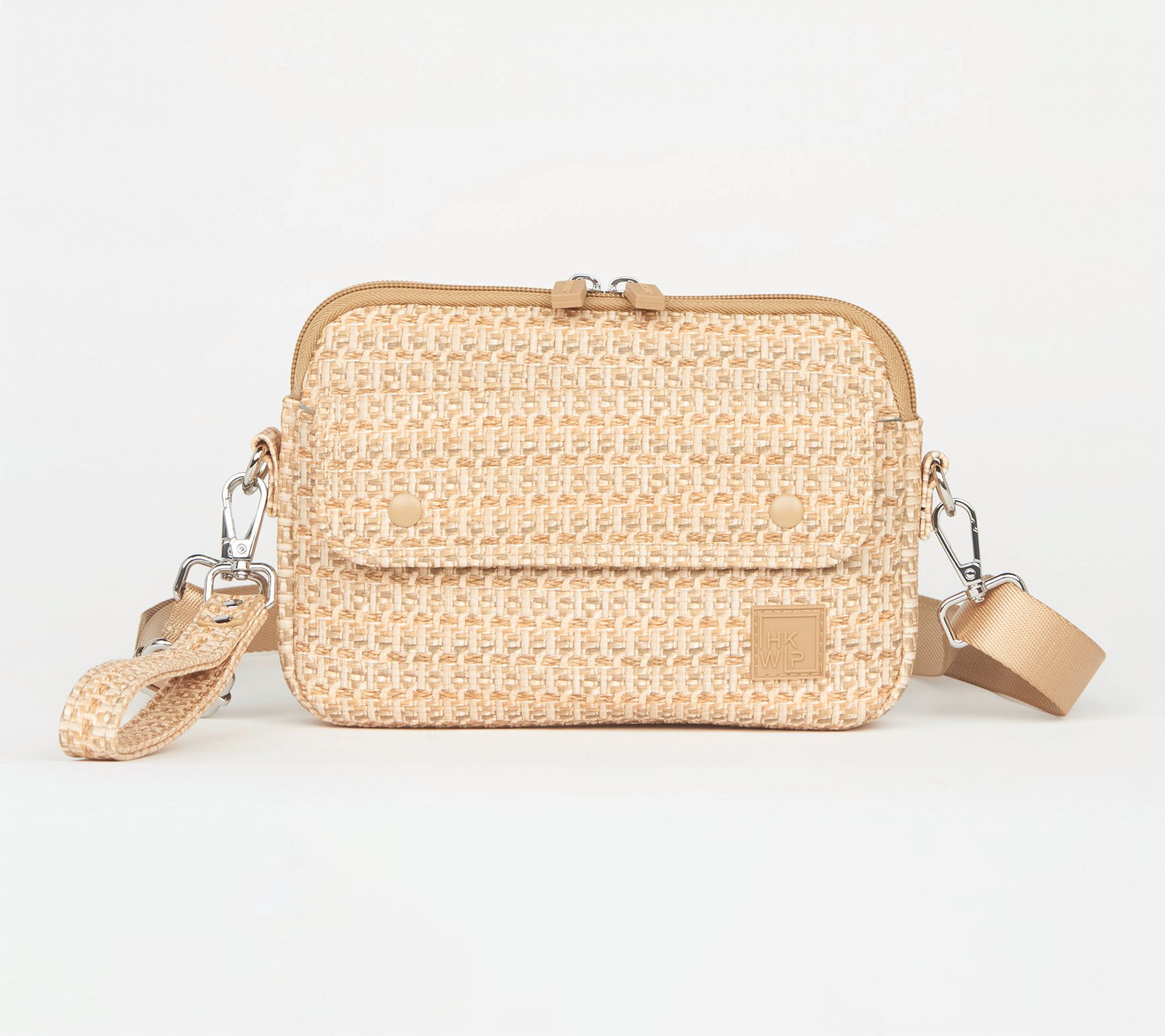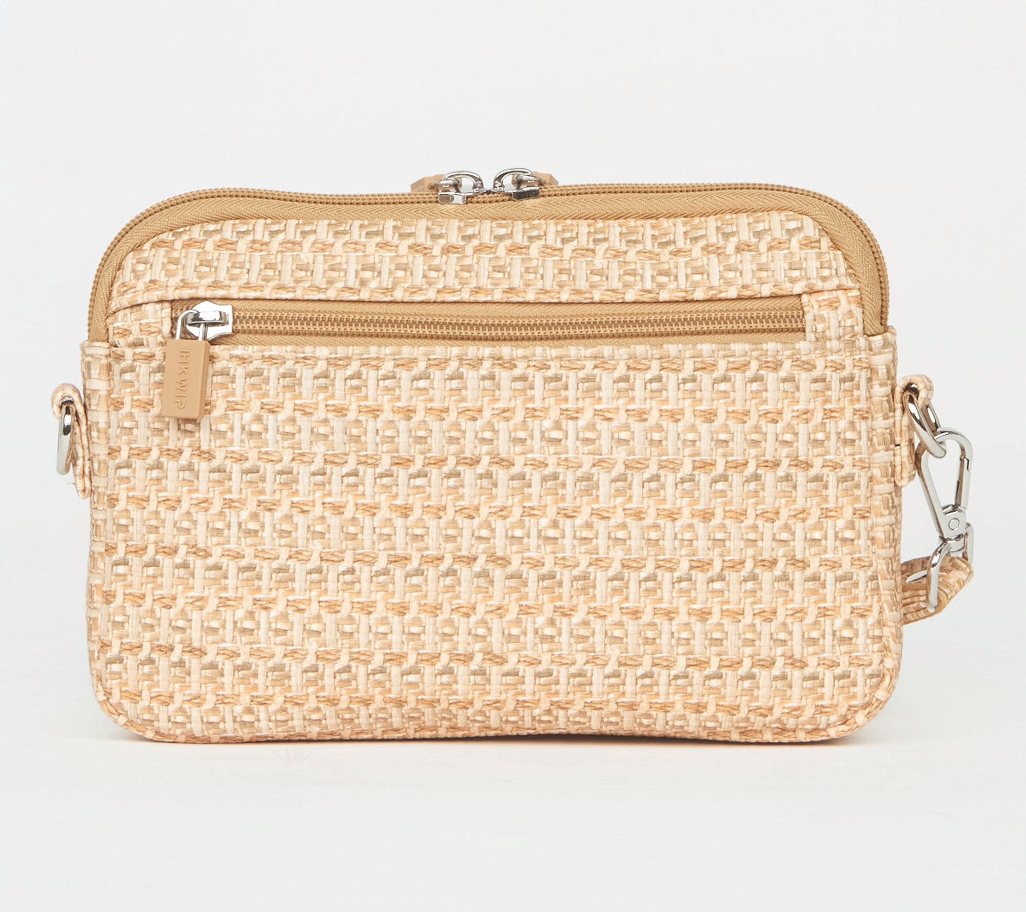 • Removable/adjustable crossbody strap, wristlet strap, double button front soft-lined pocket, dual zip main entry, rear zip pocket