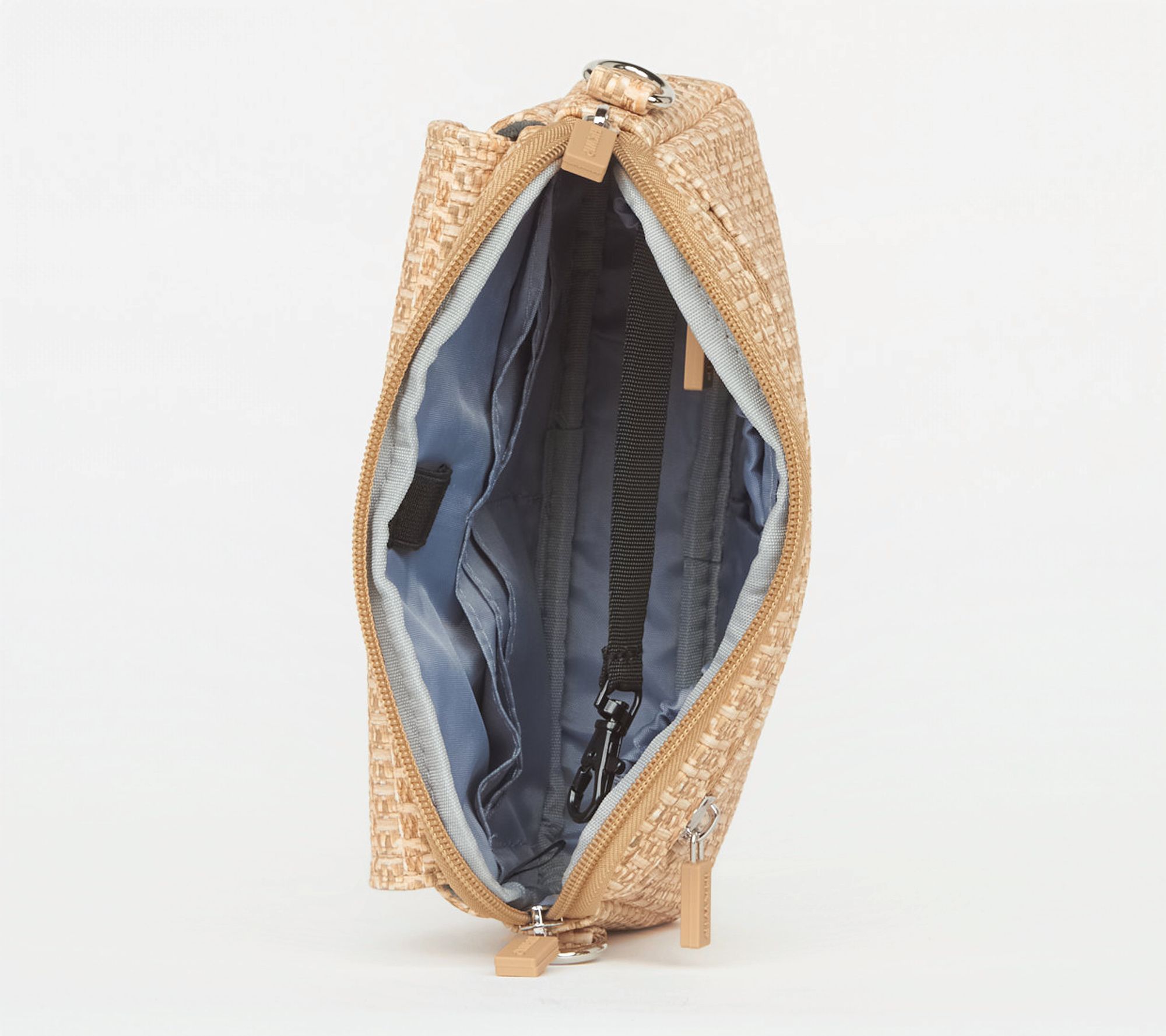 • Card slots, pen loop, two elastic interior pockets, interior zip pocket, key clip leash