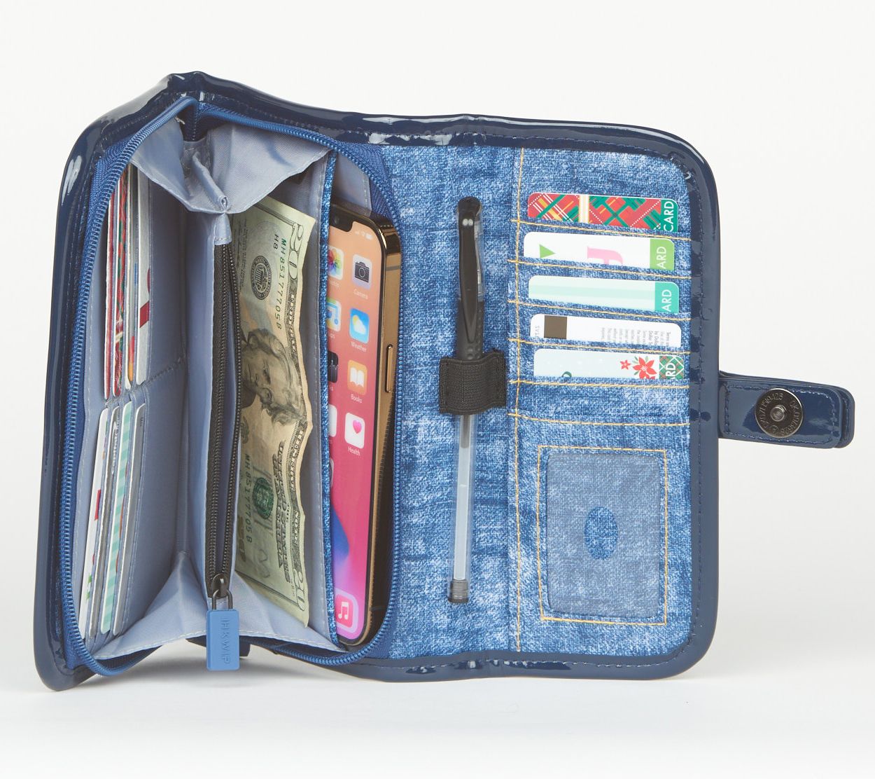 • 13 built-in RFID-protected card slots with clear ID window and cash sleeve, elastic pen loop and interior zip compartment, gusseted interior zip with RFID card slots, zip pocket and slip pocket