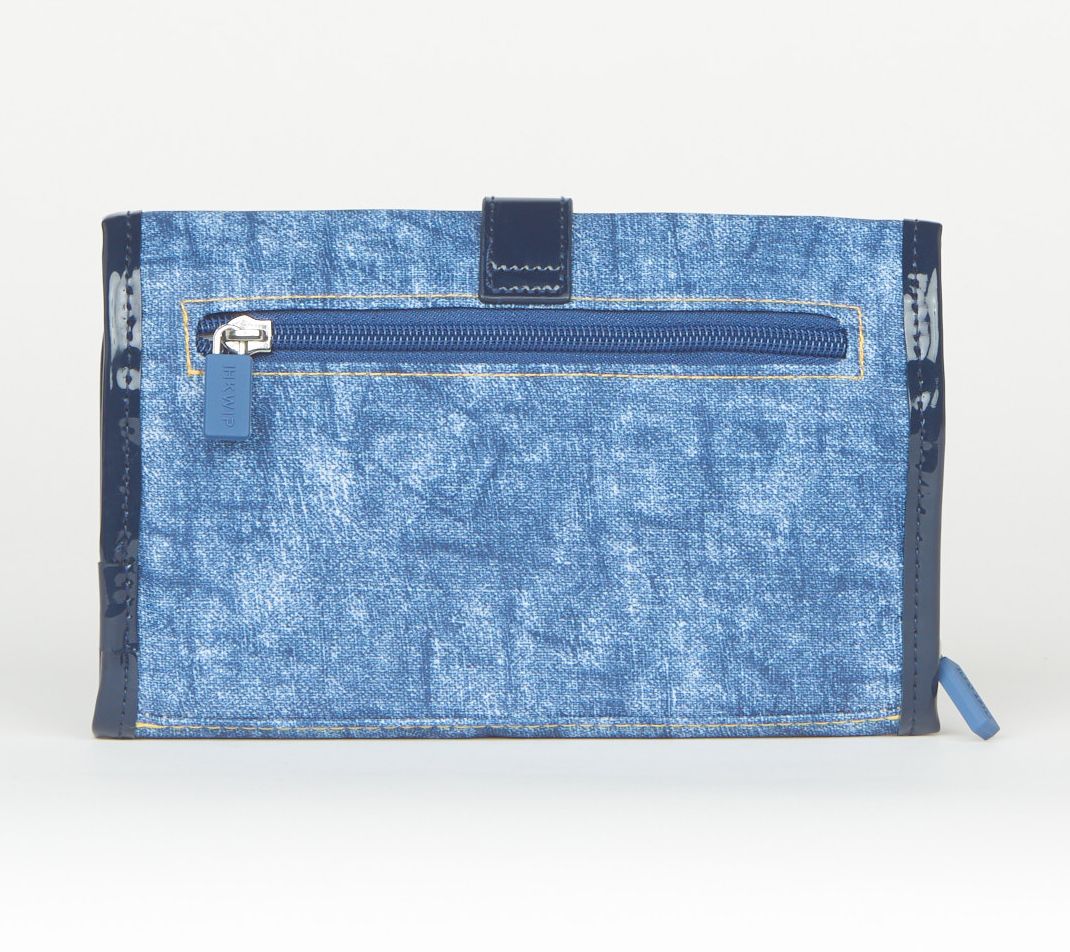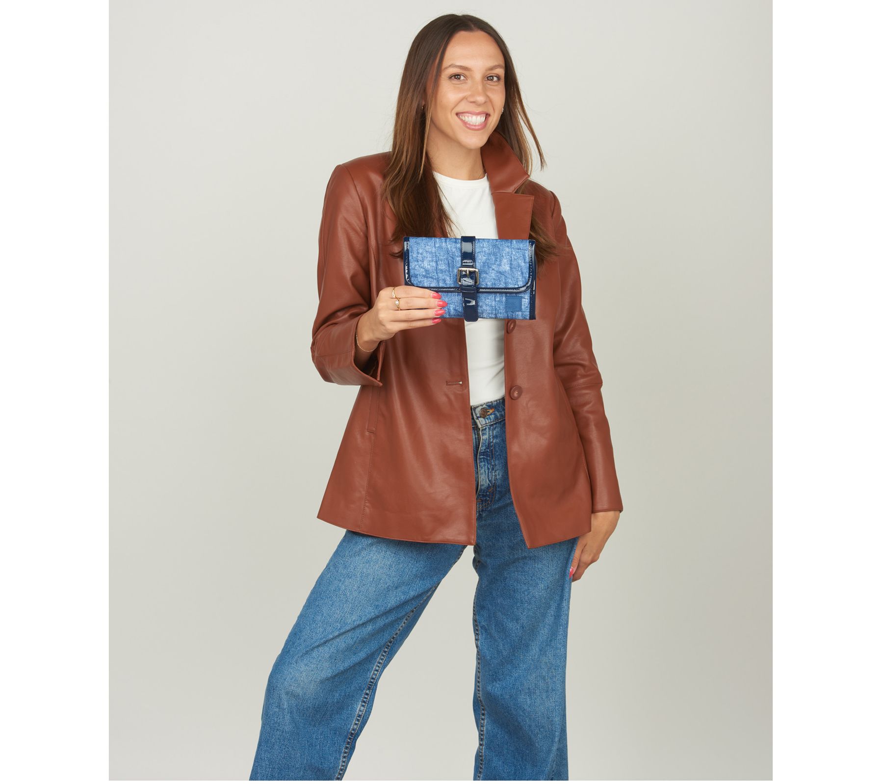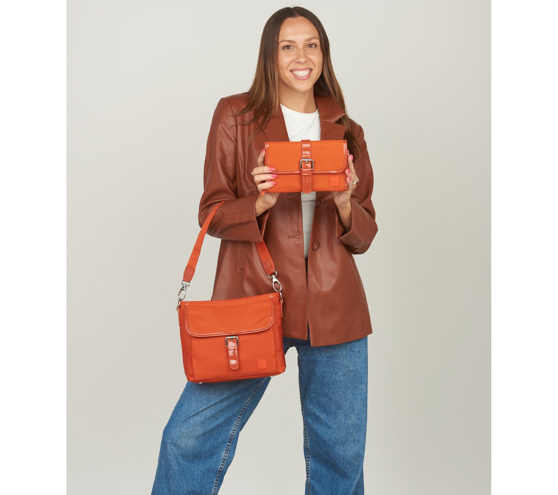 • Front magnetic snap entry with buckle detail, rear zip pocket