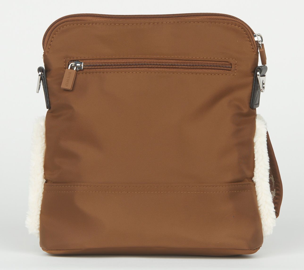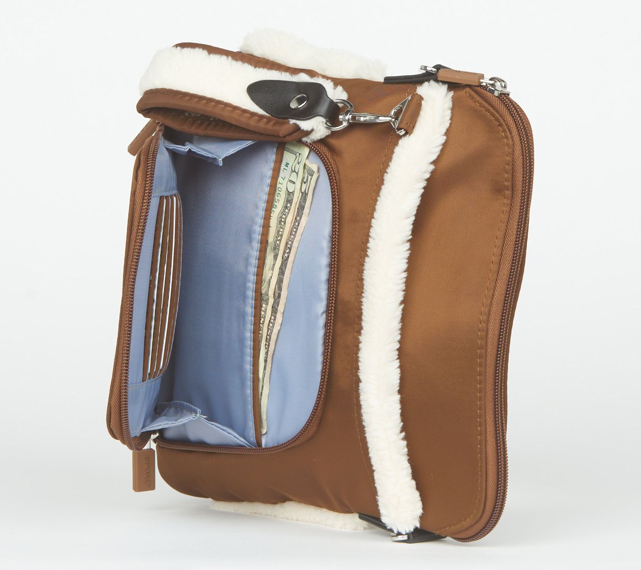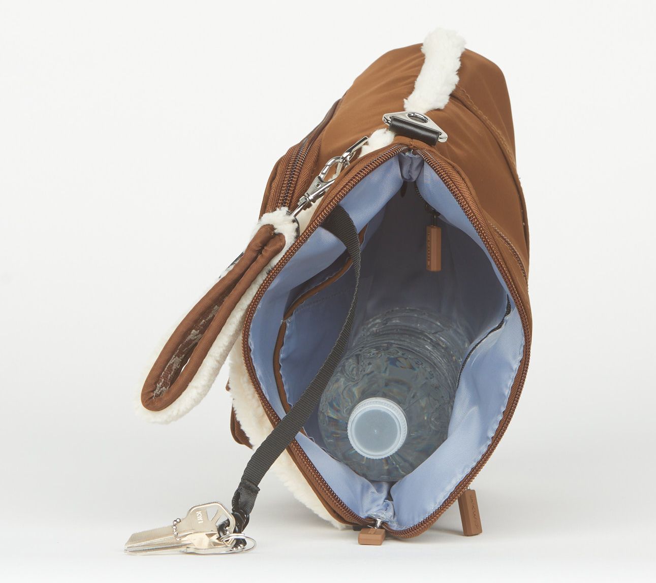 • Convertible design can be worn as a crossbody or shoulder bag, sherpa trim on bag and removable keychain clip, removable/adjustable houndstooth pattern, soft-lined pocket, built-in wallet with RFID card slots and bill sleeve