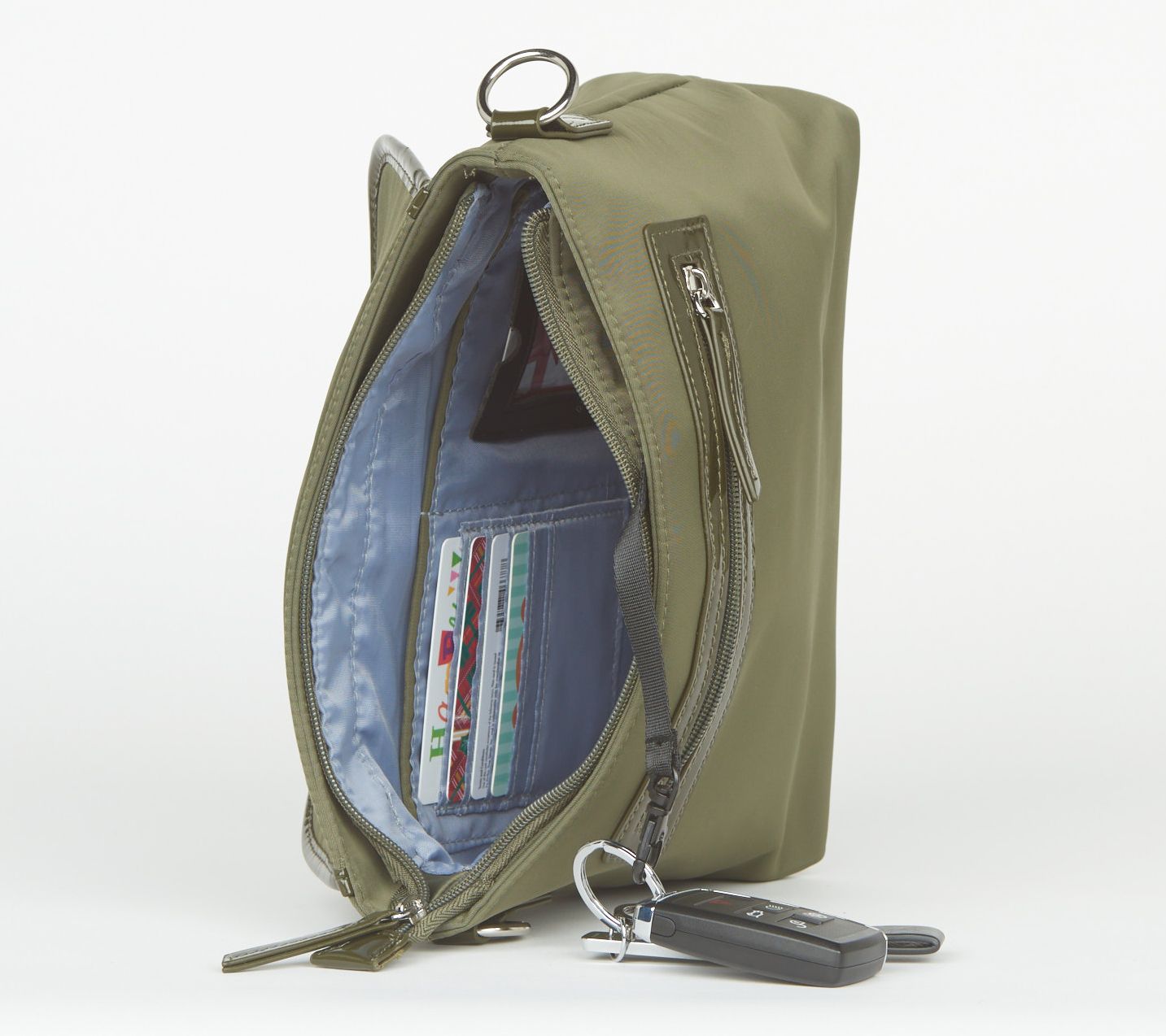 • Lined interior, back-wall magnetic snap pouch with two elastic pen loops and key clip leash, two slip pockets, five RFID card slots, zip pocket, clear ID window