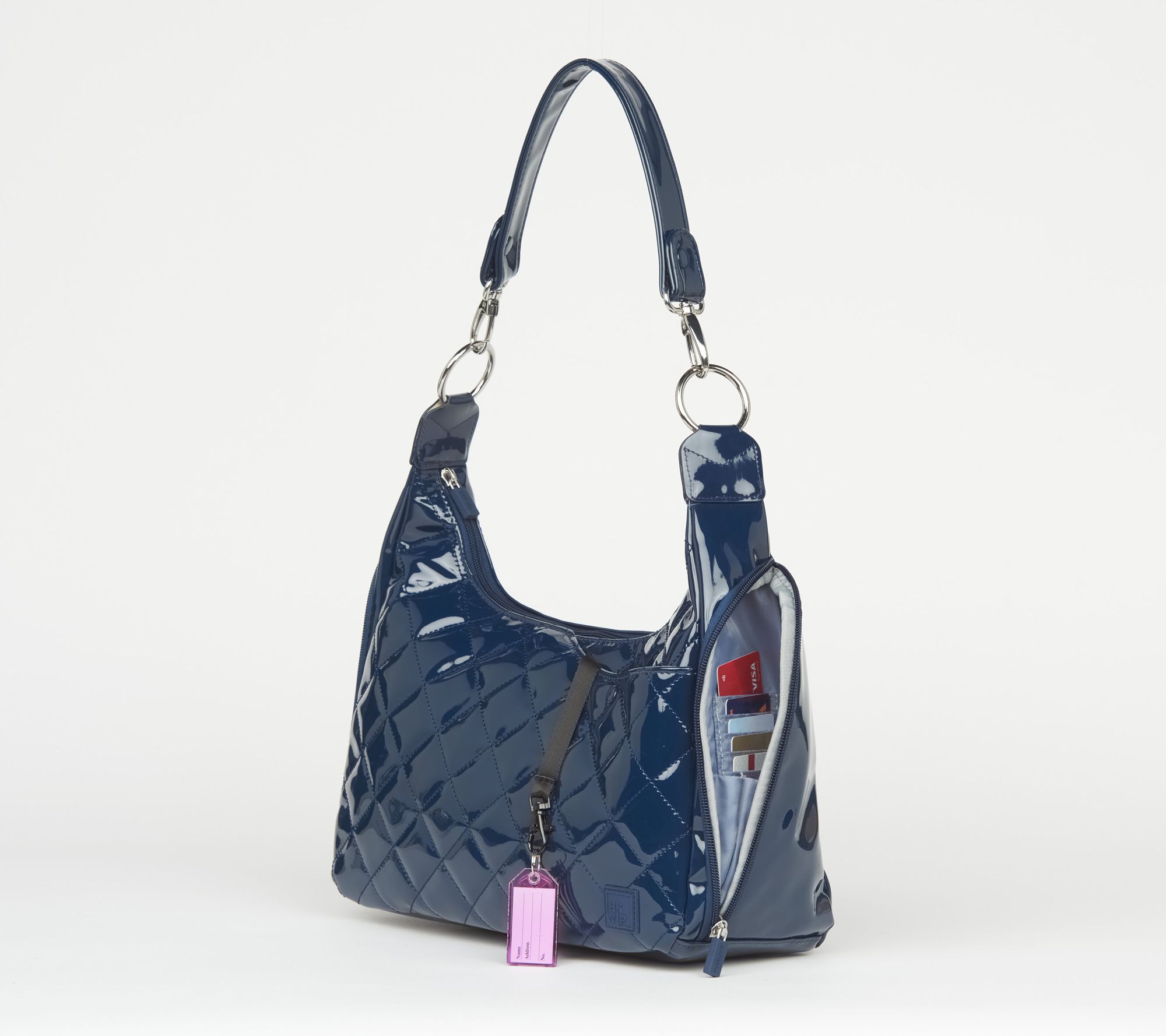 • Water-repellent exterior, quilted, removable/adjustable crossbody strap, removable shoulder strap, front snap pocket with key clip leash, rear soft-lined zip pocket; side zip pocket with pen holders, side zip pocket with RFID card slots