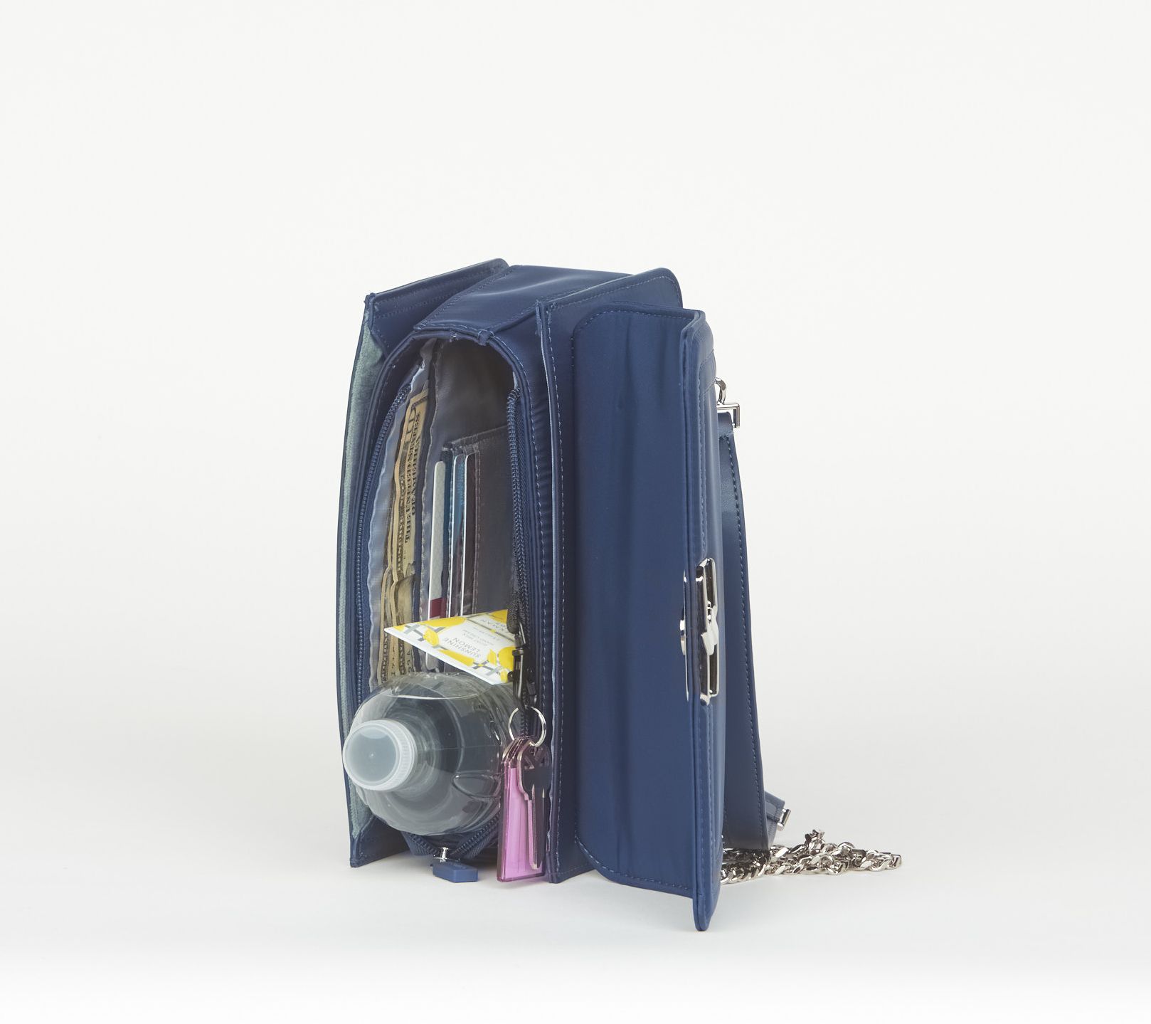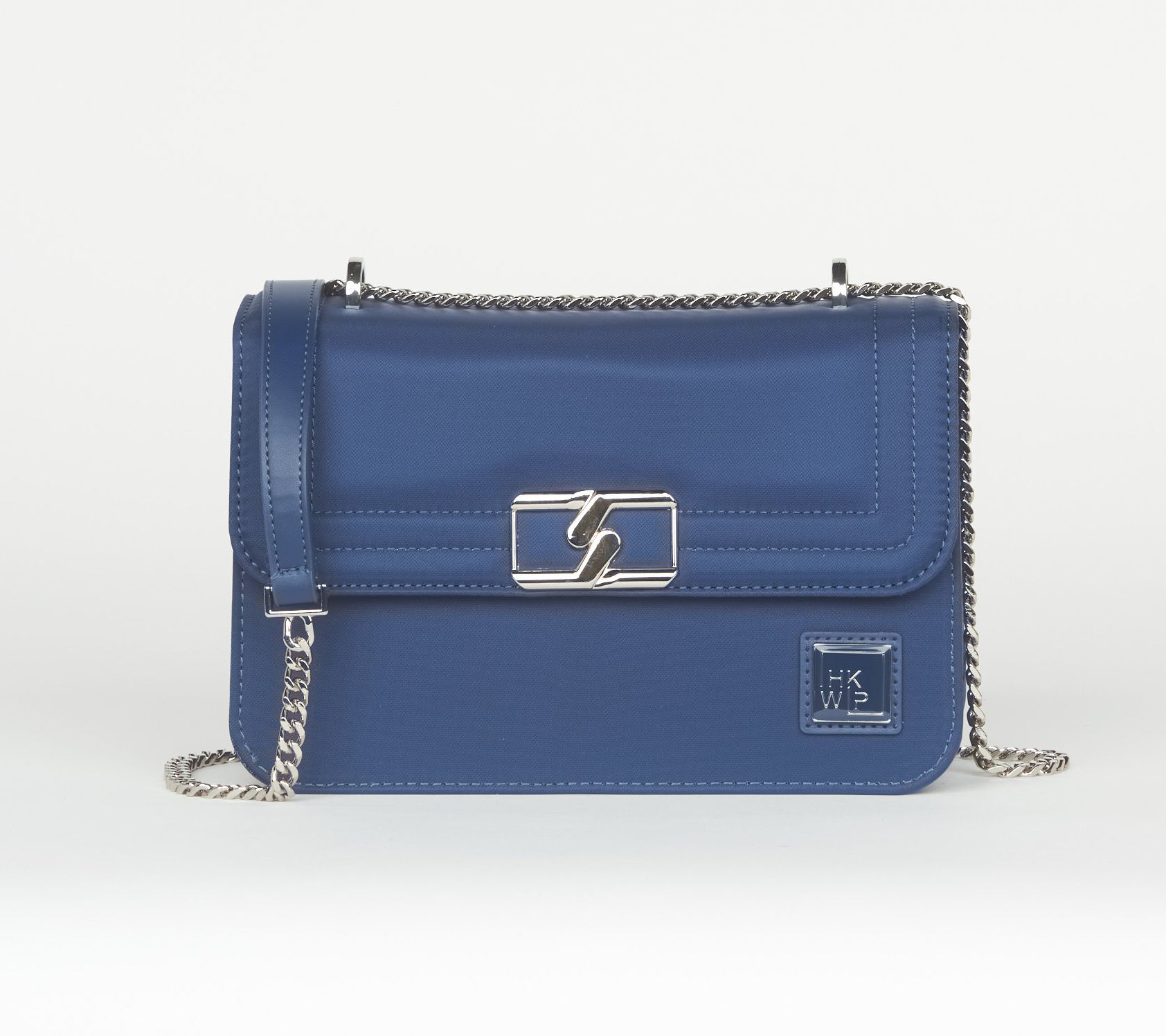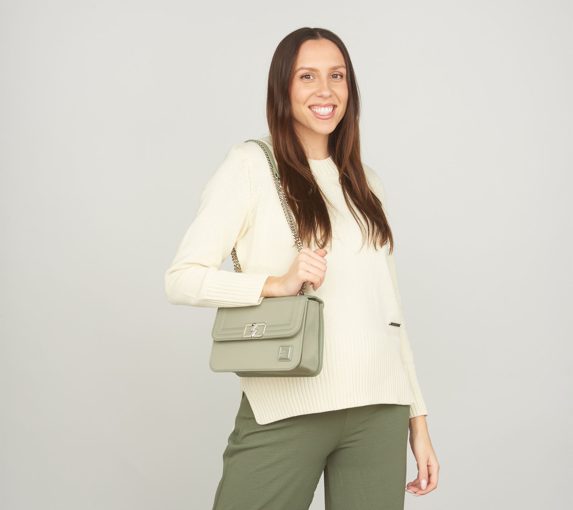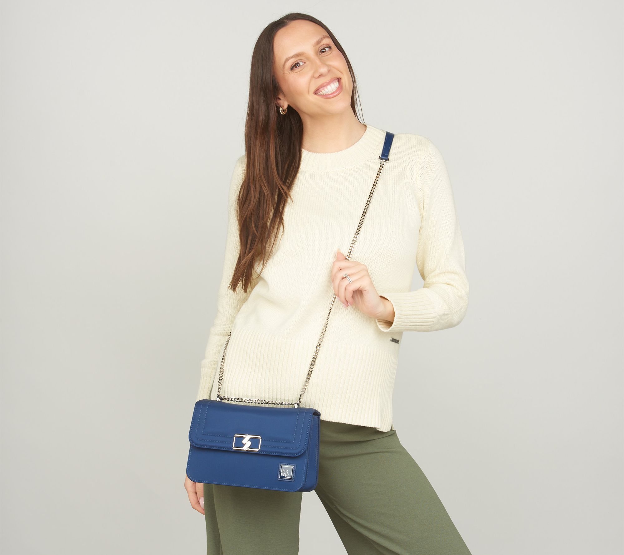 • Water-repellent exterior, adjustable chain strap with handle, converts from crossbody to shoulder bag, front flap, zip-top closure