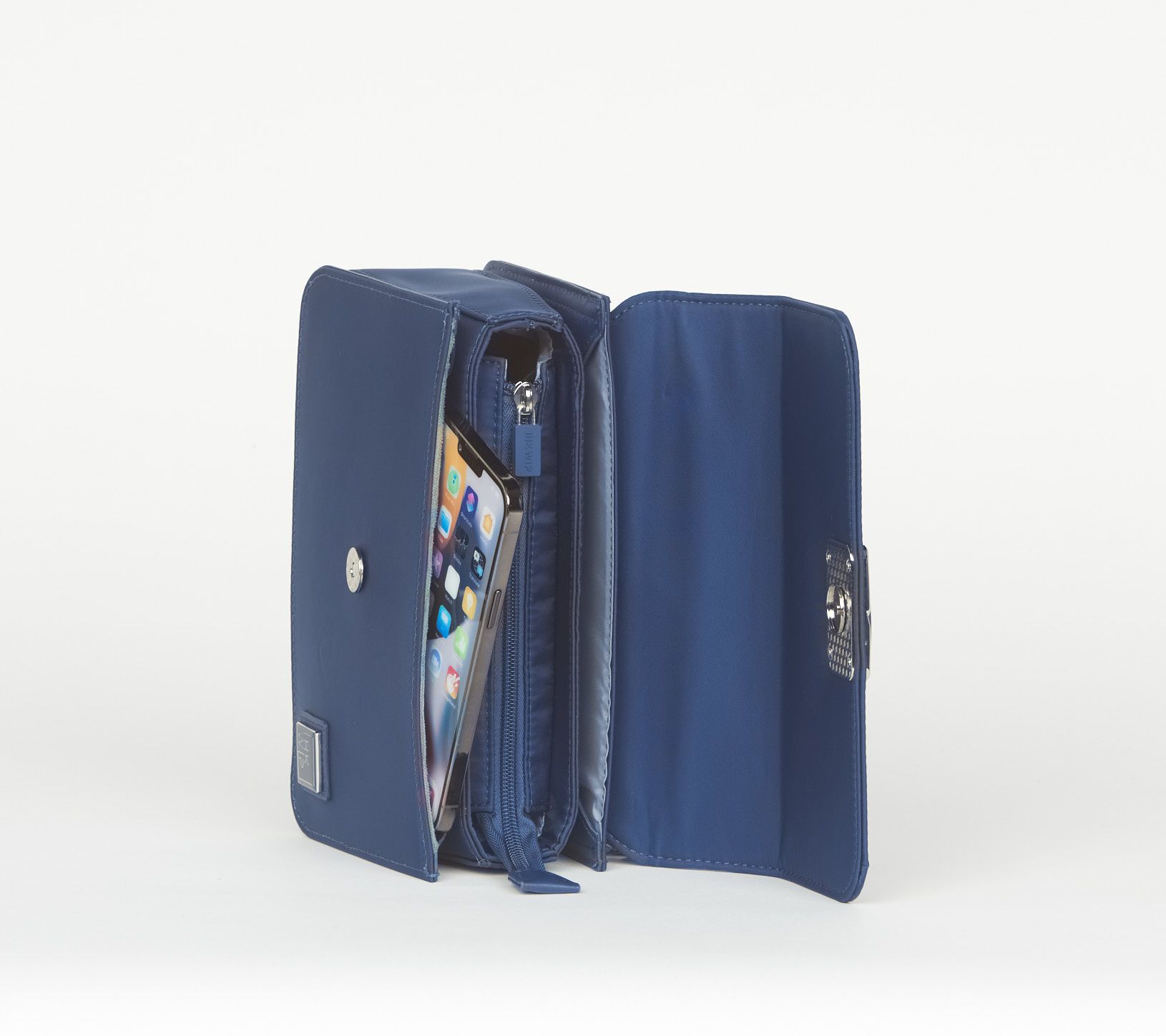 • Light-colored lining; soft-lined phone pocket; RFID wallet with card slots, clear ID window, and bill sleeve; zip pocket; key clip