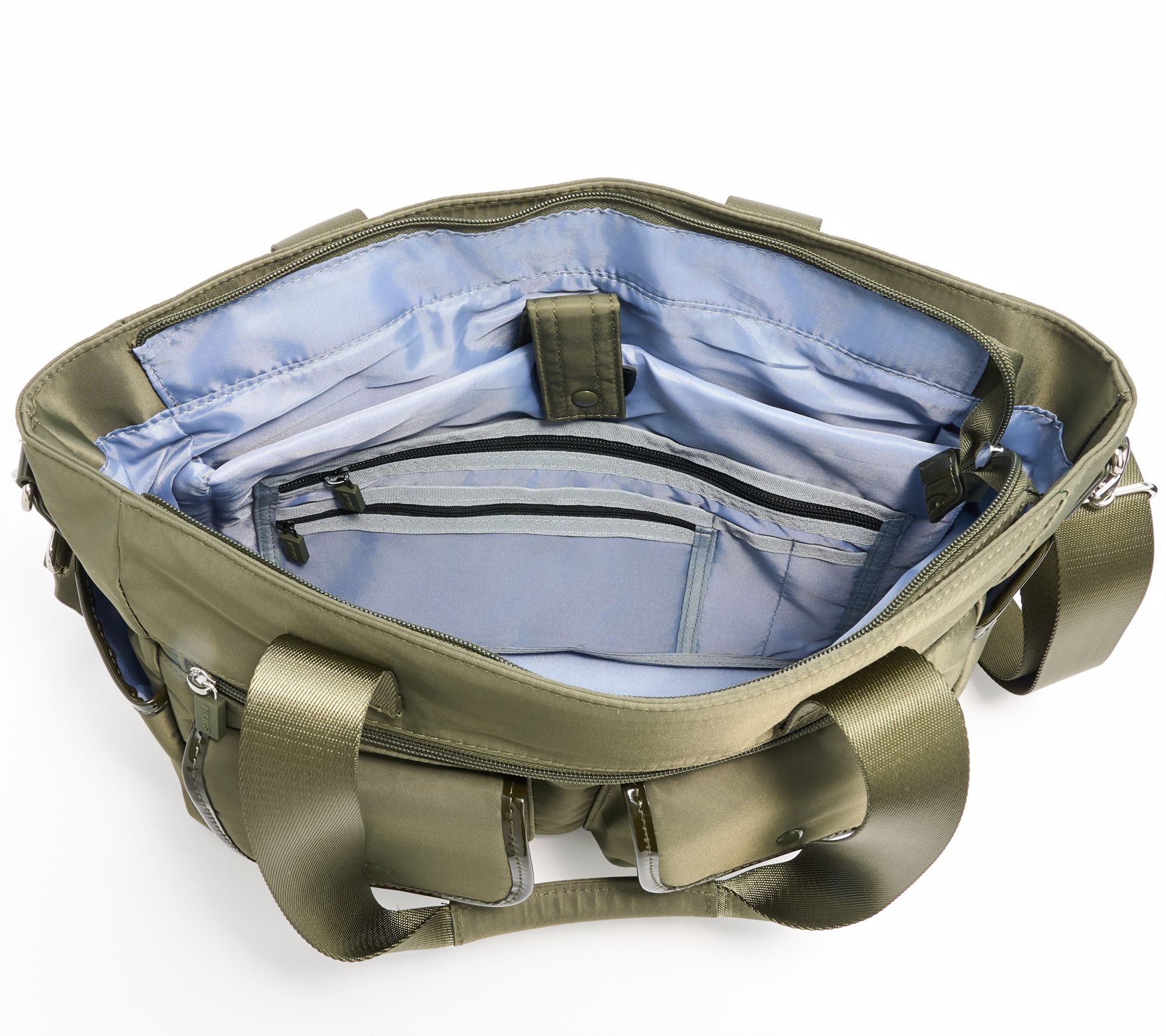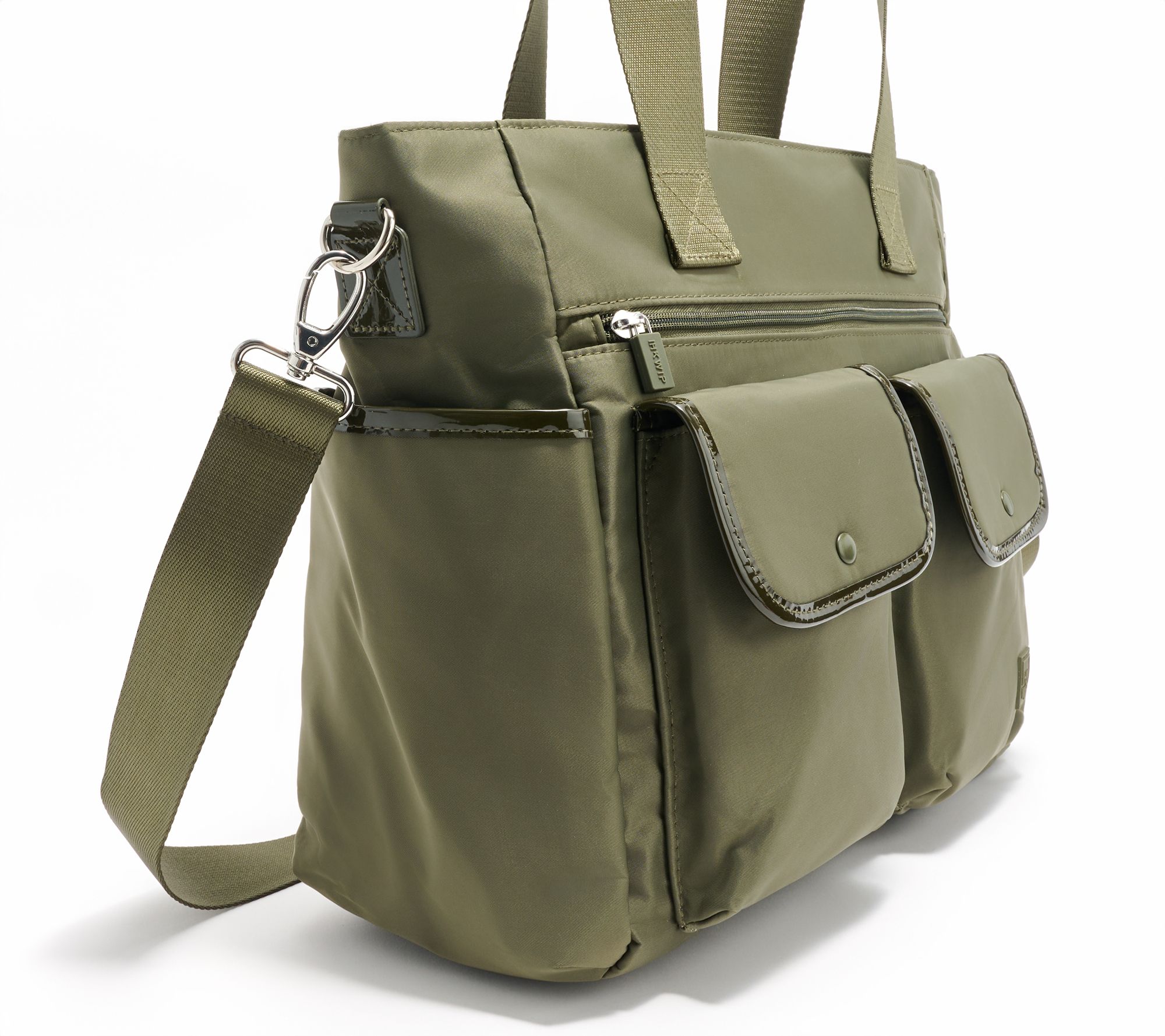 • Removable and adjustable crossbody strap, patent accents, rear trolley sleeve, front cargo pockets with snap detail, purse feet