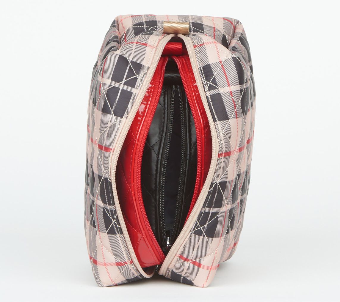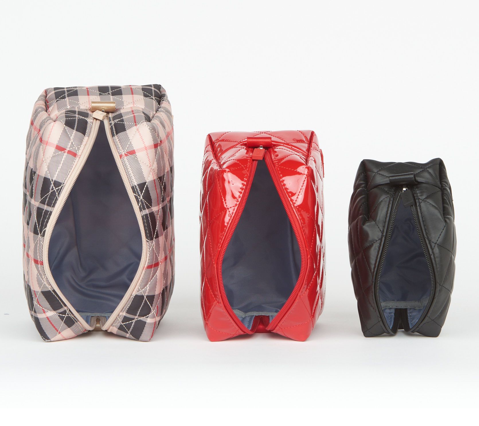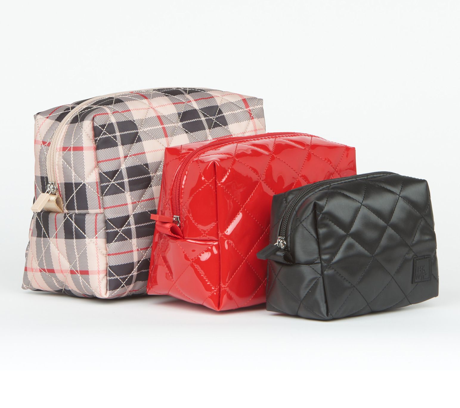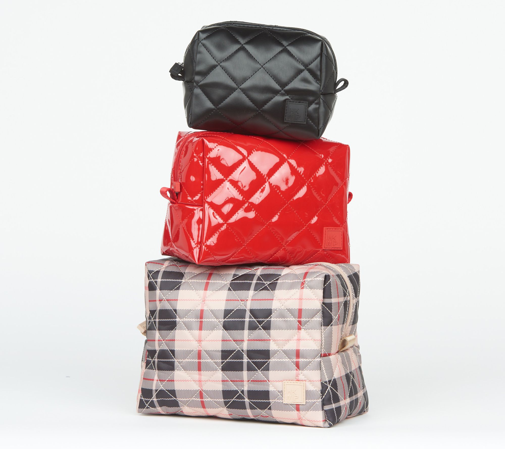 Bravo, Triple Threat! These cutely coordinated cosmetics cases, crafted in luxe, water-repellent fabric, keep your hair, makeup, and skincare essentials smartly organized when you take your show on the road. Not on tour? They nest neatly for storage. From IHKWIP.